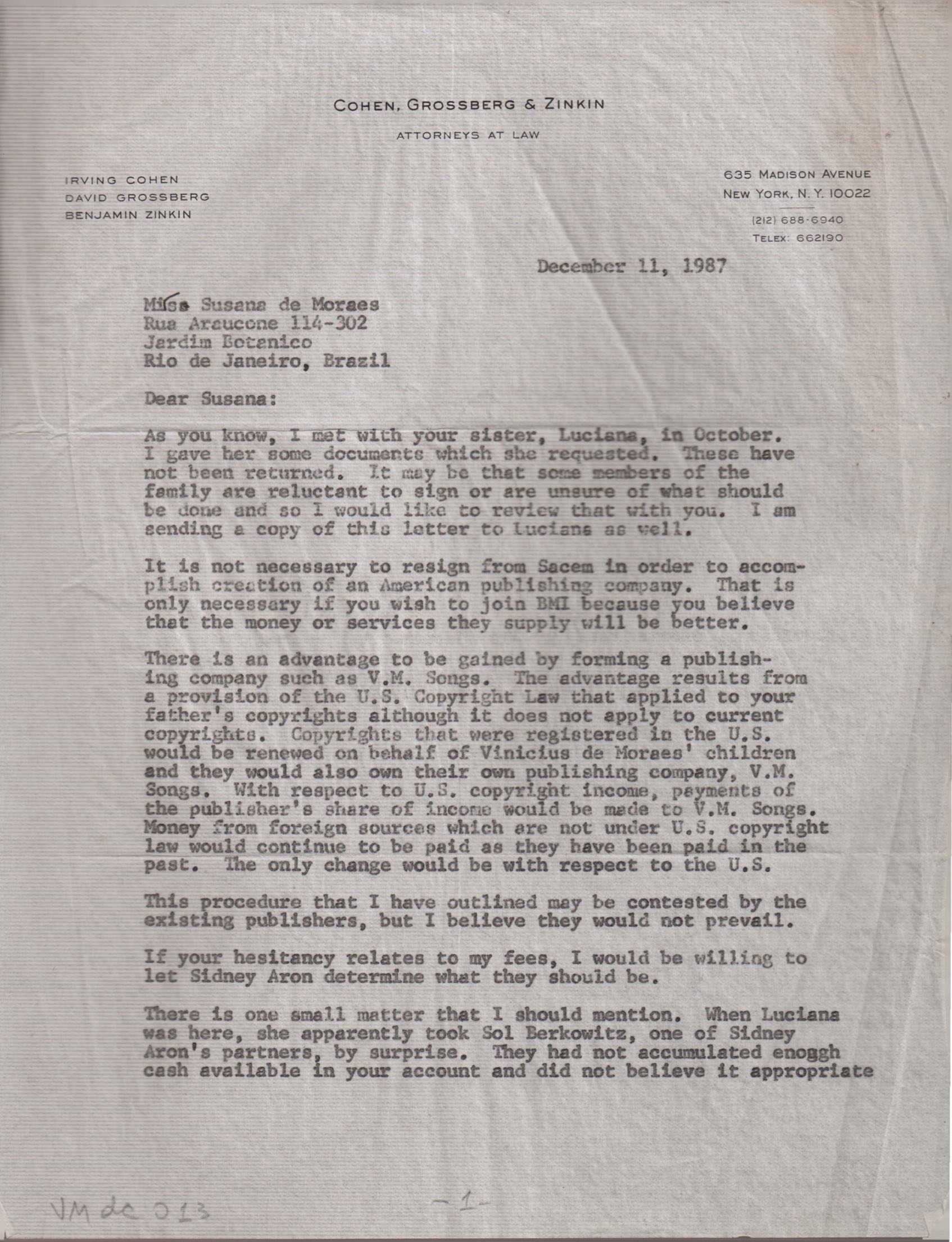 Aconselhamento de abertura de uma companhia de publicação americana, com intenção de proteger por lei a reprodução das músicas de VM em benefício dos seus filhos.