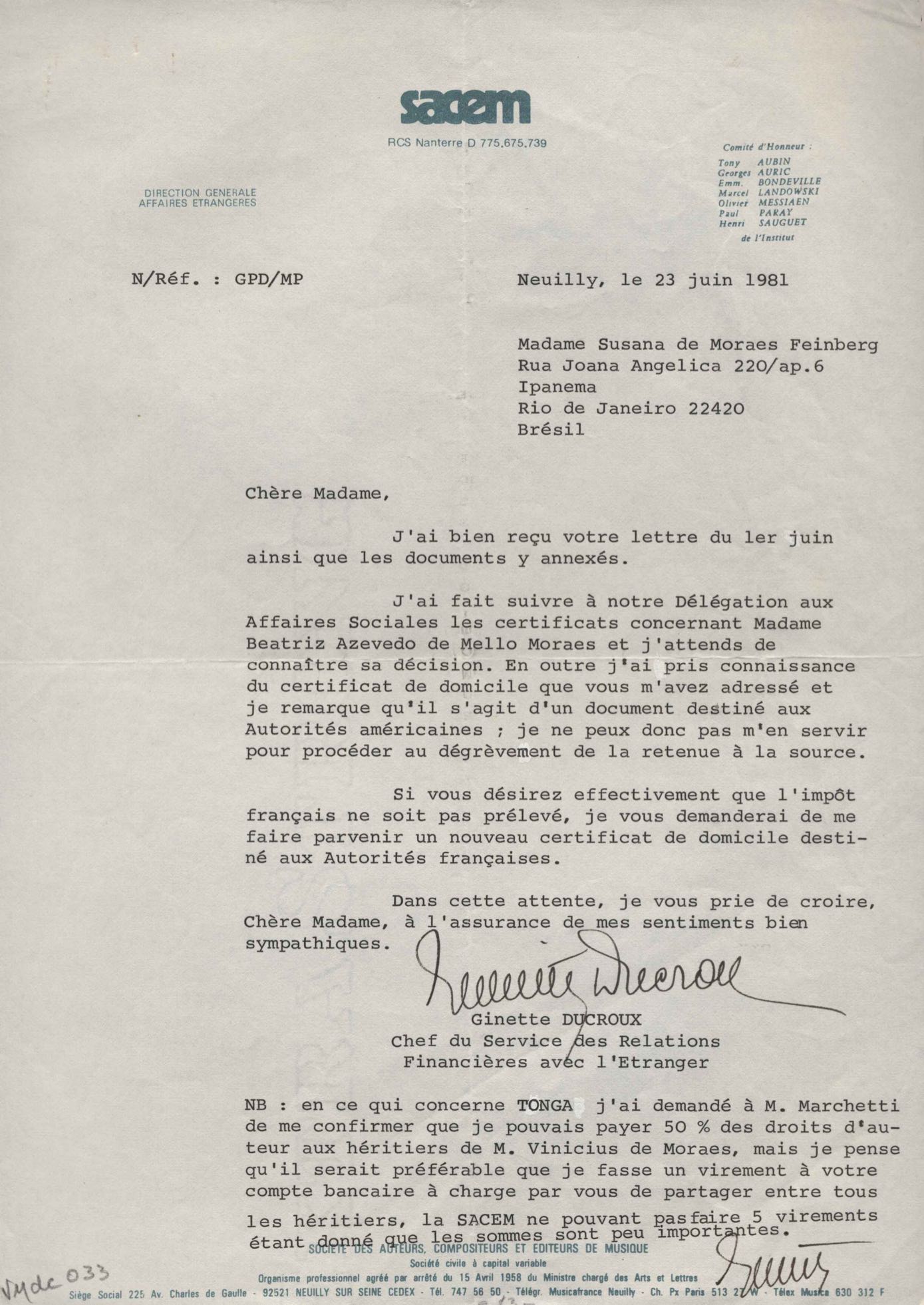 Tradução de Giorgio Bullaty. Cópia de documento sobre renovação dos direitos autorais nos Estados Unidos. Prestação de contas de pagamento de direitos autorais. Formulários da SACEM para pagamento de direitos autorais de "Deixa acontecer" e "Por que será". Lista enviada para Editions Pema Music (títulos de obras). Ficha de Susana de Moraes para a SACEM, 2 nov. 1980. Anotações sobre procedimentos necessários para regularizar a sucessão de VM. Pedido para regularizar a sucessão de VM. Comunicação de pagamento dos direitos autorais à mandatária dos herdeiros, Susana de Moraes. Solicitação de certificados de domicílio de informações sobre estado civil de Beatriz Azevedo de Mello Moraes para fins de pagamento de pensão. Remessa de prestação de conta de pagamento de direitos autorais. Regularização de títulos de obras. Anexo: Ato de adesão aos estatutos da SACEM. Contrato sobre sucessão de VM.