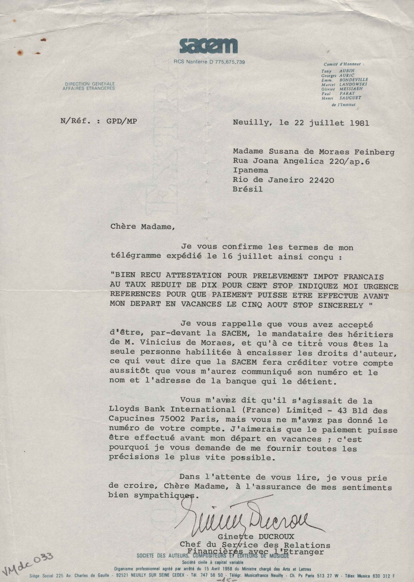 Tradução de Giorgio Bullaty. Cópia de documento sobre renovação dos direitos autorais nos Estados Unidos. Prestação de contas de pagamento de direitos autorais. Formulários da SACEM para pagamento de direitos autorais de "Deixa acontecer" e "Por que será". Lista enviada para Editions Pema Music (títulos de obras). Ficha de Susana de Moraes para a SACEM, 2 nov. 1980. Anotações sobre procedimentos necessários para regularizar a sucessão de VM. Pedido para regularizar a sucessão de VM. Comunicação de pagamento dos direitos autorais à mandatária dos herdeiros, Susana de Moraes. Solicitação de certificados de domicílio de informações sobre estado civil de Beatriz Azevedo de Mello Moraes para fins de pagamento de pensão. Remessa de prestação de conta de pagamento de direitos autorais. Regularização de títulos de obras. Anexo: Ato de adesão aos estatutos da SACEM. Contrato sobre sucessão de VM.