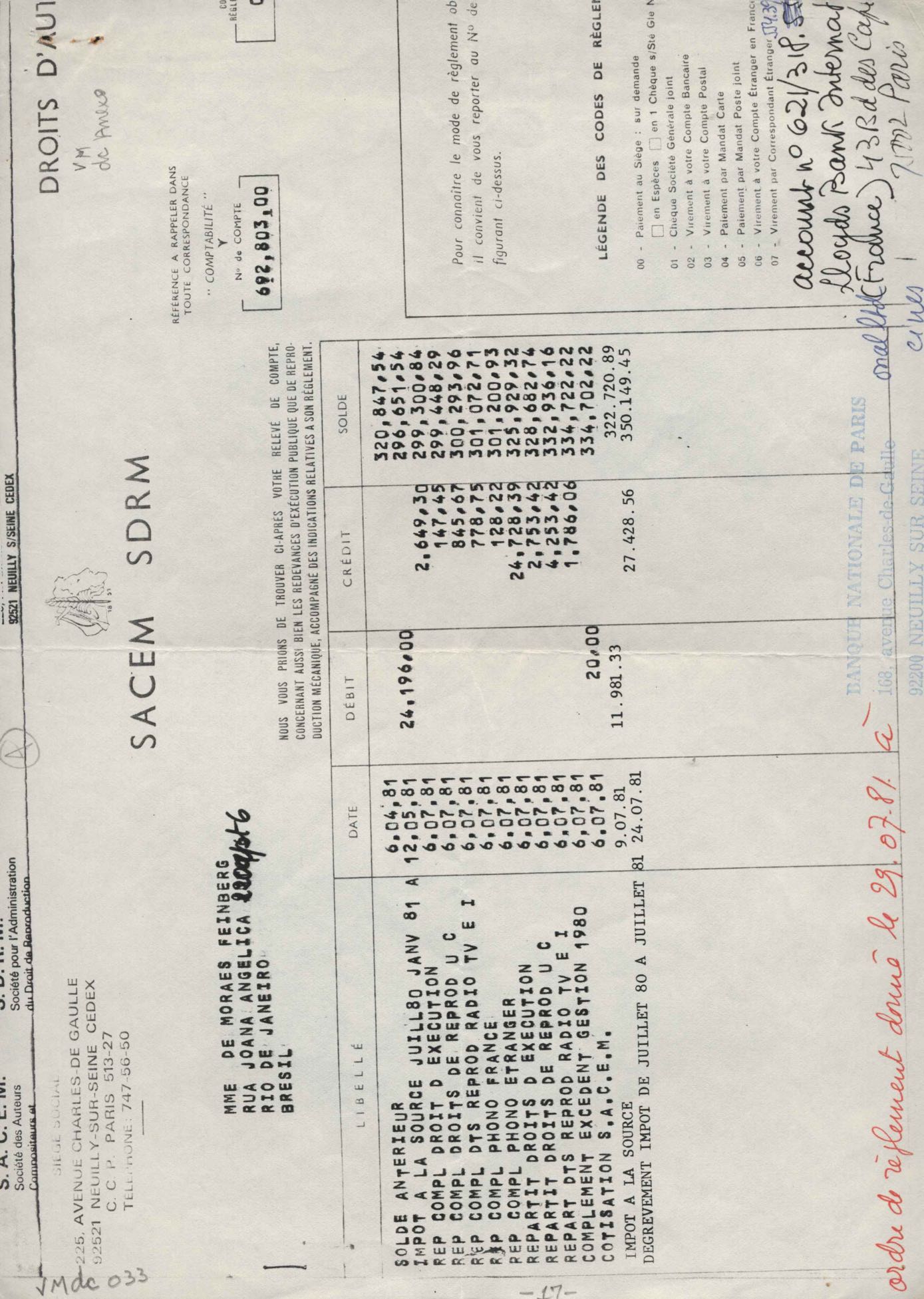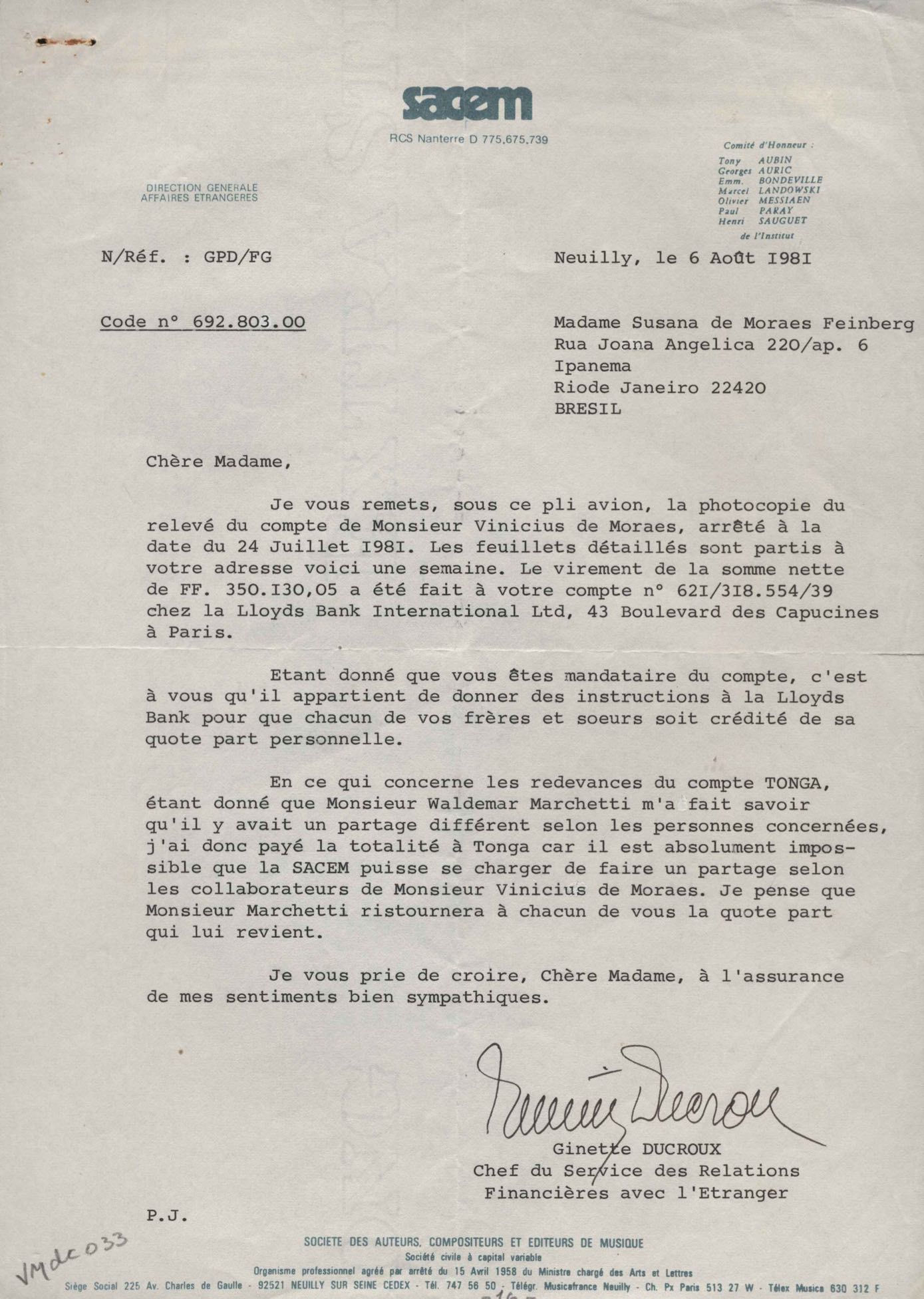 Tradução de Giorgio Bullaty. Cópia de documento sobre renovação dos direitos autorais nos Estados Unidos. Prestação de contas de pagamento de direitos autorais. Formulários da SACEM para pagamento de direitos autorais de "Deixa acontecer" e "Por que será". Lista enviada para Editions Pema Music (títulos de obras). Ficha de Susana de Moraes para a SACEM, 2 nov. 1980. Anotações sobre procedimentos necessários para regularizar a sucessão de VM. Pedido para regularizar a sucessão de VM. Comunicação de pagamento dos direitos autorais à mandatária dos herdeiros, Susana de Moraes. Solicitação de certificados de domicílio de informações sobre estado civil de Beatriz Azevedo de Mello Moraes para fins de pagamento de pensão. Remessa de prestação de conta de pagamento de direitos autorais. Regularização de títulos de obras. Anexo: Ato de adesão aos estatutos da SACEM. Contrato sobre sucessão de VM.