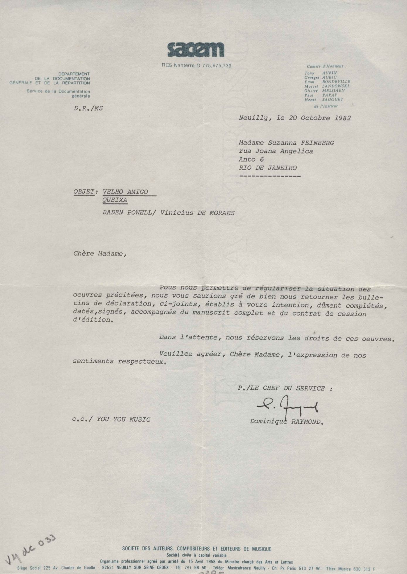 Tradução de Giorgio Bullaty. Cópia de documento sobre renovação dos direitos autorais nos Estados Unidos. Prestação de contas de pagamento de direitos autorais. Formulários da SACEM para pagamento de direitos autorais de "Deixa acontecer" e "Por que será". Lista enviada para Editions Pema Music (títulos de obras). Ficha de Susana de Moraes para a SACEM, 2 nov. 1980. Anotações sobre procedimentos necessários para regularizar a sucessão de VM. Pedido para regularizar a sucessão de VM. Comunicação de pagamento dos direitos autorais à mandatária dos herdeiros, Susana de Moraes. Solicitação de certificados de domicílio de informações sobre estado civil de Beatriz Azevedo de Mello Moraes para fins de pagamento de pensão. Remessa de prestação de conta de pagamento de direitos autorais. Regularização de títulos de obras. Anexo: Ato de adesão aos estatutos da SACEM. Contrato sobre sucessão de VM.