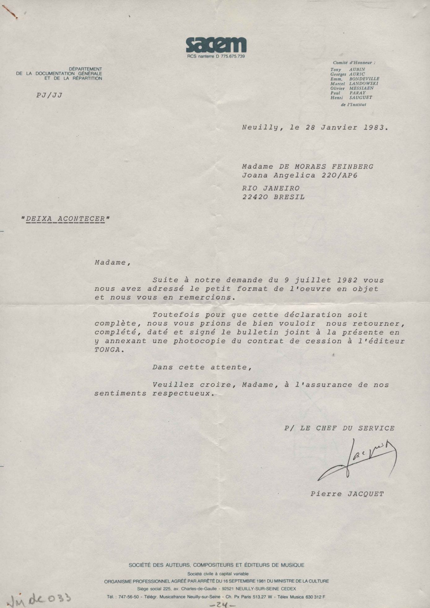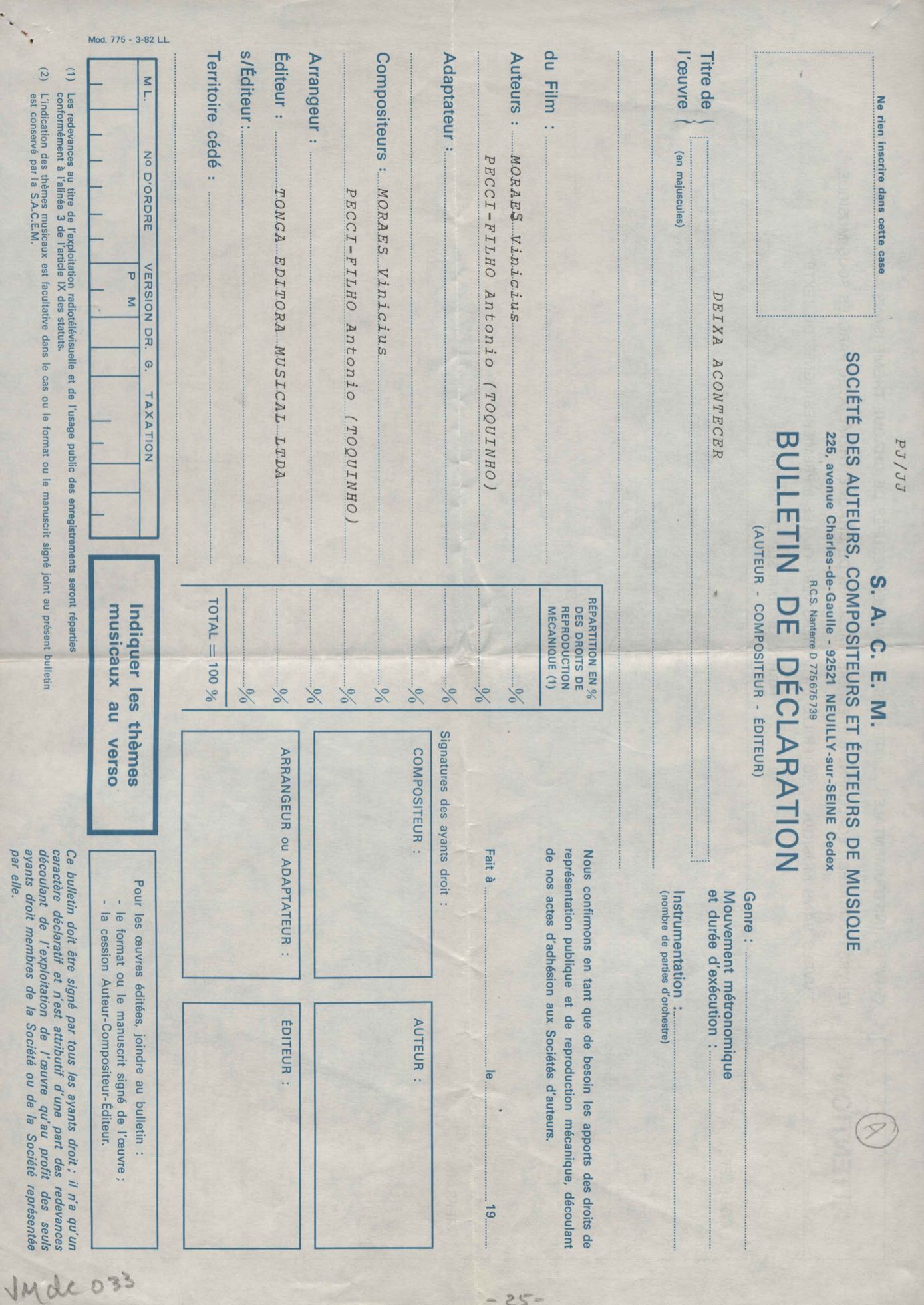 Tradução de Giorgio Bullaty. Cópia de documento sobre renovação dos direitos autorais nos Estados Unidos. Prestação de contas de pagamento de direitos autorais. Formulários da SACEM para pagamento de direitos autorais de "Deixa acontecer" e "Por que será". Lista enviada para Editions Pema Music (títulos de obras). Ficha de Susana de Moraes para a SACEM, 2 nov. 1980. Anotações sobre procedimentos necessários para regularizar a sucessão de VM. Pedido para regularizar a sucessão de VM. Comunicação de pagamento dos direitos autorais à mandatária dos herdeiros, Susana de Moraes. Solicitação de certificados de domicílio de informações sobre estado civil de Beatriz Azevedo de Mello Moraes para fins de pagamento de pensão. Remessa de prestação de conta de pagamento de direitos autorais. Regularização de títulos de obras. Anexo: Ato de adesão aos estatutos da SACEM. Contrato sobre sucessão de VM.