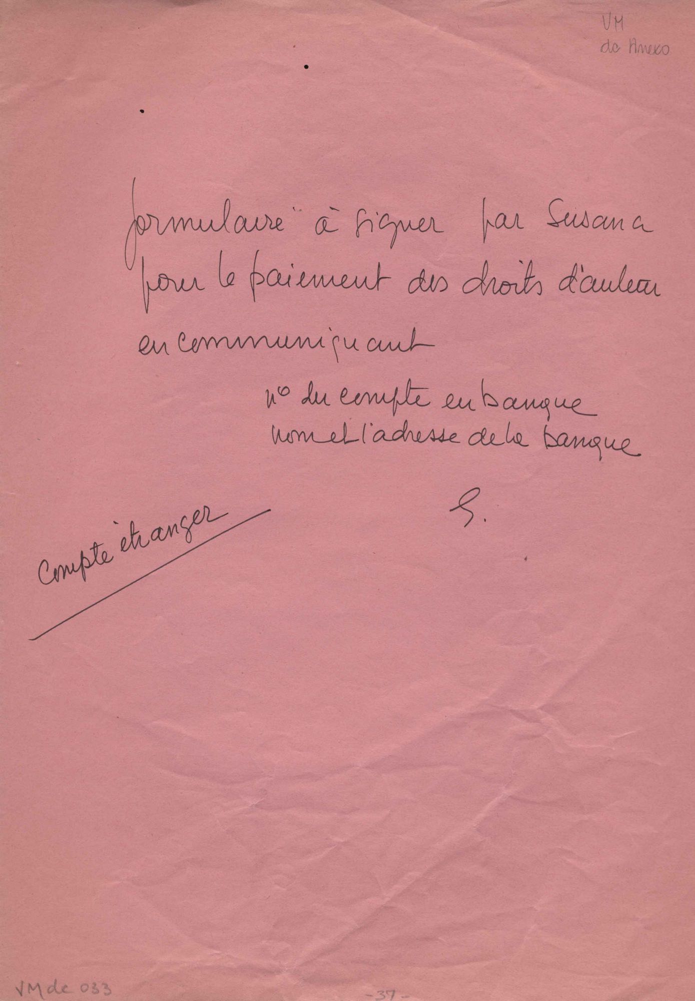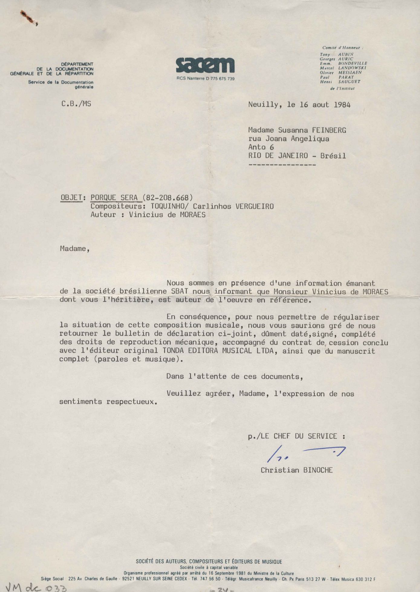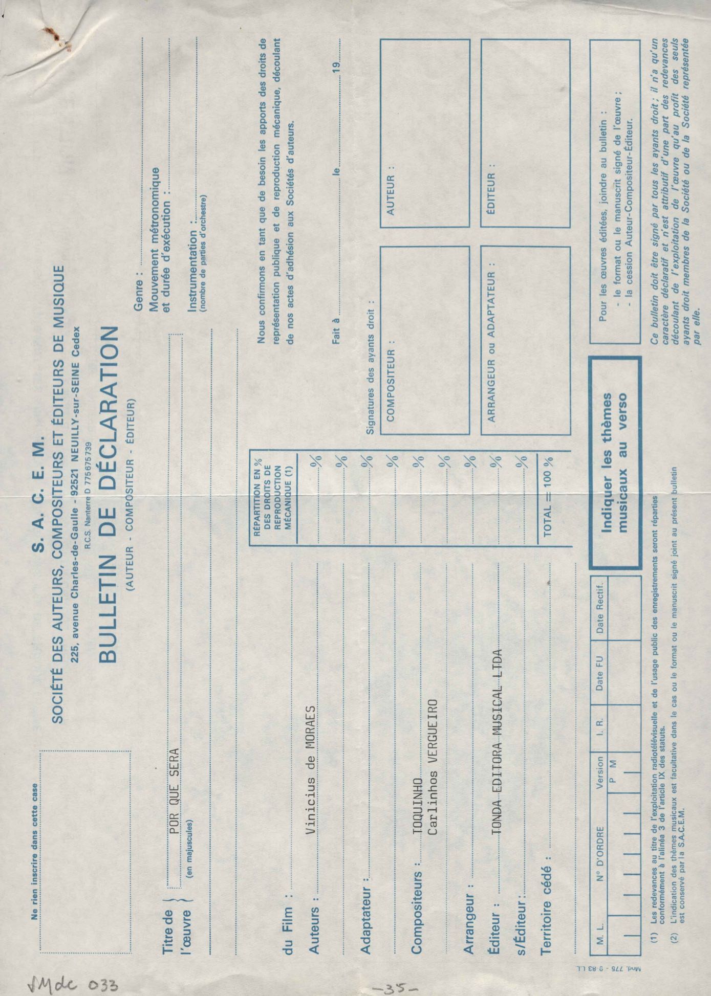 Tradução de Giorgio Bullaty. Cópia de documento sobre renovação dos direitos autorais nos Estados Unidos. Prestação de contas de pagamento de direitos autorais. Formulários da SACEM para pagamento de direitos autorais de "Deixa acontecer" e "Por que será". Lista enviada para Editions Pema Music (títulos de obras). Ficha de Susana de Moraes para a SACEM, 2 nov. 1980. Anotações sobre procedimentos necessários para regularizar a sucessão de VM. Pedido para regularizar a sucessão de VM. Comunicação de pagamento dos direitos autorais à mandatária dos herdeiros, Susana de Moraes. Solicitação de certificados de domicílio de informações sobre estado civil de Beatriz Azevedo de Mello Moraes para fins de pagamento de pensão. Remessa de prestação de conta de pagamento de direitos autorais. Regularização de títulos de obras. Anexo: Ato de adesão aos estatutos da SACEM. Contrato sobre sucessão de VM.