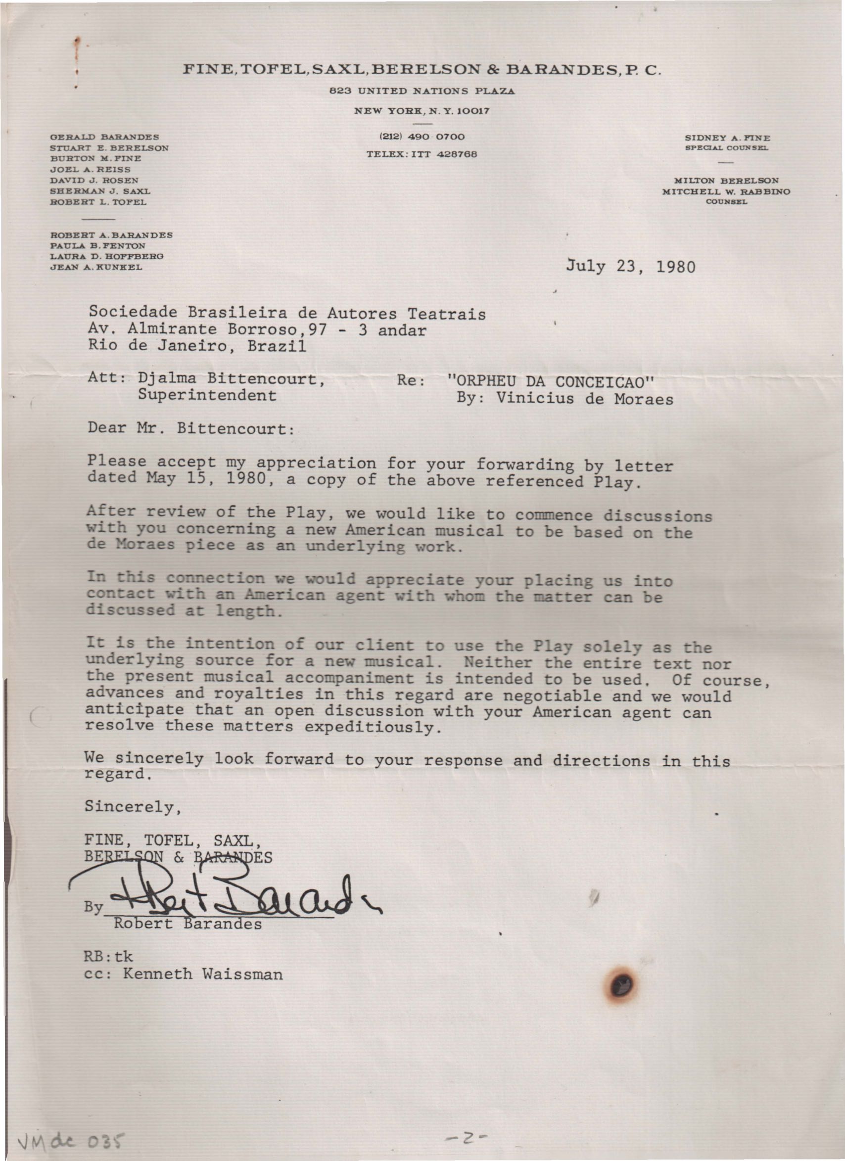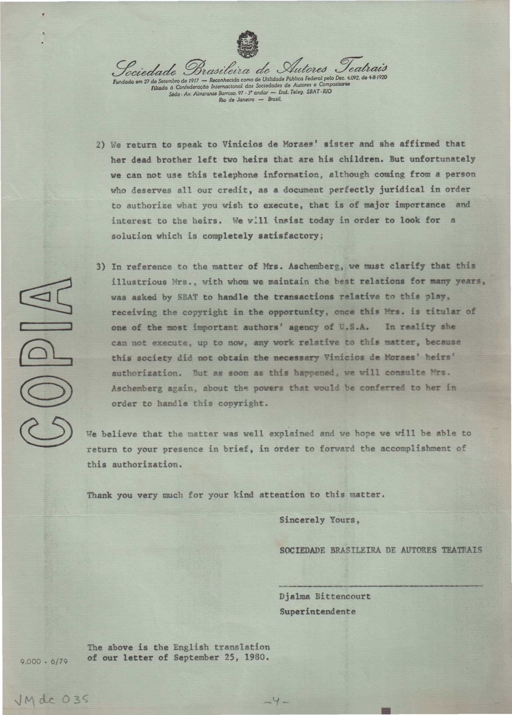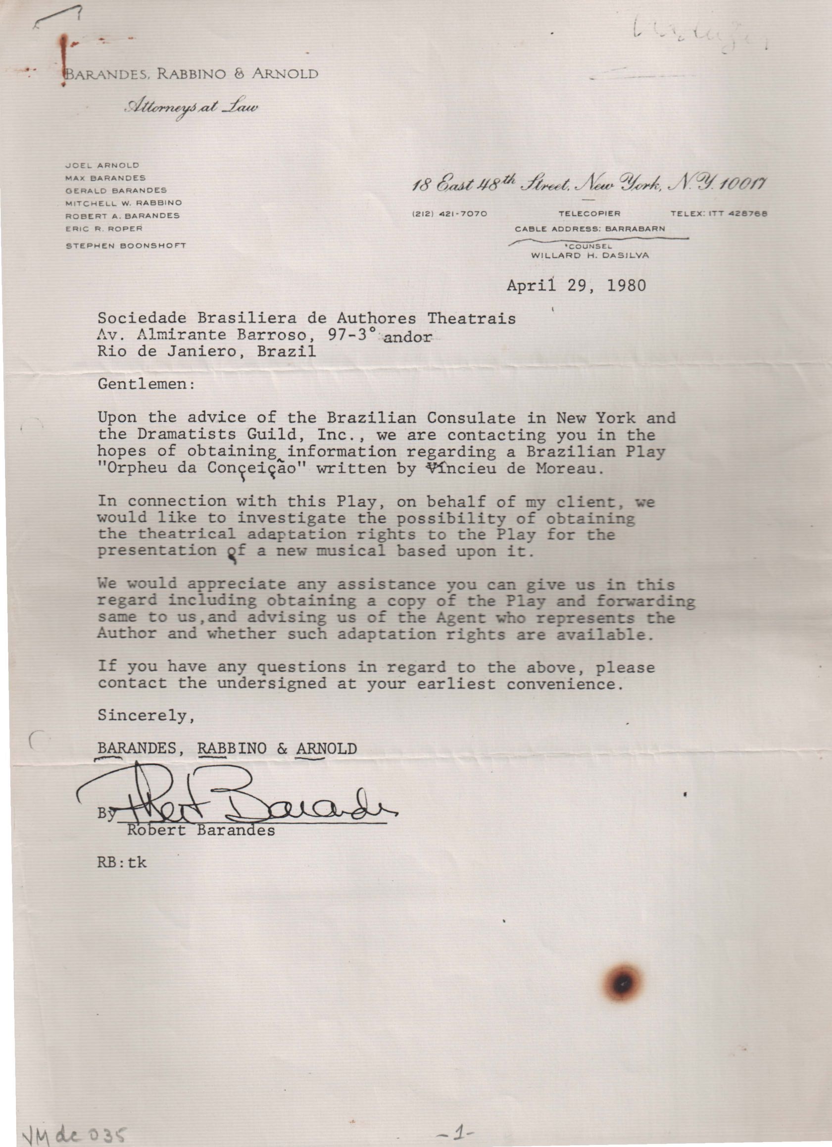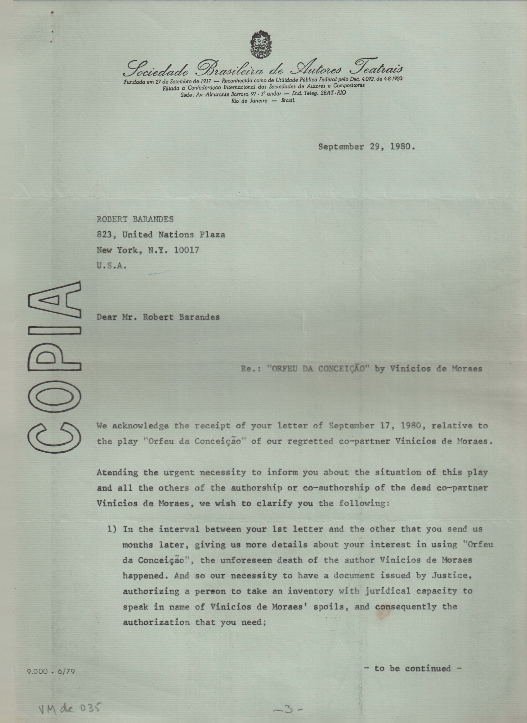 Cartas (3) entre a Sociedade Brasileira de Autores Teatrais (SBAT) e Barandes, Rabino e Arnold