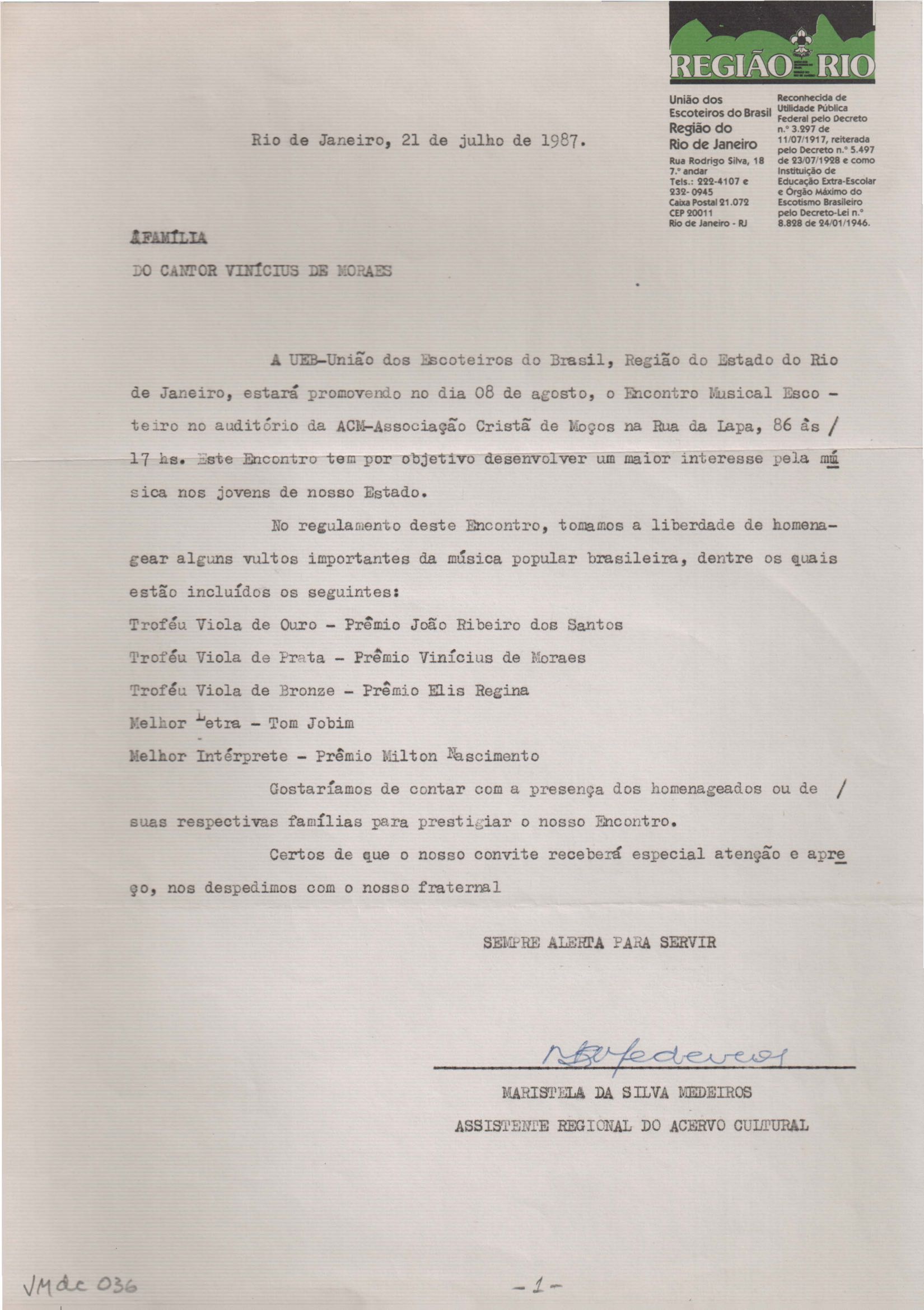 Convite para o "Encontro Musical de Escoteiro" promovido pela entidade, no qual VM será um dos homenageados.