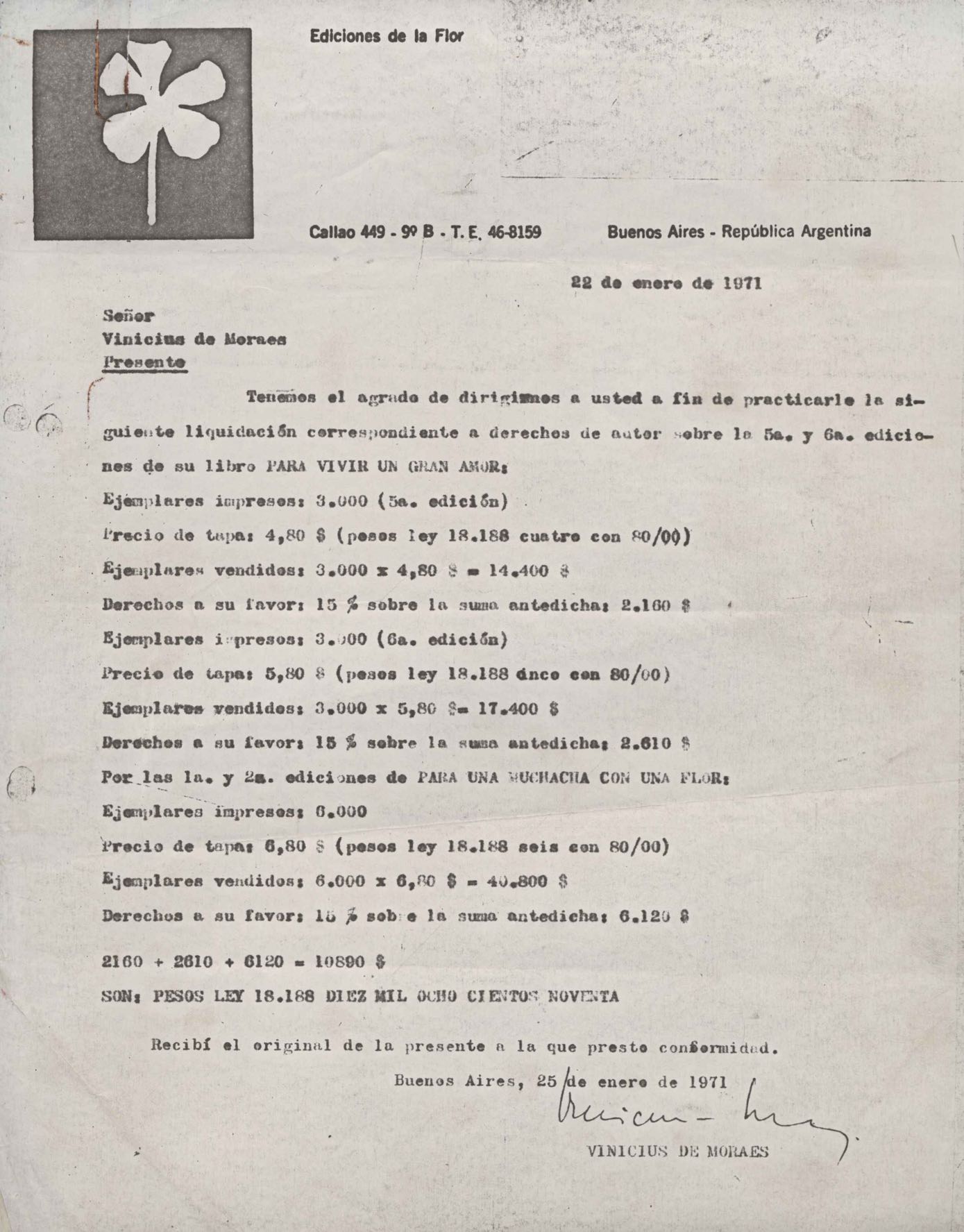 Envio de relação dos direitos autorais sobre as edições do livro Para viver um grande amor, de VM.
