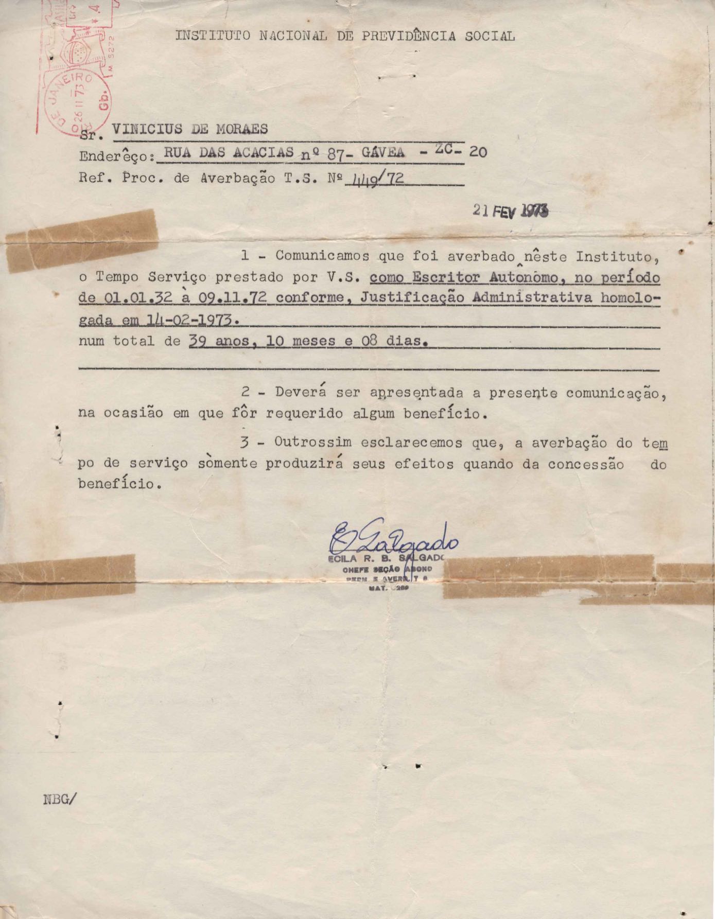 Solicitação de comparecimento ao Instituto Nacional de Previdência Social (INPS), para tratar de assunto de interesse de VM. Comunicação do tempo de serviço averbado no Instituto, como escritor autônomo.