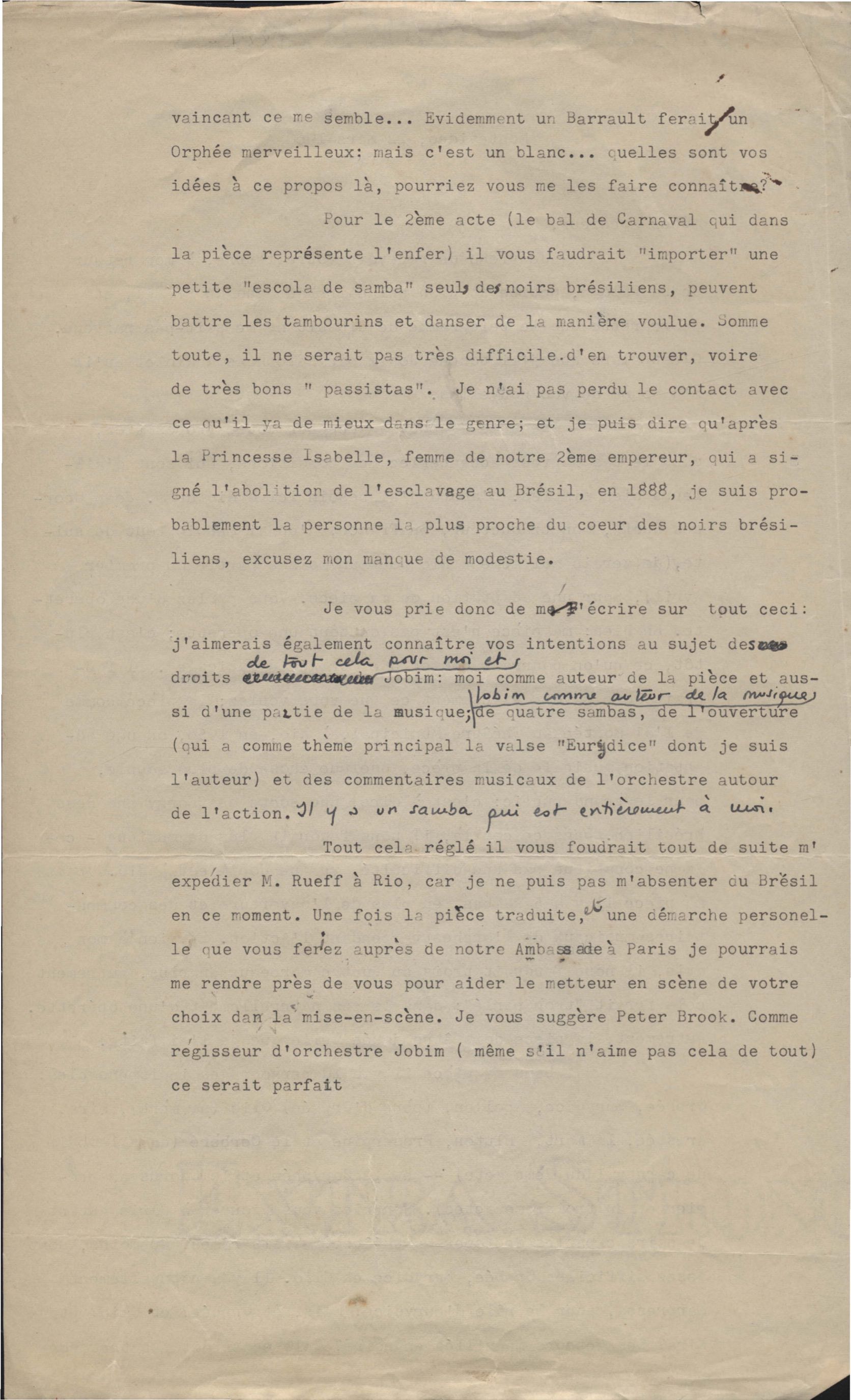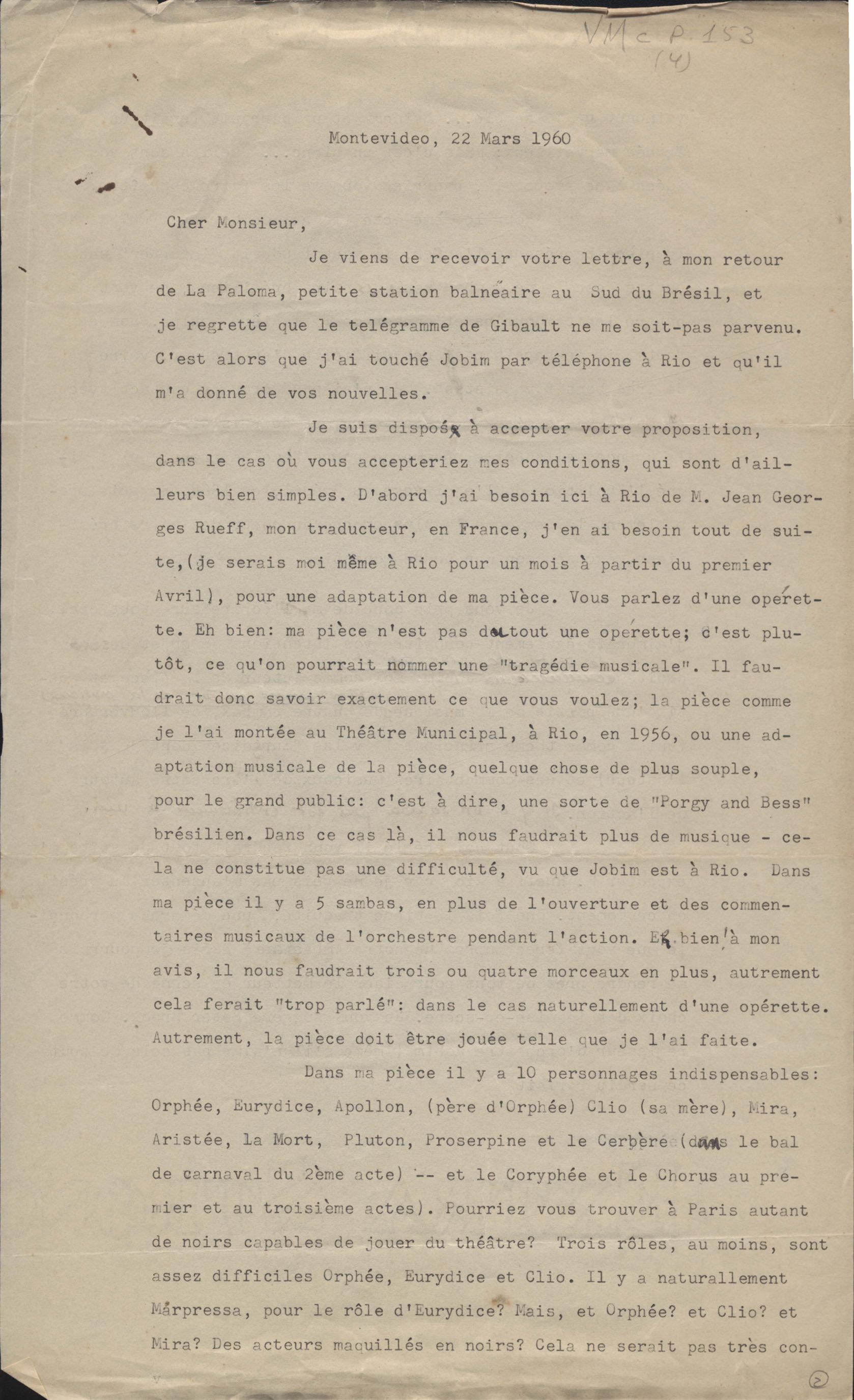 Condições para adaptação e encenação da peça Orfeu da Conceição em Paris. Anexos: 1. Outra versão da carta; 2. Carta de Pierre de Clercq a [?].