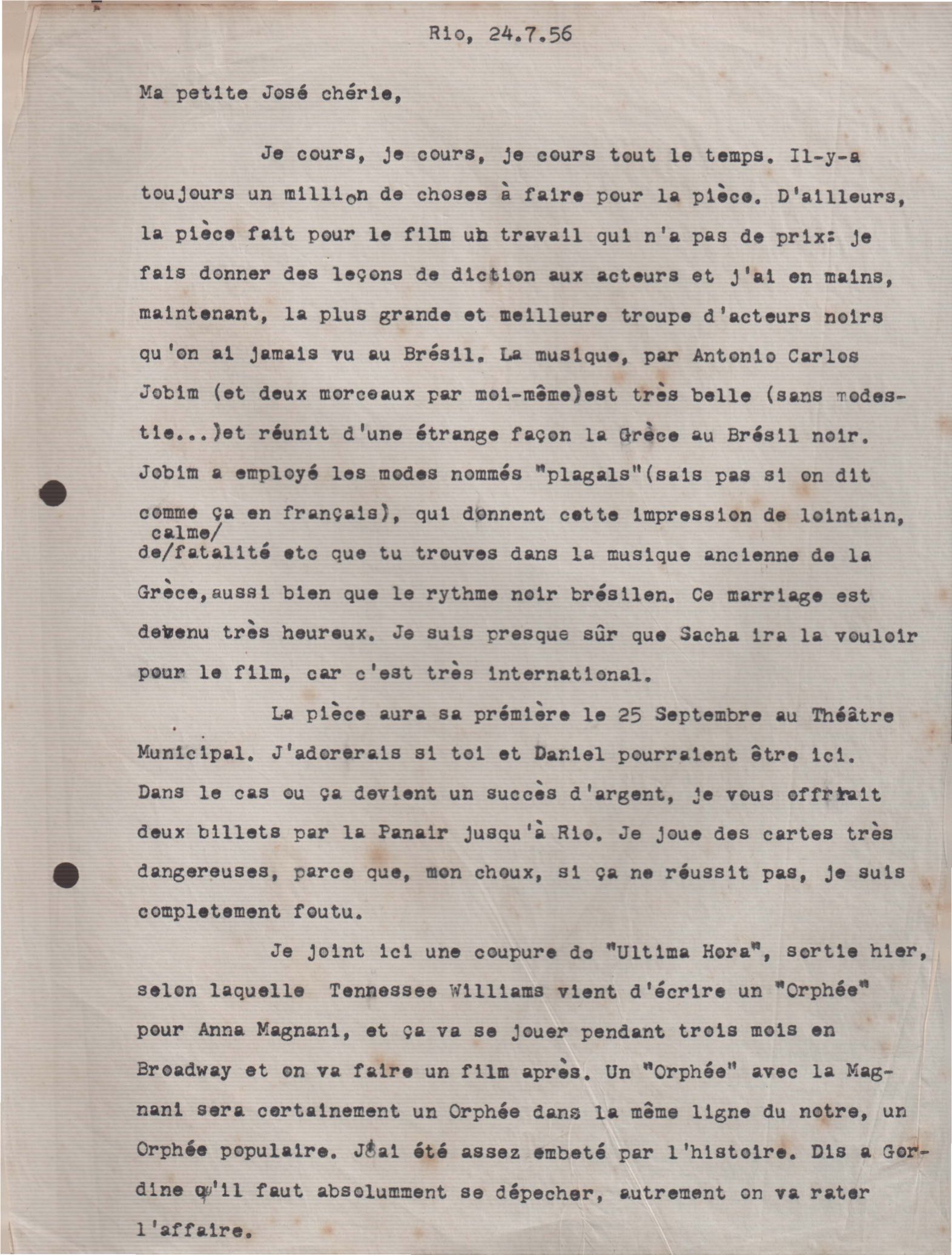 Informações sobre a montagem da peça Orfeu da Conceição. Notícias sobre a vida familiar. Informações sobre transações bancárias nos Estados Unidos e na Europa.