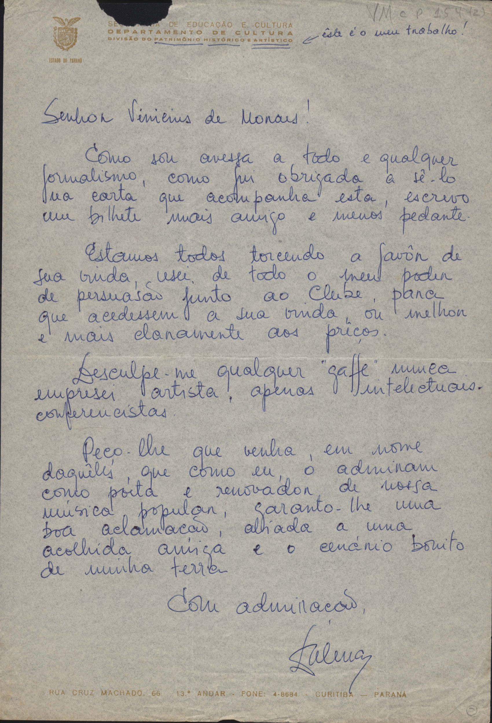 Proposta para VM, em companhia de Carlos Lira e de uma cantora, fazer show no clube.