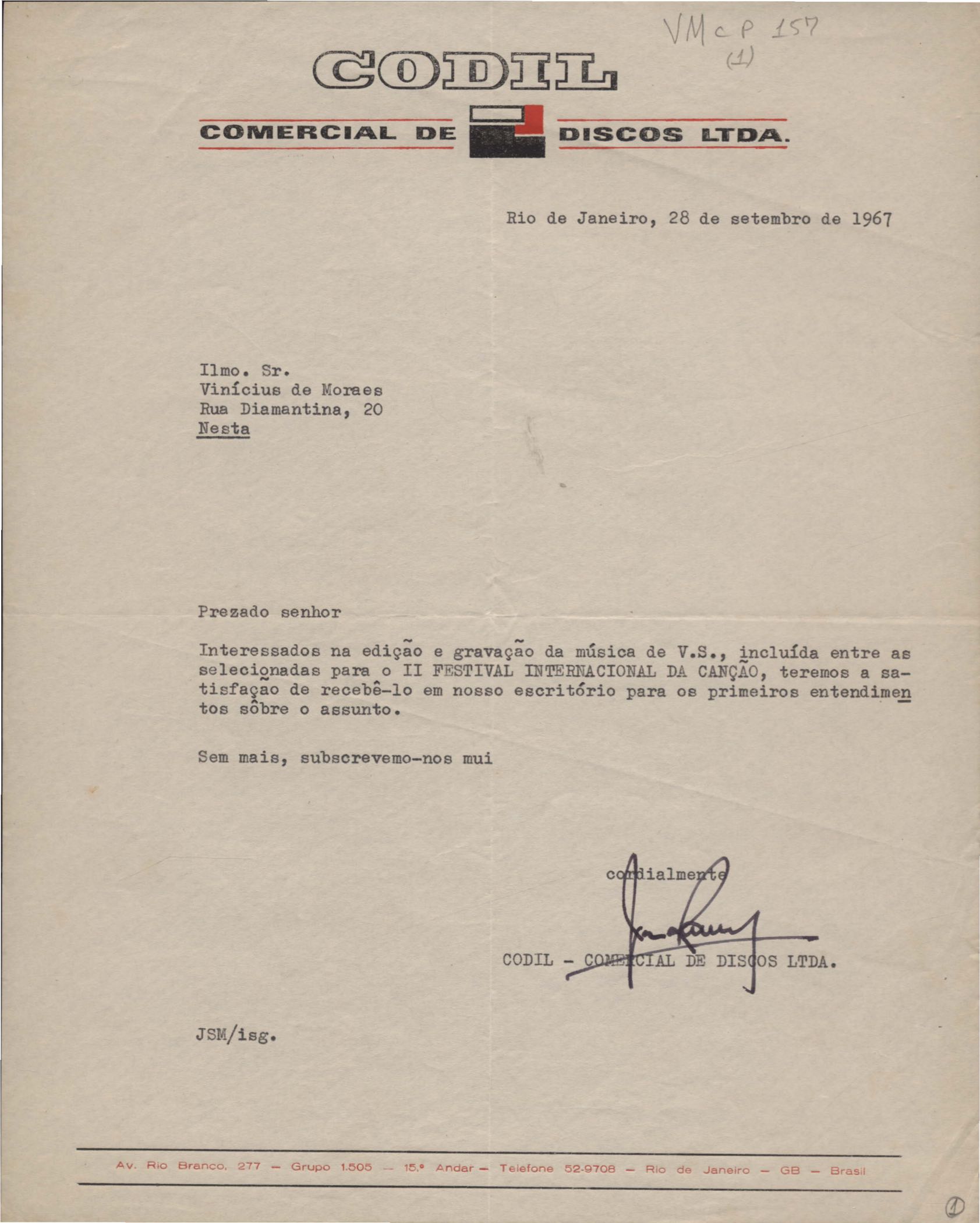 Interesse em editar e gravar a música de VM selecionada para o II Festival Internacional da Canção.