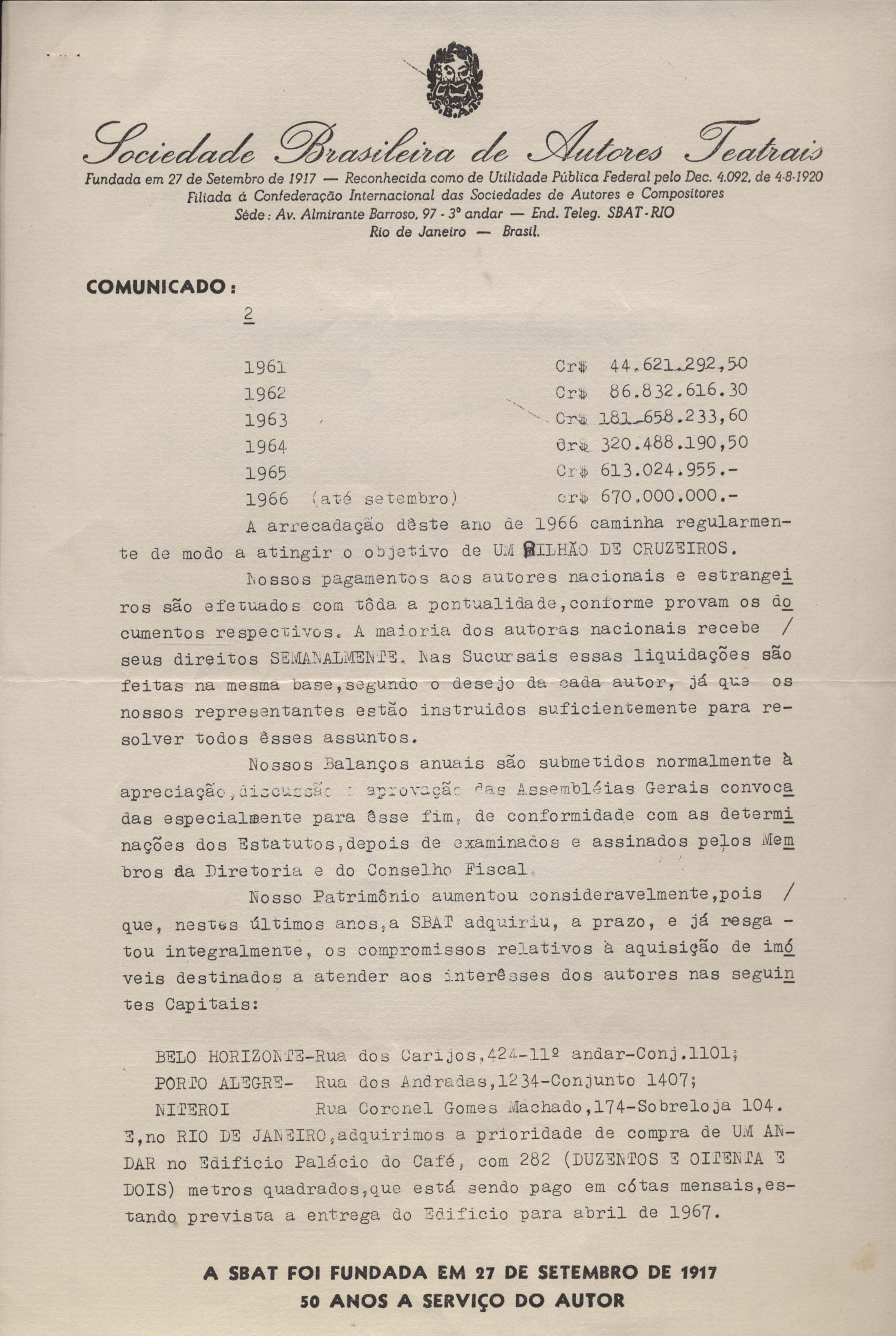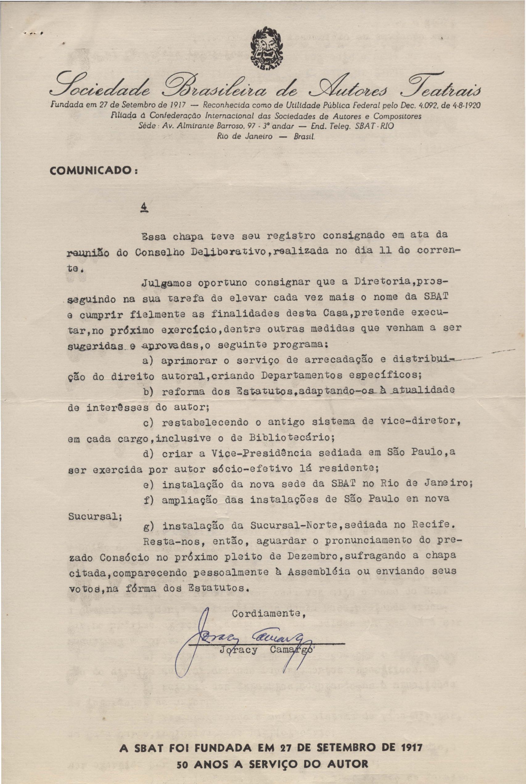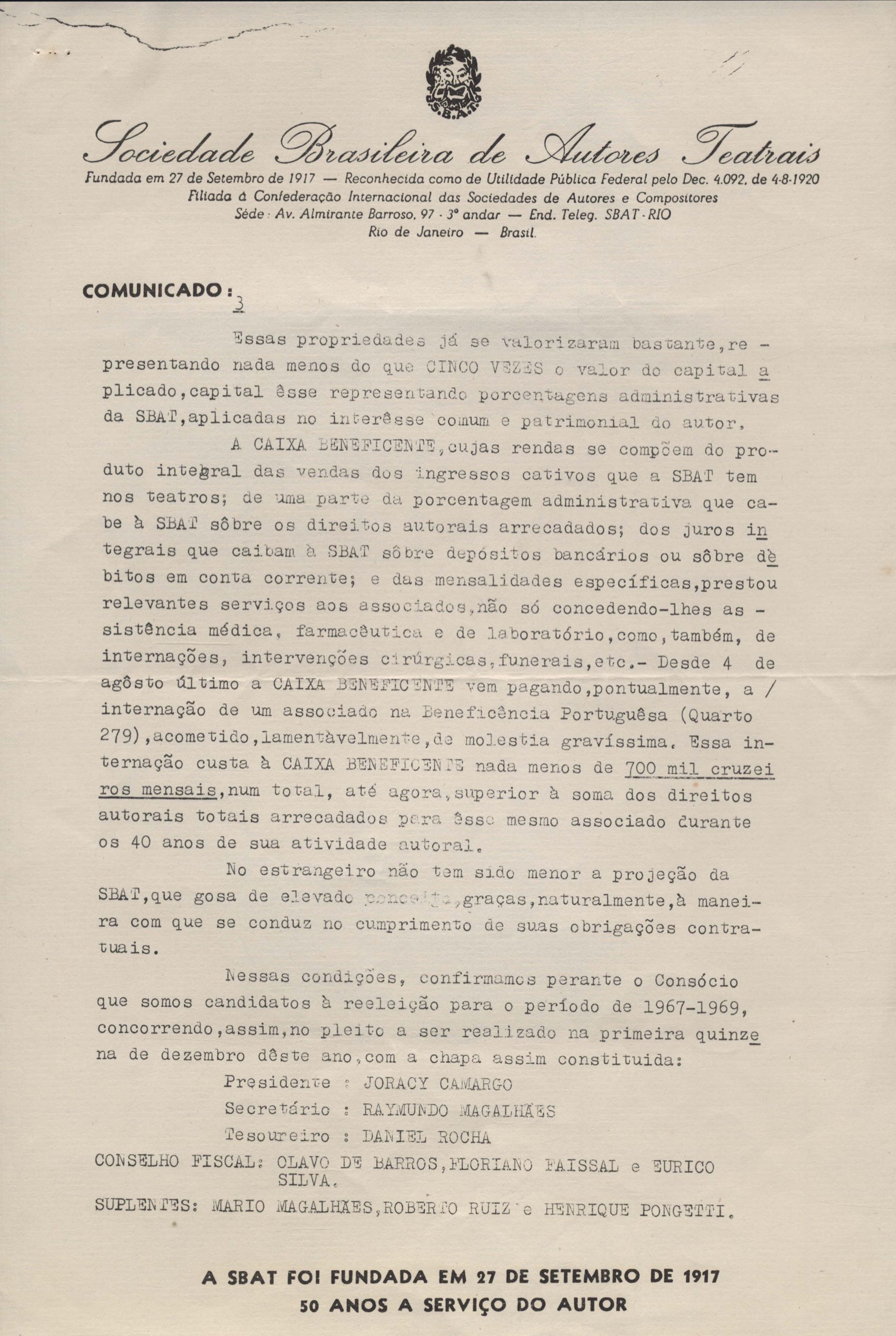 Informação sobre candidatura à reeleição para o período de 1967 a 1969. Interesse da televisão paulista em apresentar Orfeu da Conceição.