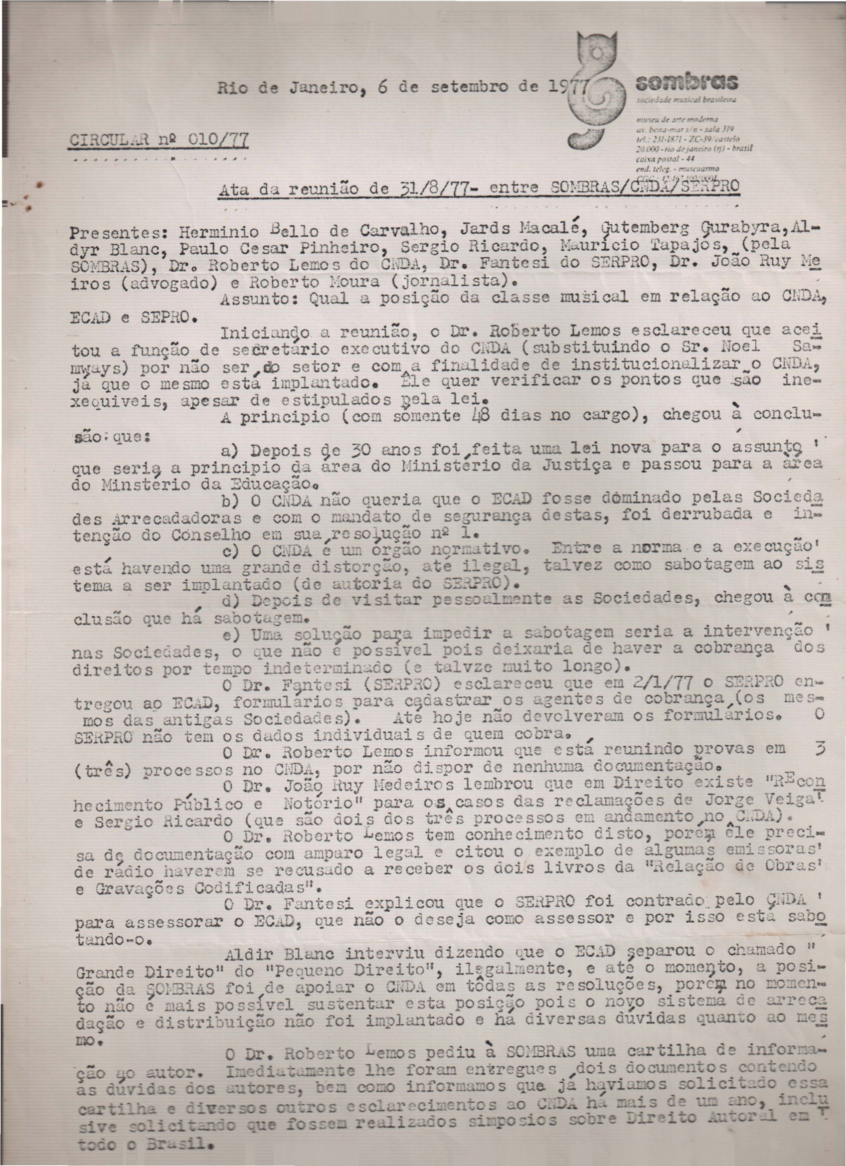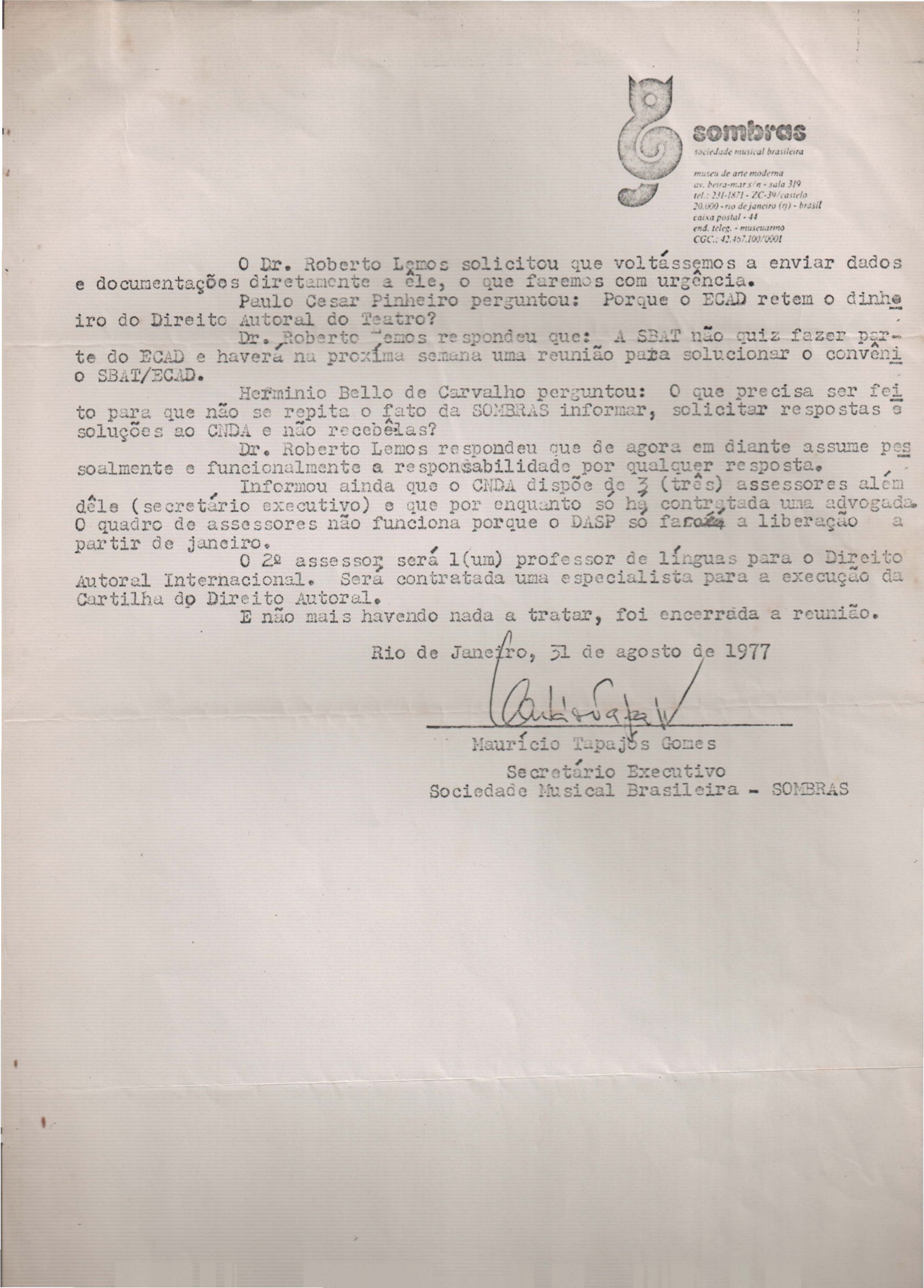 Envio de cópia da Ata da Reunião de 31 de agosto de 1977, que aconteceu entre Sombrás/CNSA/SEPRO, assinada por Maurício Tapajós Gomes e transcrita na circular nº 010/77. Considerações a respeito da posição da classe musical em relação ao CNDA, ECAD e SEPRO.