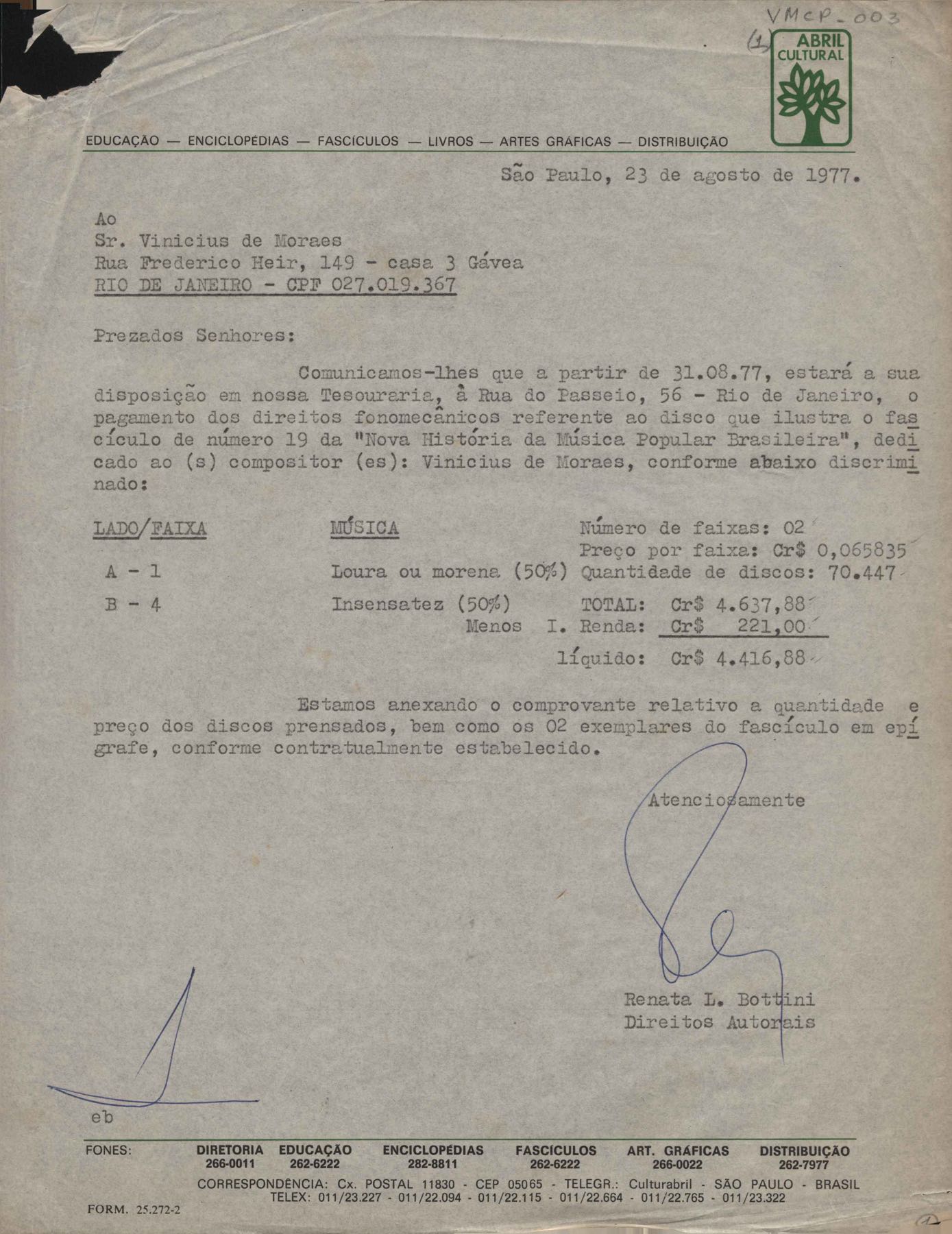 Pagamento de direitos fonomecânicos relativos à inclusão de músicas de VM no disco que ilustra o fascículo a ele dedicado da Nova história da música popular brasileira.