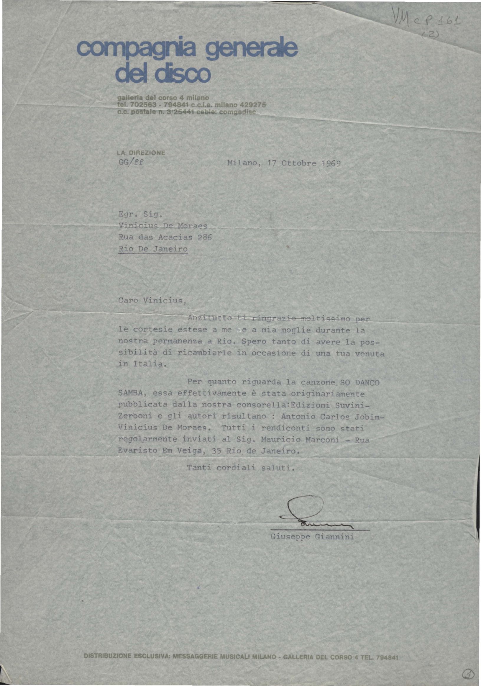 Informações de que a música "Só danço o samba" foi originalmente editada pela Edizioni Suvini-Zerboni, com registro de autoria para VM e Tom Jobim, e que os pagamentos de direitos autorais têm sido enviados para Mauricio Marconi. Intenção de editar outra música de VM, em razão do sucesso obtido com "Só danço o samba".