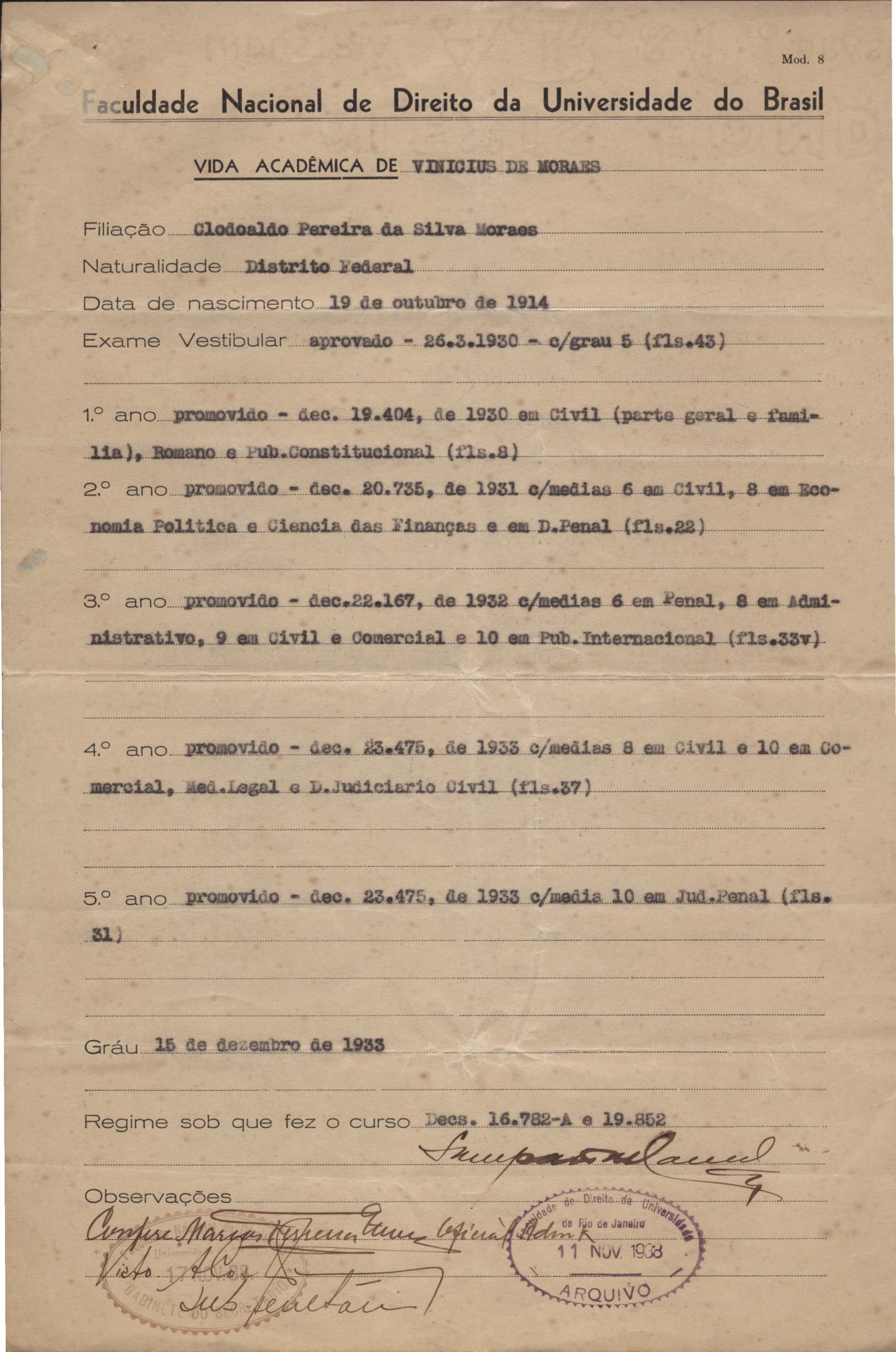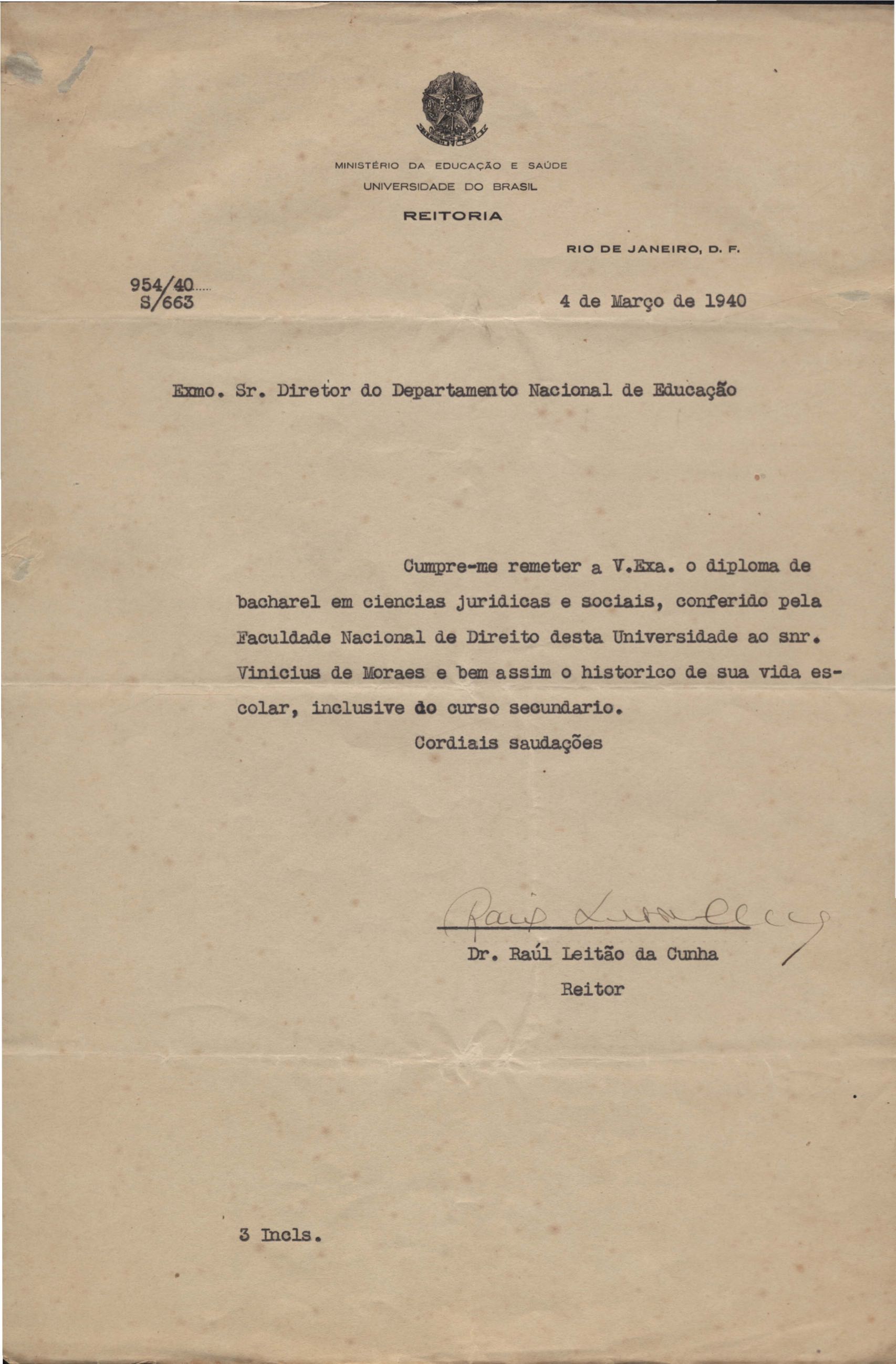 Não consta do documento o mencionado diploma de Bacharel em Ciências Jurídicas e Sociais de VM, assinado por Dr. Raul Leitão da Cunha, reitor.