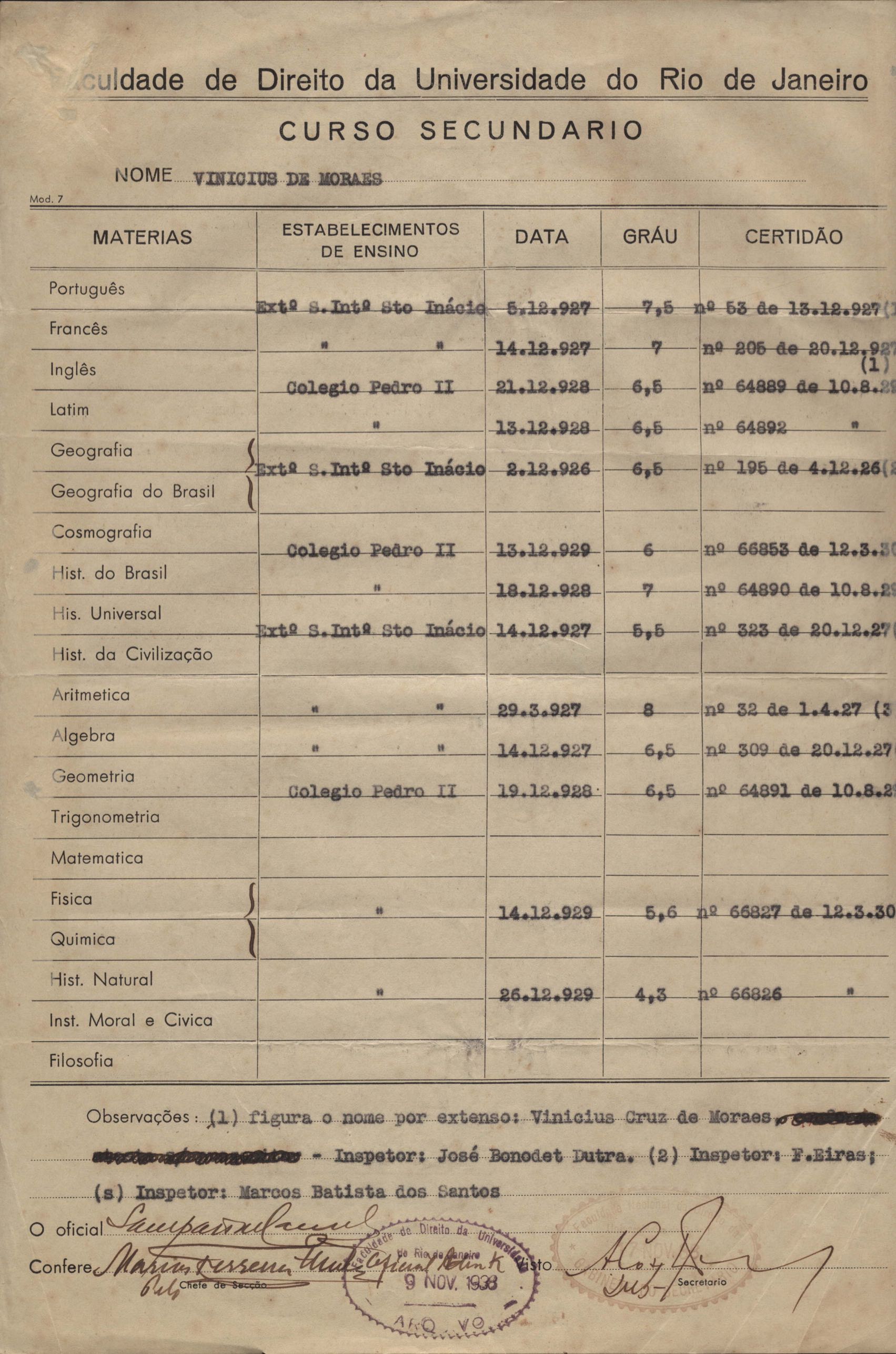 Envio de diploma de Bacharel em Ciências Jurídicas e Sociais, e histórico escolar do curso superior e do curso secundário de VM.