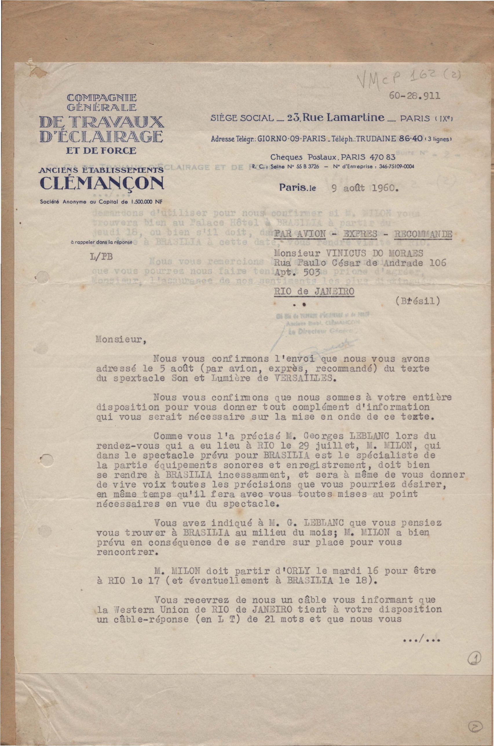 Negociações para a montagem do espetáculo "Sinfonia da Alvorada", realizado por ocasião da inauguração de Brasília.