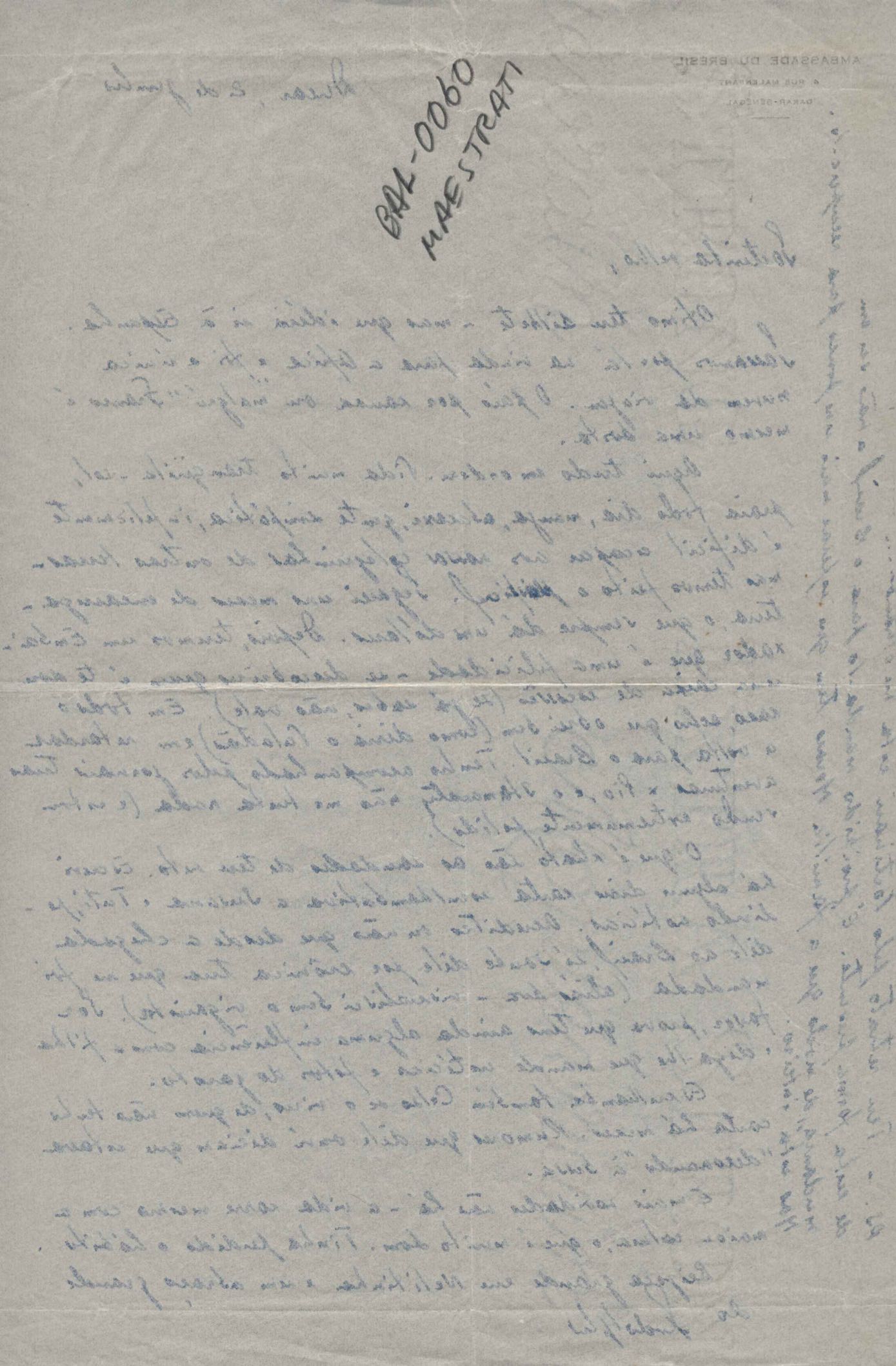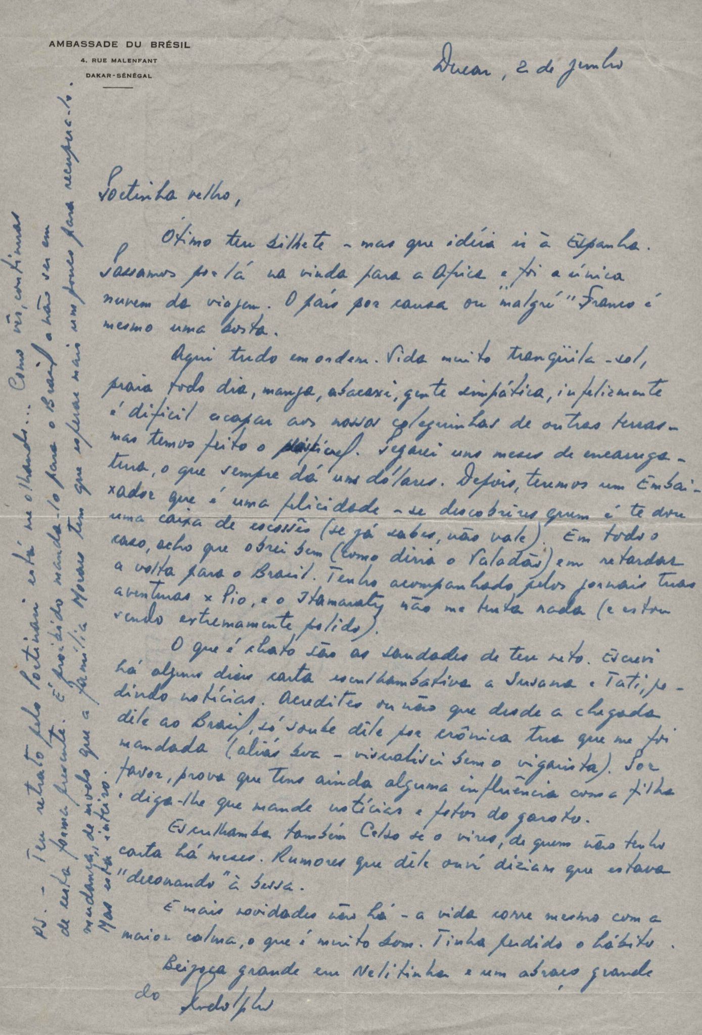 Agradecimento pelo bilhete enviado. Comentário sobre a viagem que está fazendo. Notícias sobre a filha do destinatário e de seus amigos. Recomendações a Nelita de Abreu Rocha, esposa de VM.