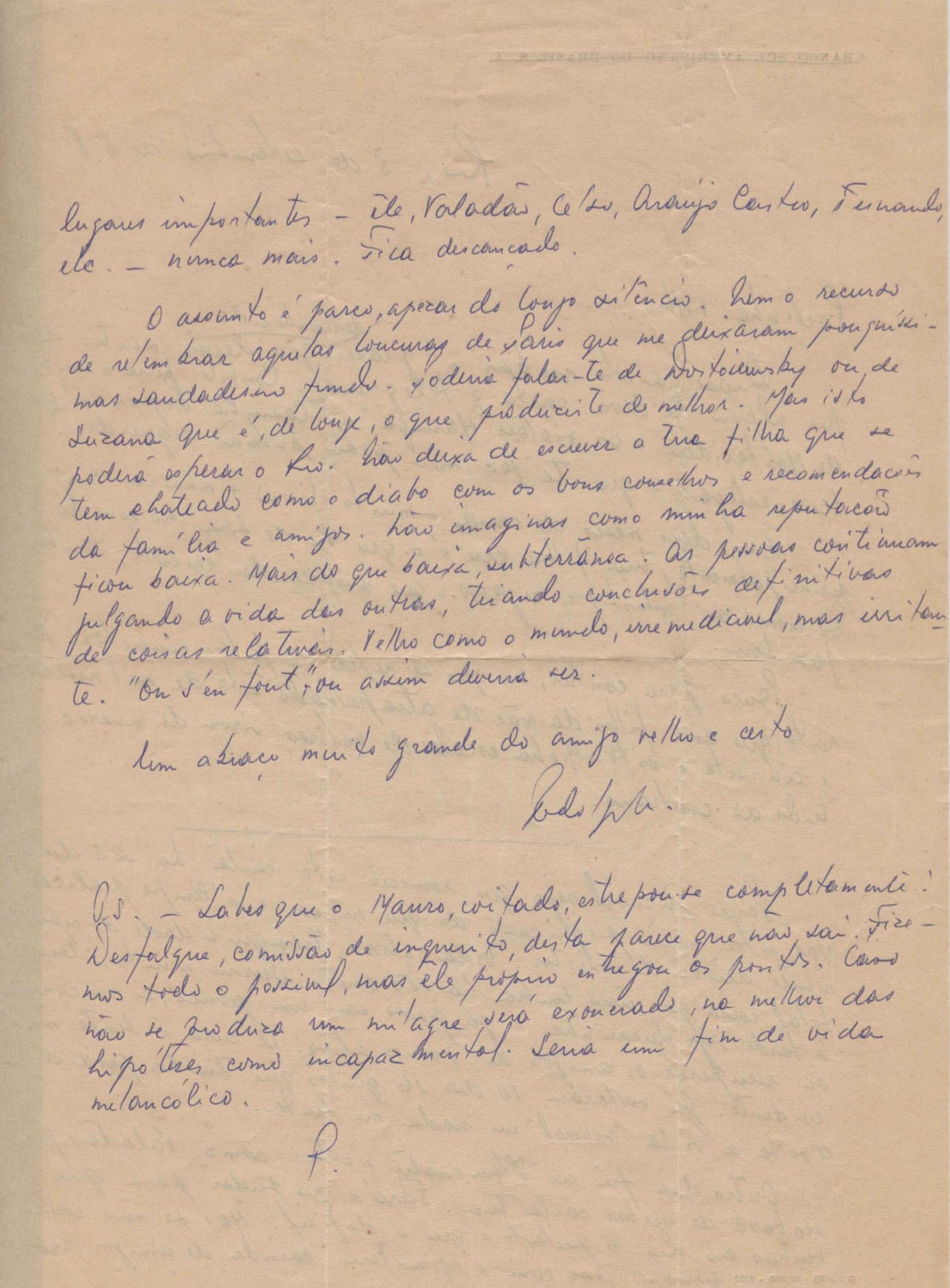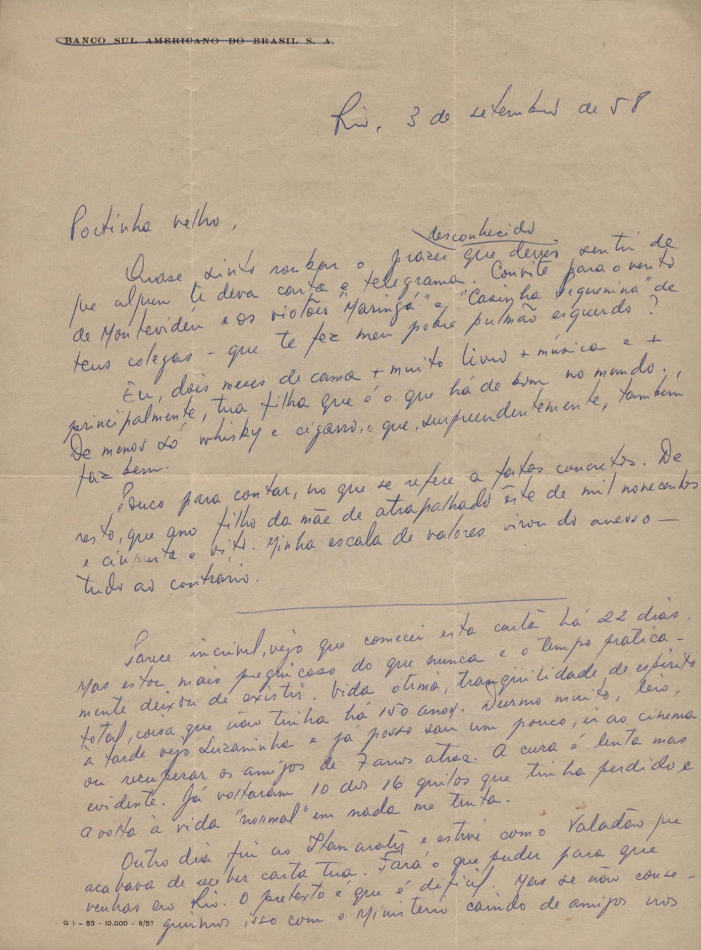 Agradecimento pelo bilhete enviado. Comentário sobre a viagem que está fazendo. Notícias sobre a filha do destinatário e de seus amigos. Recomendações a Nelita de Abreu Rocha, esposa de VM.