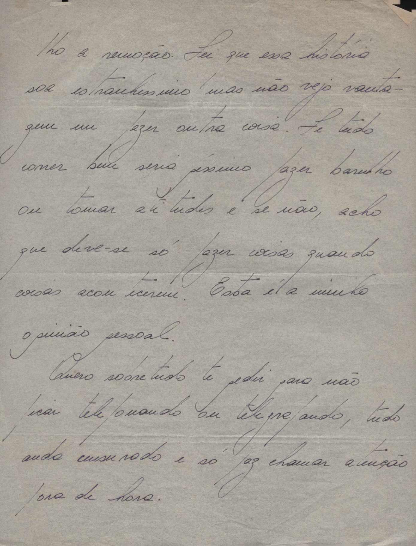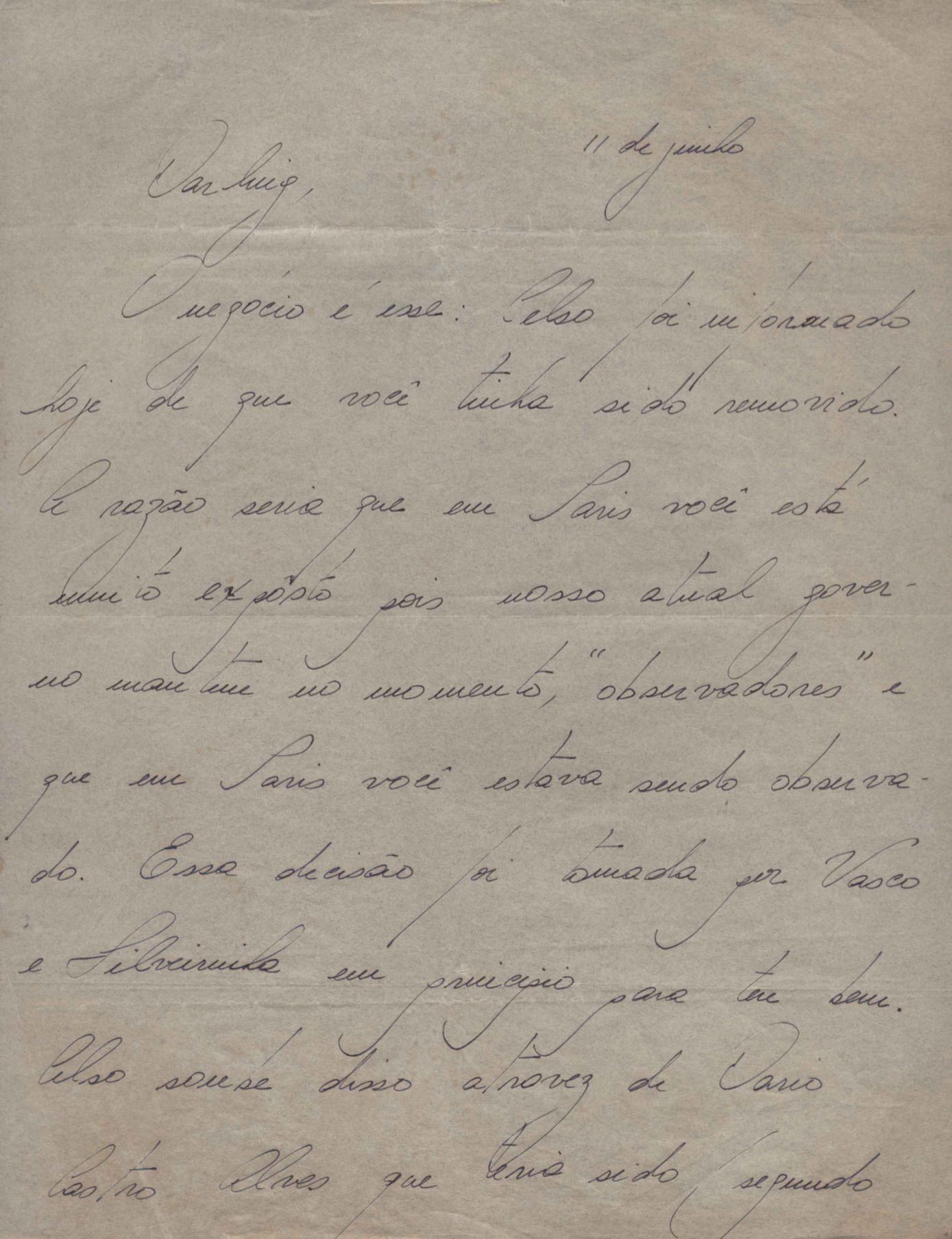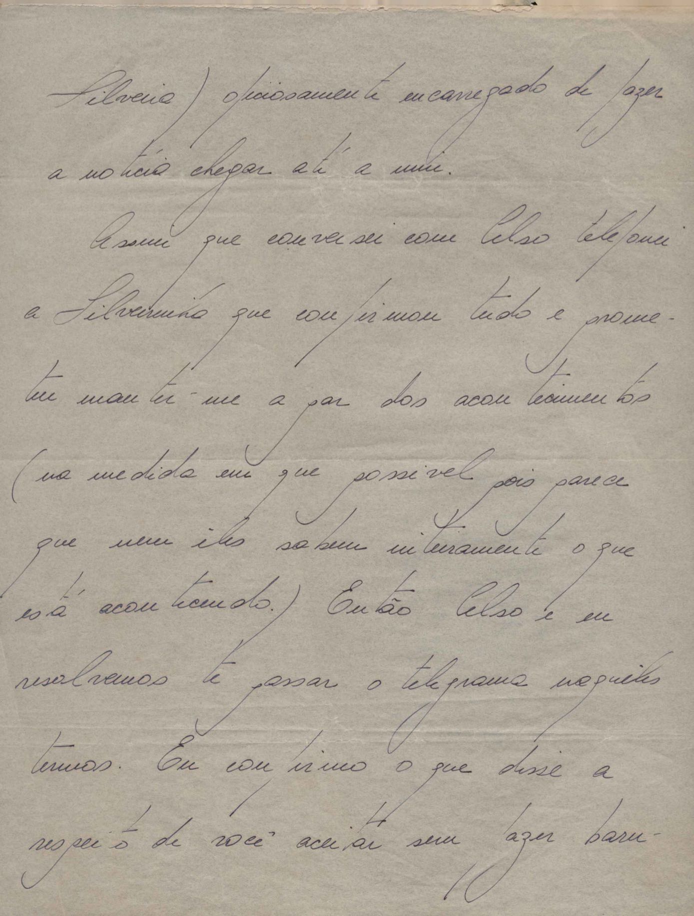 Notícias sobre a vida familiar. Interesse do autor pela publicação de suas crônicas sobre cinema, pela coleção de cinema do Instituto Nacional do Livro. Pretensão de viajar para Moscou, com passagem por Paris. Comentário sobre o convite para passar temporada em Barcelona, na casa de João Cabral de Melo Neto. Informação a respeito de um amigo, Artur Lício Pontual, que fez música para o "Soneto de fidelidade". Envio de livro, cujo título não foi mencionado, por Lila Maria Esquerdo e Bôscoli para apreciação de VM. Pedido de notícias sobre a transferência de VM para Paris. Solicitação a Lygia Cruz de Moraes de documentos e dos livros: Antologia poética e Para viver um grande amor, que devem ser levados a Paris, pelo genro, Rodolfo Souza Dantas. Comentário sobre Pedro de Mello Moraes a respeito de ida a Paris.