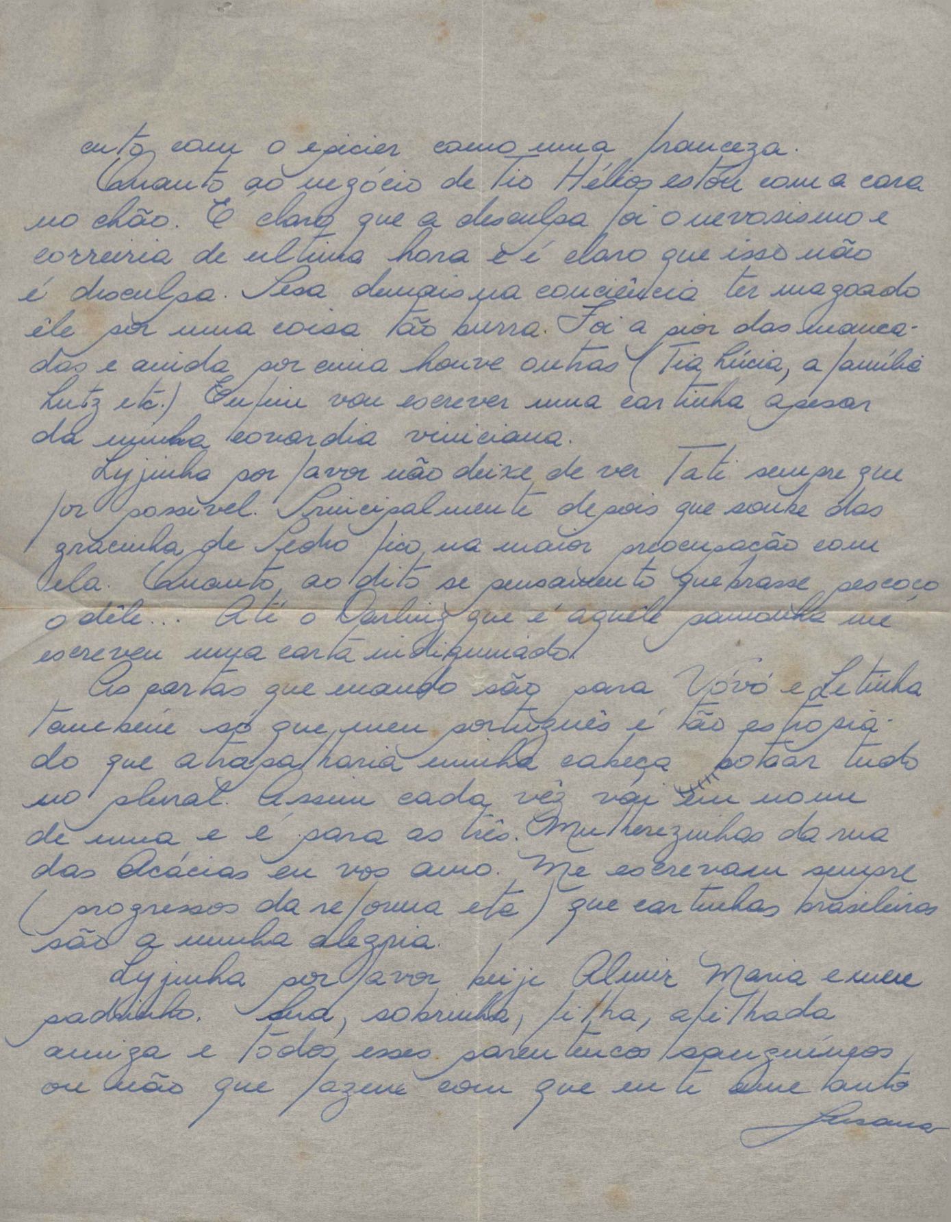 Agradecimento pela carta de felicitação de aniversário. Rodolfo Souza Dantas, marido de Susana de Moraes Feinberg, manda lembranças a todos. Referência a Macunaíma, personagem do livro de Mário de Andrade. A signatária demonstra preocupação em relação à avó, Maria Conceição de Mello Moraes, e à tia, Laetitia Cruz de Moraes.