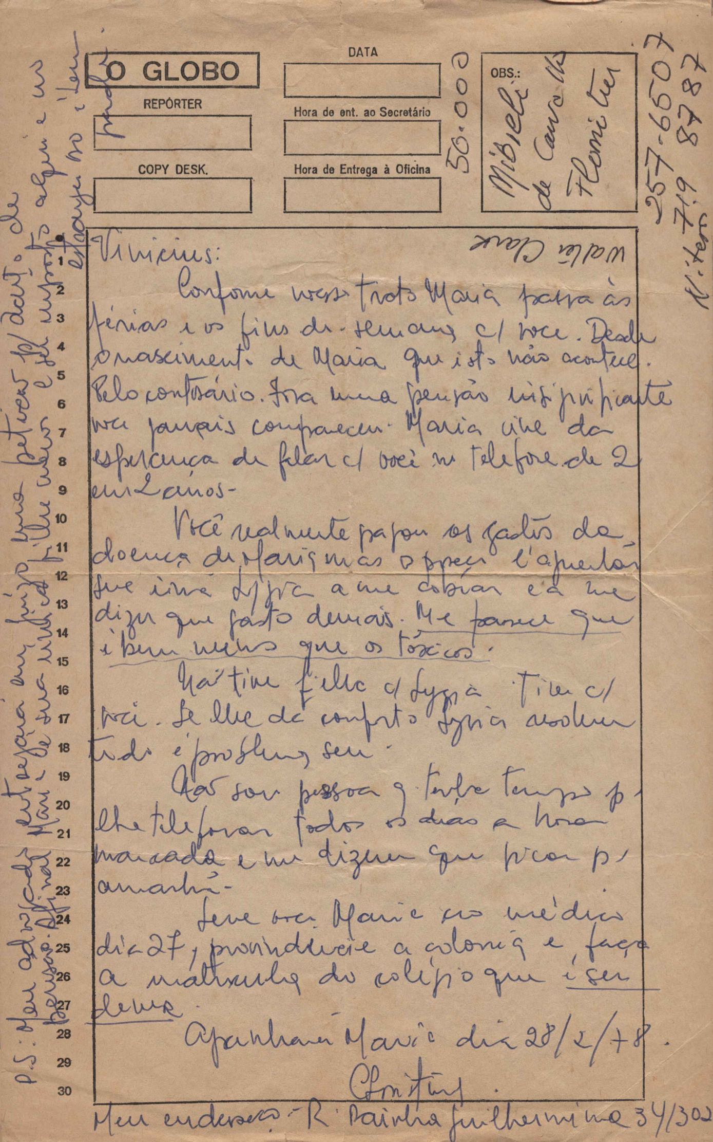 Notícias sobre a vida familiar. Comentário sobre a irmã de VM, Lygia Cruz de Moraes. Referência a Joel da Silveira. Aviso de chegada de Maria, filha de VM, ao Rio de Janeiro.