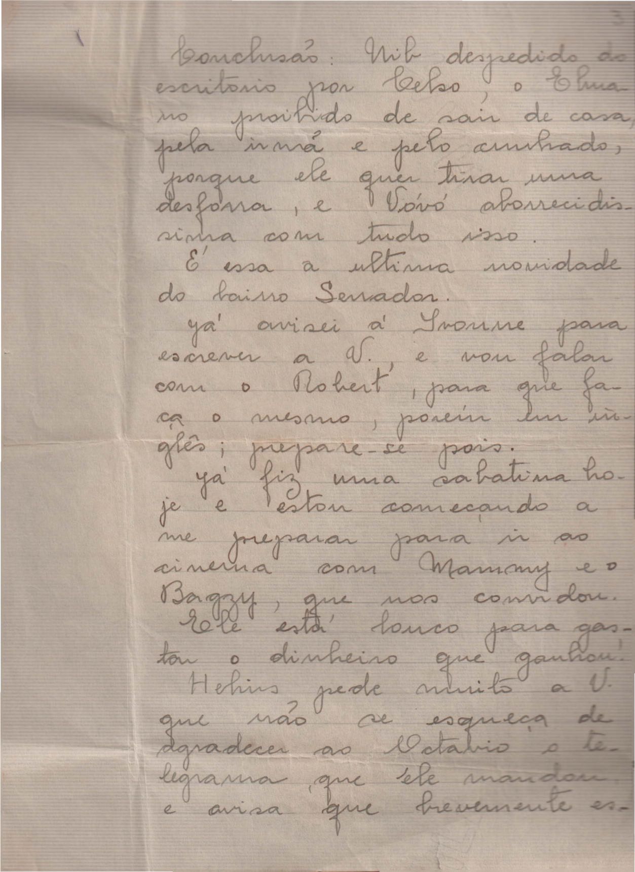 Notícias sobre a vida familiar. Considerações a respeito de pendências a serem resolvidas por VM. Comentário sobre a vida particular de seu irmão, Helius, e sobre a crise nos EUA durante a Guerra Fria. Felicitações pelo aniversário de VM. Comentários sobre o falecimento de seus pais, Clodoaldo Pereira da Silva Moraes e Lydia Cruz de Moraes. Notícias sobre o retorno de VM ao Brasil. Comentário sobre as obras Orfeu da Conceição e Poesia de carnaval e sobre amigos de VM: Aníbal Machado, Ênio da Silveira, Haroldo Tapajós, Irineu Garcia, John Mc Dowell, Mário Cabral, Maurício Fernandes, Otávio de Faria, Rodrigo Goulart, Pedro Nava, Tom Jobim entre outros. Comentário a respeito do livro [Caminho para a distância] voltar para o prelo. Menção à produção de um conto, "A lágrima", um soneto, "Judeu errante", e os poemas "Os inconsoláveis", "O bom-pastor", "A retirada", "A árvore da montanha" e "Desejo". Recomendações acerca de livros deixados por VM para serem enviados a Hecila Rodrigues de Brito. Solicitação para que Laetitia Cruz de Moraes leia o "Registro literário", de João Ribeiro, no Jornal do Brasil, e envie as críticas sobre o livro de VM. Pedido de comentário sobre os filmes: Caminho da vida, Cântico dos cânticos, Onde a terra acaba e The stranger’s return, do diretor King Vidor. Pedido de envio de algumas letras de músicas em inglês e valsas americanas. Preocupação a respeito das investidas em química, de seu irmão Helius de Moraes. Felicitações pelos 18 anos de Laetitia Cruz de Moraes. Referência a várias pessoas: Aníbal Machado, Antônia, Antônio Maria, Carlos Leão, Carlos Lacerda, Cristiano Machado, Décio de Moura, Fernando Filpo, Fernando Sabino, Getúlio Vargas, Helius de Moraes, Jane Russel, Joan Crawford, João Araújo Castro, Jorge Carvalho e Silva, Jorge Vargas de Andrade, Juan de La Cruz, Lydia Cruz de Moraes, Lygia Cruz de Moraes, Lúcia Proença Vargas, Maria Macedo Soares, Mário Cabral, Mário da Câmara, Mário Fernandes, Otávio de Faria, Paulo Mendes Campos, Paulo Soledade, Prudente de Morais Neto, Susana de Moraes Feinberg e Vinicius da Veiga. Lembranças a amigos e familiares. Considerações a respeito da infância. Manifestação de apoio à irmã, Laetitia Cruz de Moraes. Comentários sobre o pai, Clodoaldo Pereira da Silva Moraes. Notícias sobre o estado de saúde de VM. Referência a dois poemas escritos na Cachoeira de Maromba, em Itatiaia: "A queda" e "Legião dos úrias". Na carta de 4 nov. 1938, VM faz considerações a respeito de Beatriz de Azevedo de Mello de Moraes e fala sobre o seu casamento por procuração. Pedido de segredo absoluto sobre o assunto. Comentário sobre os estudos para o concurso do Itamaraty. Notícias sobre a gravidez de Tati de Moraes. Pedido de favor referente a assuntos bancários. Envio de procurações para os futuros recebimentos de salários de VM. Notícias sobre sua presença em festivais. Nomeação de VM para Secretário Geral da Comissão de Organização do I Festival de Cinema do Brasil. Felicitações pelo aniversário de seu pai, Clodoaldo Pereira da Silva Moraes. Notícias sobre seu trabalho. Recomendações sobre a publicação de artigos seus no Diário Carioca. Notícias sobre seu retorno ao Brasil. Intenção de levar a família para visitá-lo em Paris. Solicitação de despacho de objetos pessoais pelo Itamaraty. Sugestão de poemas seus para serem editados por Rubem Braga: "A legião dos úrias", "Ausência", "Ariana, a mulher", "A máscara da noite", "O cemitério na madrugada", "O desespero da piedade", "Elegia desesperada", "A vida vivida", "O tempo nos parques", "Balanço do filho morto", "Balada do Mangue", "O poeta e a lua", "Mensagem à poesia", "Poética", "Soneto de fidelidade", "Soneto de separação", "O dia da criação", "O riso" e "Balada dos mortos dos campos de concentração". Pedido de auxílio para resolver problemas bancários. Notícias sobre o programa feito para o Rio de Janeiro e São Paulo, com Sacha Gordine e Albert Camus, para divulgação do filme Orfeu negro. Recomendações a respeito de discos novos gravados que precisam ser registrados na SBACEM: "Bom dia tristeza", que Aracy de Almeida gravou, e várias gravações novas de "Se todos fossem iguais a você". Solicitação de envio dos poemas "Elegia da paz" e "Desastre de Lionel Marmier". Notícia do desaparecimento do Roteiro lírico e sentimental da cidade do Rio de Janeiro. Pedido de auxílio a Sette Câmara para ser removido para outro posto do Itamaraty, em Buenos Aires, Montevidéu ou Santiago. Referência a Claudio Santoro, para fazer uma ópera com o Orfeu da Conceição. Notícias de mudança para Montevidéu em 23 ago. 1957.