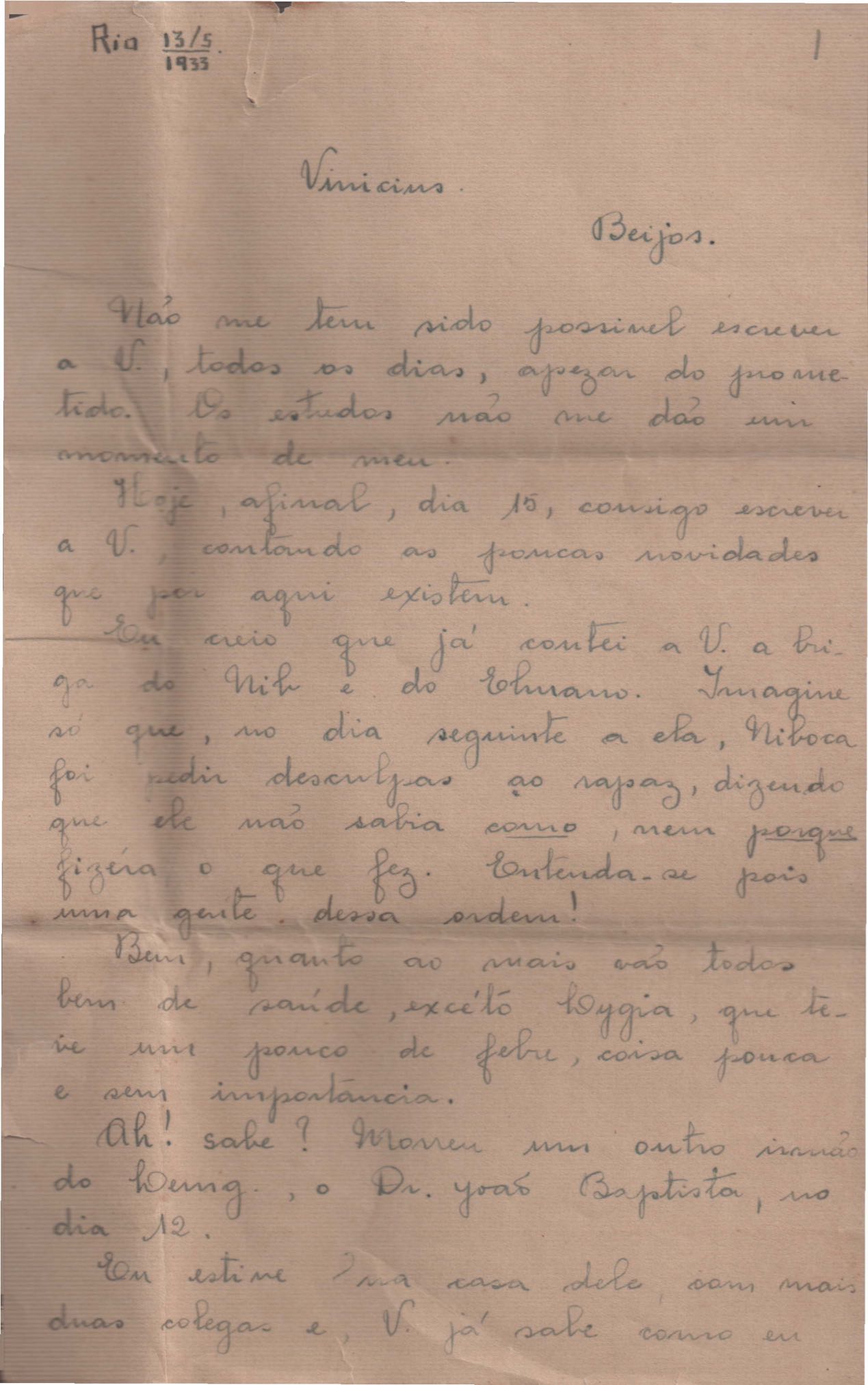 Notícias sobre a vida familiar. Considerações a respeito de pendências a serem resolvidas por VM. Comentário sobre a vida particular de seu irmão, Helius, e sobre a crise nos EUA durante a Guerra Fria. Felicitações pelo aniversário de VM. Comentários sobre o falecimento de seus pais, Clodoaldo Pereira da Silva Moraes e Lydia Cruz de Moraes. Notícias sobre o retorno de VM ao Brasil. Comentário sobre as obras Orfeu da Conceição e Poesia de carnaval e sobre amigos de VM: Aníbal Machado, Ênio da Silveira, Haroldo Tapajós, Irineu Garcia, John Mc Dowell, Mário Cabral, Maurício Fernandes, Otávio de Faria, Rodrigo Goulart, Pedro Nava, Tom Jobim entre outros. Comentário a respeito do livro [Caminho para a distância] voltar para o prelo. Menção à produção de um conto, "A lágrima", um soneto, "Judeu errante", e os poemas "Os inconsoláveis", "O bom-pastor", "A retirada", "A árvore da montanha" e "Desejo". Recomendações acerca de livros deixados por VM para serem enviados a Hecila Rodrigues de Brito. Solicitação para que Laetitia Cruz de Moraes leia o "Registro literário", de João Ribeiro, no Jornal do Brasil, e envie as críticas sobre o livro de VM. Pedido de comentário sobre os filmes: Caminho da vida, Cântico dos cânticos, Onde a terra acaba e The stranger’s return, do diretor King Vidor. Pedido de envio de algumas letras de músicas em inglês e valsas americanas. Preocupação a respeito das investidas em química, de seu irmão Helius de Moraes. Felicitações pelos 18 anos de Laetitia Cruz de Moraes. Referência a várias pessoas: Aníbal Machado, Antônia, Antônio Maria, Carlos Leão, Carlos Lacerda, Cristiano Machado, Décio de Moura, Fernando Filpo, Fernando Sabino, Getúlio Vargas, Helius de Moraes, Jane Russel, Joan Crawford, João Araújo Castro, Jorge Carvalho e Silva, Jorge Vargas de Andrade, Juan de La Cruz, Lydia Cruz de Moraes, Lygia Cruz de Moraes, Lúcia Proença Vargas, Maria Macedo Soares, Mário Cabral, Mário da Câmara, Mário Fernandes, Otávio de Faria, Paulo Mendes Campos, Paulo Soledade, Prudente de Morais Neto, Susana de Moraes Feinberg e Vinicius da Veiga. Lembranças a amigos e familiares. Considerações a respeito da infância. Manifestação de apoio à irmã, Laetitia Cruz de Moraes. Comentários sobre o pai, Clodoaldo Pereira da Silva Moraes. Notícias sobre o estado de saúde de VM. Referência a dois poemas escritos na Cachoeira de Maromba, em Itatiaia: "A queda" e "Legião dos úrias". Na carta de 4 nov. 1938, VM faz considerações a respeito de Beatriz de Azevedo de Mello de Moraes e fala sobre o seu casamento por procuração. Pedido de segredo absoluto sobre o assunto. Comentário sobre os estudos para o concurso do Itamaraty. Notícias sobre a gravidez de Tati de Moraes. Pedido de favor referente a assuntos bancários. Envio de procurações para os futuros recebimentos de salários de VM. Notícias sobre sua presença em festivais. Nomeação de VM para Secretário Geral da Comissão de Organização do I Festival de Cinema do Brasil. Felicitações pelo aniversário de seu pai, Clodoaldo Pereira da Silva Moraes. Notícias sobre seu trabalho. Recomendações sobre a publicação de artigos seus no Diário Carioca. Notícias sobre seu retorno ao Brasil. Intenção de levar a família para visitá-lo em Paris. Solicitação de despacho de objetos pessoais pelo Itamaraty. Sugestão de poemas seus para serem editados por Rubem Braga: "A legião dos úrias", "Ausência", "Ariana, a mulher", "A máscara da noite", "O cemitério na madrugada", "O desespero da piedade", "Elegia desesperada", "A vida vivida", "O tempo nos parques", "Balanço do filho morto", "Balada do Mangue", "O poeta e a lua", "Mensagem à poesia", "Poética", "Soneto de fidelidade", "Soneto de separação", "O dia da criação", "O riso" e "Balada dos mortos dos campos de concentração". Pedido de auxílio para resolver problemas bancários. Notícias sobre o programa feito para o Rio de Janeiro e São Paulo, com Sacha Gordine e Albert Camus, para divulgação do filme Orfeu negro. Recomendações a respeito de discos novos gravados que precisam ser registrados na SBACEM: "Bom dia tristeza", que Aracy de Almeida gravou, e várias gravações novas de "Se todos fossem iguais a você". Solicitação de envio dos poemas "Elegia da paz" e "Desastre de Lionel Marmier". Notícia do desaparecimento do Roteiro lírico e sentimental da cidade do Rio de Janeiro. Pedido de auxílio a Sette Câmara para ser removido para outro posto do Itamaraty, em Buenos Aires, Montevidéu ou Santiago. Referência a Claudio Santoro, para fazer uma ópera com o Orfeu da Conceição. Notícias de mudança para Montevidéu em 23 ago. 1957.