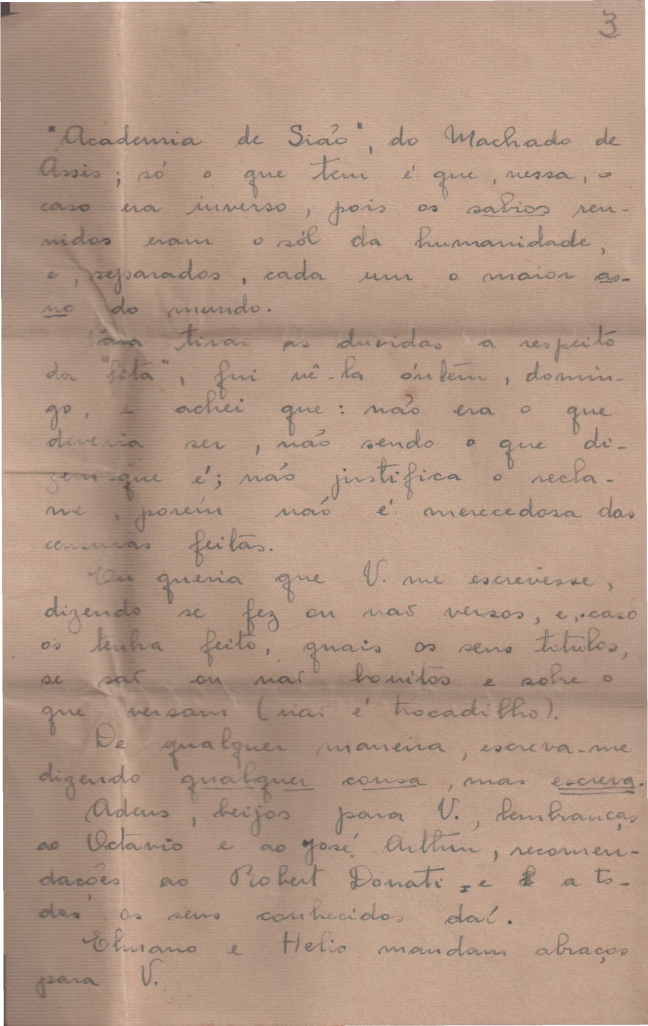 Correspondências entre VM e sua irmã, Laetitia Cruz de Moraes. Há cartas manchadas e sem data.