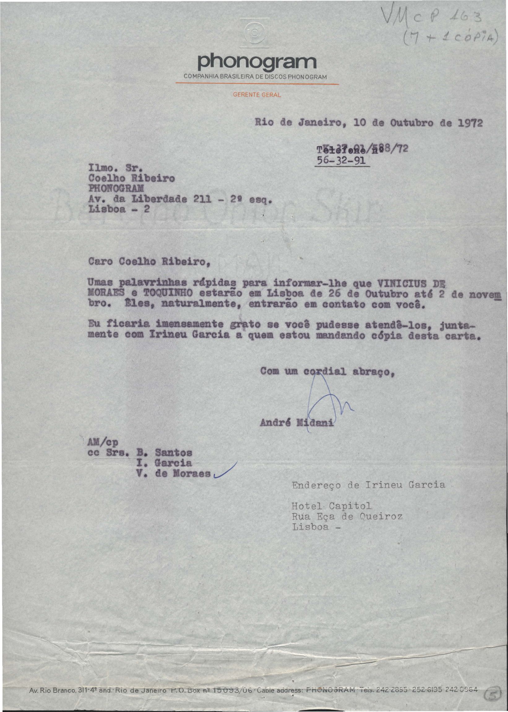 Intenção de gravar uma antologia poética brasileira e uma edição atualizada do disco Pobre menina rica. Informações sobre apresentação de VM e Toquinho em Lisboa, Roma e Paris. Remessa de contrato. Anexos: Cartas (4) de André Midani a Bruno Coquatrix, a Pierre Terrighi, a Coelho Ribeiro e a Alain Trossat.
