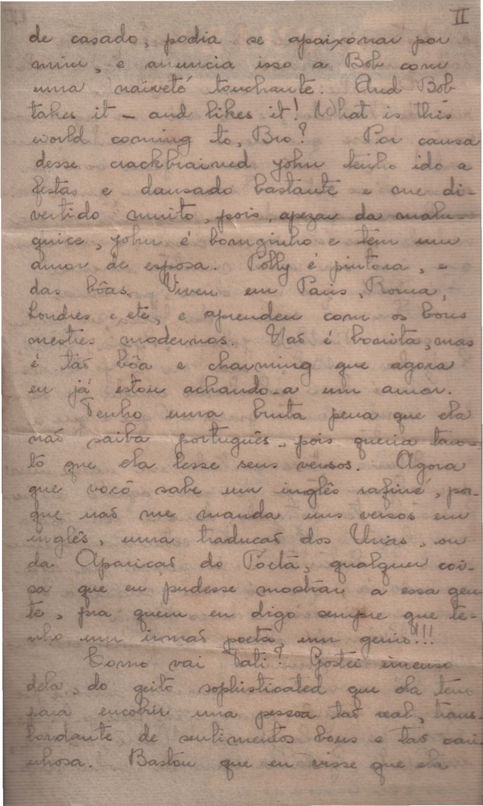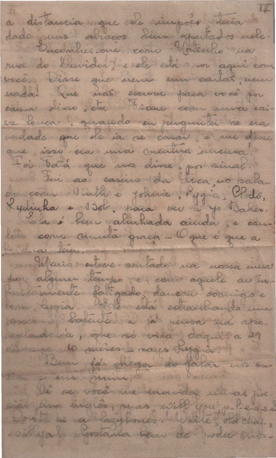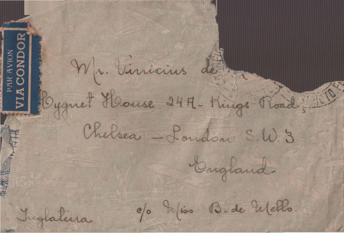 Notícias sobre a vida familiar. Considerações a respeito de pendências a serem resolvidas por VM. Comentário sobre a vida particular de seu irmão, Helius, e sobre a crise nos EUA durante a Guerra Fria. Felicitações pelo aniversário de VM. Comentários sobre o falecimento de seus pais, Clodoaldo Pereira da Silva Moraes e Lydia Cruz de Moraes. Notícias sobre o retorno de VM ao Brasil. Comentário sobre as obras Orfeu da Conceição e Poesia de carnaval e sobre amigos de VM: Aníbal Machado, Ênio da Silveira, Haroldo Tapajós, Irineu Garcia, John Mc Dowell, Mário Cabral, Maurício Fernandes, Otávio de Faria, Rodrigo Goulart, Pedro Nava, Tom Jobim entre outros. Comentário a respeito do livro [Caminho para a distância] voltar para o prelo. Menção à produção de um conto, "A lágrima", um soneto, "Judeu errante", e os poemas "Os inconsoláveis", "O bom-pastor", "A retirada", "A árvore da montanha" e "Desejo". Recomendações acerca de livros deixados por VM para serem enviados a Hecila Rodrigues de Brito. Solicitação para que Laetitia Cruz de Moraes leia o "Registro literário", de João Ribeiro, no Jornal do Brasil, e envie as críticas sobre o livro de VM. Pedido de comentário sobre os filmes: Caminho da vida, Cântico dos cânticos, Onde a terra acaba e The stranger’s return, do diretor King Vidor. Pedido de envio de algumas letras de músicas em inglês e valsas americanas. Preocupação a respeito das investidas em química, de seu irmão Helius de Moraes. Felicitações pelos 18 anos de Laetitia Cruz de Moraes. Referência a várias pessoas: Aníbal Machado, Antônia, Antônio Maria, Carlos Leão, Carlos Lacerda, Cristiano Machado, Décio de Moura, Fernando Filpo, Fernando Sabino, Getúlio Vargas, Helius de Moraes, Jane Russel, Joan Crawford, João Araújo Castro, Jorge Carvalho e Silva, Jorge Vargas de Andrade, Juan de La Cruz, Lydia Cruz de Moraes, Lygia Cruz de Moraes, Lúcia Proença Vargas, Maria Macedo Soares, Mário Cabral, Mário da Câmara, Mário Fernandes, Otávio de Faria, Paulo Mendes Campos, Paulo Soledade, Prudente de Morais Neto, Susana de Moraes Feinberg e Vinicius da Veiga. Lembranças a amigos e familiares. Considerações a respeito da infância. Manifestação de apoio à irmã, Laetitia Cruz de Moraes. Comentários sobre o pai, Clodoaldo Pereira da Silva Moraes. Notícias sobre o estado de saúde de VM. Referência a dois poemas escritos na Cachoeira de Maromba, em Itatiaia: "A queda" e "Legião dos úrias". Na carta de 4 nov. 1938, VM faz considerações a respeito de Beatriz de Azevedo de Mello de Moraes e fala sobre o seu casamento por procuração. Pedido de segredo absoluto sobre o assunto. Comentário sobre os estudos para o concurso do Itamaraty. Notícias sobre a gravidez de Tati de Moraes. Pedido de favor referente a assuntos bancários. Envio de procurações para os futuros recebimentos de salários de VM. Notícias sobre sua presença em festivais. Nomeação de VM para Secretário Geral da Comissão de Organização do I Festival de Cinema do Brasil. Felicitações pelo aniversário de seu pai, Clodoaldo Pereira da Silva Moraes. Notícias sobre seu trabalho. Recomendações sobre a publicação de artigos seus no Diário Carioca. Notícias sobre seu retorno ao Brasil. Intenção de levar a família para visitá-lo em Paris. Solicitação de despacho de objetos pessoais pelo Itamaraty. Sugestão de poemas seus para serem editados por Rubem Braga: "A legião dos úrias", "Ausência", "Ariana, a mulher", "A máscara da noite", "O cemitério na madrugada", "O desespero da piedade", "Elegia desesperada", "A vida vivida", "O tempo nos parques", "Balanço do filho morto", "Balada do Mangue", "O poeta e a lua", "Mensagem à poesia", "Poética", "Soneto de fidelidade", "Soneto de separação", "O dia da criação", "O riso" e "Balada dos mortos dos campos de concentração". Pedido de auxílio para resolver problemas bancários. Notícias sobre o programa feito para o Rio de Janeiro e São Paulo, com Sacha Gordine e Albert Camus, para divulgação do filme Orfeu negro. Recomendações a respeito de discos novos gravados que precisam ser registrados na SBACEM: "Bom dia tristeza", que Aracy de Almeida gravou, e várias gravações novas de "Se todos fossem iguais a você". Solicitação de envio dos poemas "Elegia da paz" e "Desastre de Lionel Marmier". Notícia do desaparecimento do Roteiro lírico e sentimental da cidade do Rio de Janeiro. Pedido de auxílio a Sette Câmara para ser removido para outro posto do Itamaraty, em Buenos Aires, Montevidéu ou Santiago. Referência a Claudio Santoro, para fazer uma ópera com o Orfeu da Conceição. Notícias de mudança para Montevidéu em 23 ago. 1957.