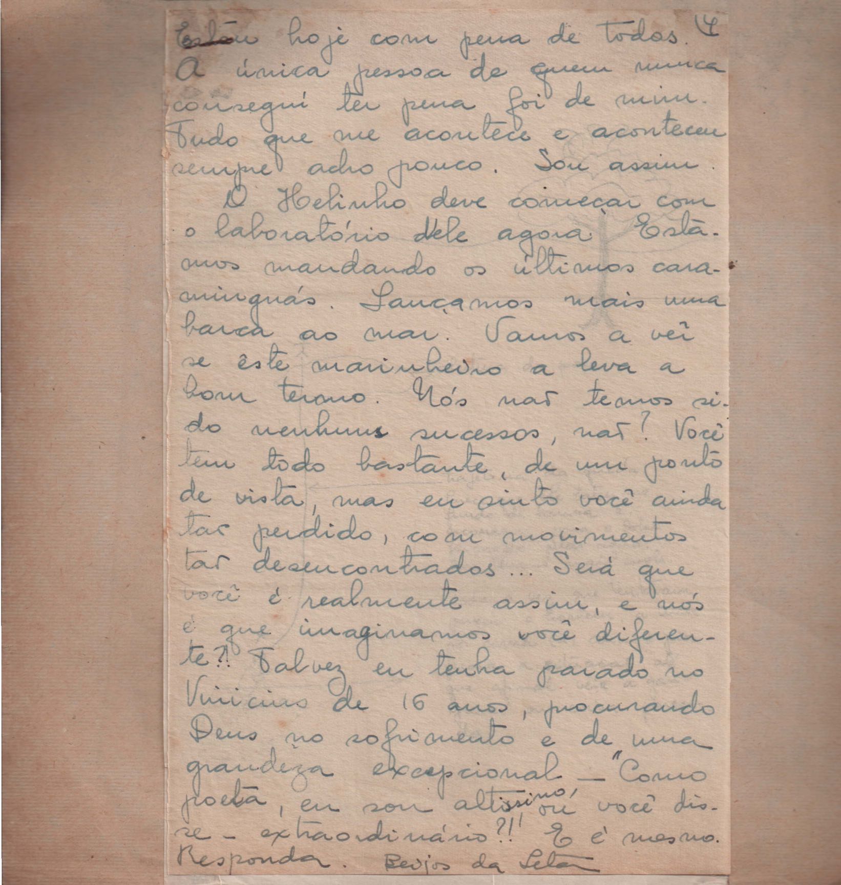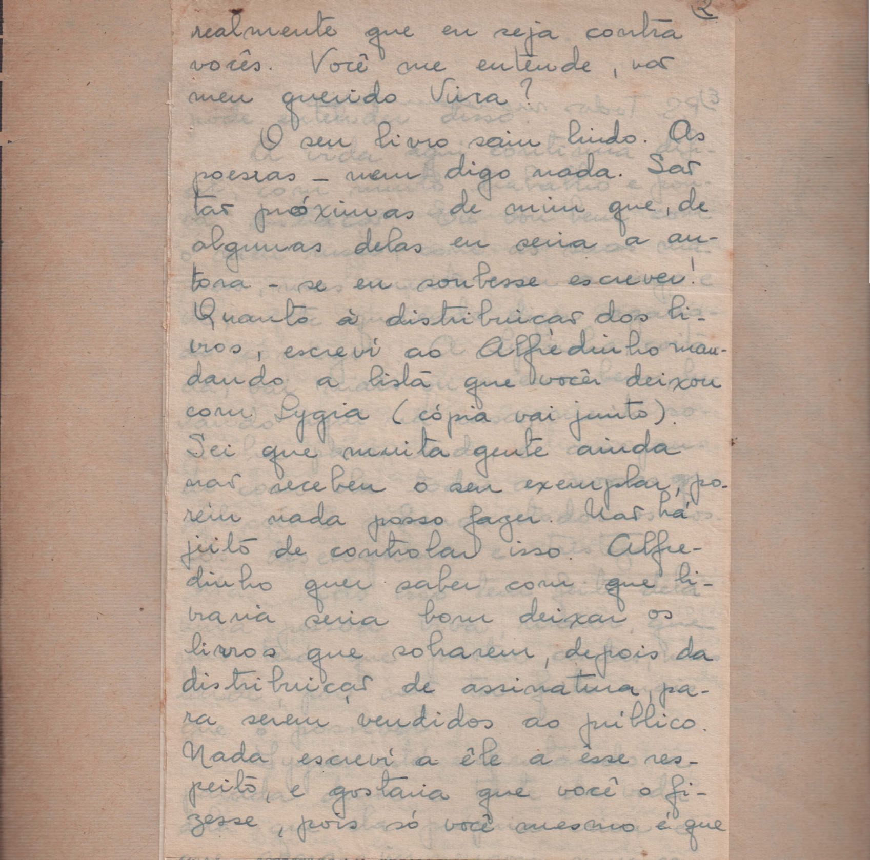 Notícias sobre a vida familiar. Considerações a respeito de pendências a serem resolvidas por VM. Comentário sobre a vida particular de seu irmão, Helius, e sobre a crise nos EUA durante a Guerra Fria. Felicitações pelo aniversário de VM. Comentários sobre o falecimento de seus pais, Clodoaldo Pereira da Silva Moraes e Lydia Cruz de Moraes. Notícias sobre o retorno de VM ao Brasil. Comentário sobre as obras Orfeu da Conceição e Poesia de carnaval e sobre amigos de VM: Aníbal Machado, Ênio da Silveira, Haroldo Tapajós, Irineu Garcia, John Mc Dowell, Mário Cabral, Maurício Fernandes, Otávio de Faria, Rodrigo Goulart, Pedro Nava, Tom Jobim entre outros. Comentário a respeito do livro [Caminho para a distância] voltar para o prelo. Menção à produção de um conto, "A lágrima", um soneto, "Judeu errante", e os poemas "Os inconsoláveis", "O bom-pastor", "A retirada", "A árvore da montanha" e "Desejo". Recomendações acerca de livros deixados por VM para serem enviados a Hecila Rodrigues de Brito. Solicitação para que Laetitia Cruz de Moraes leia o "Registro literário", de João Ribeiro, no Jornal do Brasil, e envie as críticas sobre o livro de VM. Pedido de comentário sobre os filmes: Caminho da vida, Cântico dos cânticos, Onde a terra acaba e The stranger’s return, do diretor King Vidor. Pedido de envio de algumas letras de músicas em inglês e valsas americanas. Preocupação a respeito das investidas em química, de seu irmão Helius de Moraes. Felicitações pelos 18 anos de Laetitia Cruz de Moraes. Referência a várias pessoas: Aníbal Machado, Antônia, Antônio Maria, Carlos Leão, Carlos Lacerda, Cristiano Machado, Décio de Moura, Fernando Filpo, Fernando Sabino, Getúlio Vargas, Helius de Moraes, Jane Russel, Joan Crawford, João Araújo Castro, Jorge Carvalho e Silva, Jorge Vargas de Andrade, Juan de La Cruz, Lydia Cruz de Moraes, Lygia Cruz de Moraes, Lúcia Proença Vargas, Maria Macedo Soares, Mário Cabral, Mário da Câmara, Mário Fernandes, Otávio de Faria, Paulo Mendes Campos, Paulo Soledade, Prudente de Morais Neto, Susana de Moraes Feinberg e Vinicius da Veiga. Lembranças a amigos e familiares. Considerações a respeito da infância. Manifestação de apoio à irmã, Laetitia Cruz de Moraes. Comentários sobre o pai, Clodoaldo Pereira da Silva Moraes. Notícias sobre o estado de saúde de VM. Referência a dois poemas escritos na Cachoeira de Maromba, em Itatiaia: "A queda" e "Legião dos úrias". Na carta de 4 nov. 1938, VM faz considerações a respeito de Beatriz de Azevedo de Mello de Moraes e fala sobre o seu casamento por procuração. Pedido de segredo absoluto sobre o assunto. Comentário sobre os estudos para o concurso do Itamaraty. Notícias sobre a gravidez de Tati de Moraes. Pedido de favor referente a assuntos bancários. Envio de procurações para os futuros recebimentos de salários de VM. Notícias sobre sua presença em festivais. Nomeação de VM para Secretário Geral da Comissão de Organização do I Festival de Cinema do Brasil. Felicitações pelo aniversário de seu pai, Clodoaldo Pereira da Silva Moraes. Notícias sobre seu trabalho. Recomendações sobre a publicação de artigos seus no Diário Carioca. Notícias sobre seu retorno ao Brasil. Intenção de levar a família para visitá-lo em Paris. Solicitação de despacho de objetos pessoais pelo Itamaraty. Sugestão de poemas seus para serem editados por Rubem Braga: "A legião dos úrias", "Ausência", "Ariana, a mulher", "A máscara da noite", "O cemitério na madrugada", "O desespero da piedade", "Elegia desesperada", "A vida vivida", "O tempo nos parques", "Balanço do filho morto", "Balada do Mangue", "O poeta e a lua", "Mensagem à poesia", "Poética", "Soneto de fidelidade", "Soneto de separação", "O dia da criação", "O riso" e "Balada dos mortos dos campos de concentração". Pedido de auxílio para resolver problemas bancários. Notícias sobre o programa feito para o Rio de Janeiro e São Paulo, com Sacha Gordine e Albert Camus, para divulgação do filme Orfeu negro. Recomendações a respeito de discos novos gravados que precisam ser registrados na SBACEM: "Bom dia tristeza", que Aracy de Almeida gravou, e várias gravações novas de "Se todos fossem iguais a você". Solicitação de envio dos poemas "Elegia da paz" e "Desastre de Lionel Marmier". Notícia do desaparecimento do Roteiro lírico e sentimental da cidade do Rio de Janeiro. Pedido de auxílio a Sette Câmara para ser removido para outro posto do Itamaraty, em Buenos Aires, Montevidéu ou Santiago. Referência a Claudio Santoro, para fazer uma ópera com o Orfeu da Conceição. Notícias de mudança para Montevidéu em 23 ago. 1957.