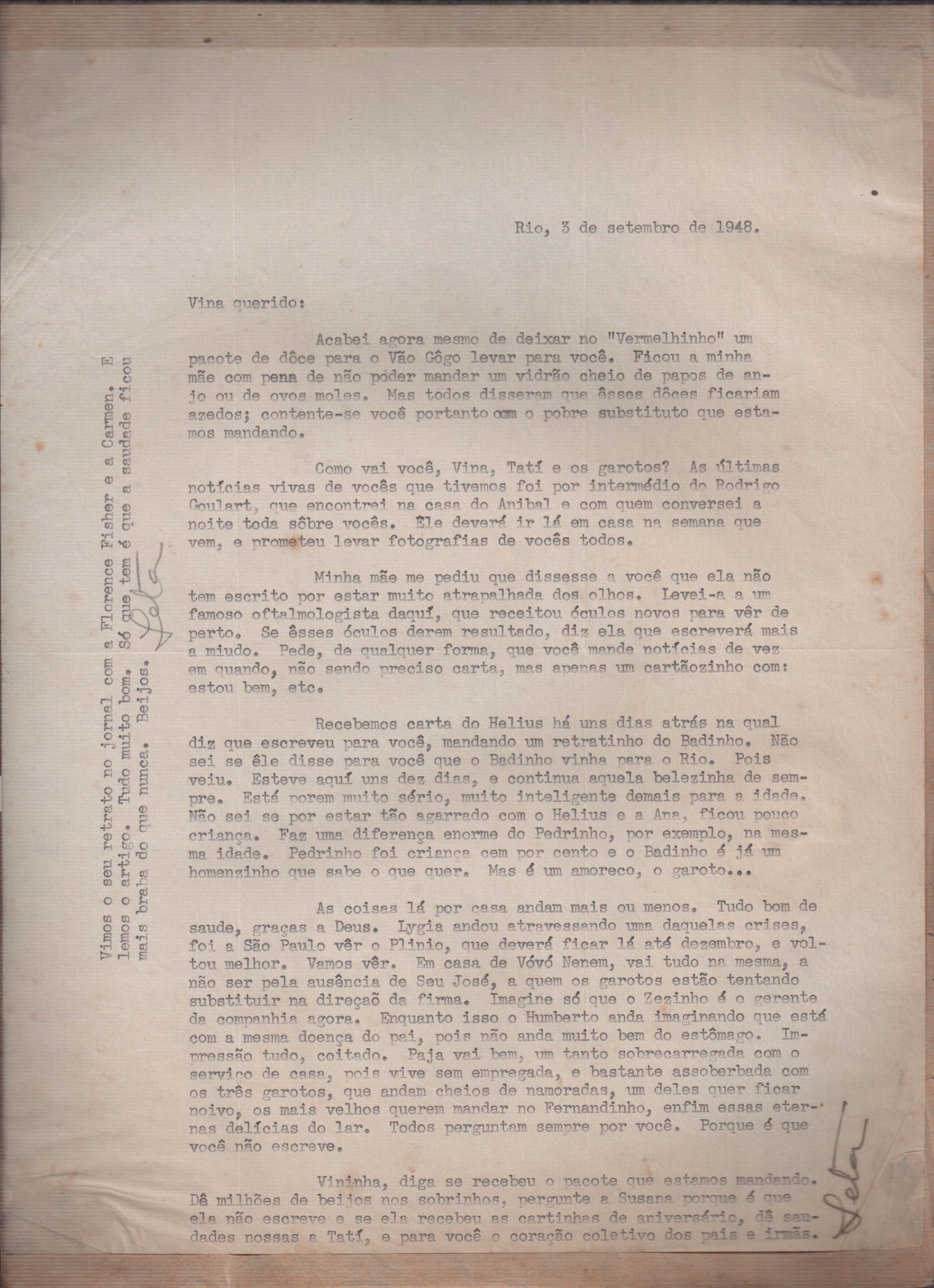 Notícias sobre a vida familiar. Considerações a respeito de pendências a serem resolvidas por VM. Comentário sobre a vida particular de seu irmão, Helius, e sobre a crise nos EUA durante a Guerra Fria. Felicitações pelo aniversário de VM. Comentários sobre o falecimento de seus pais, Clodoaldo Pereira da Silva Moraes e Lydia Cruz de Moraes. Notícias sobre o retorno de VM ao Brasil. Comentário sobre as obras Orfeu da Conceição e Poesia de carnaval e sobre amigos de VM: Aníbal Machado, Ênio da Silveira, Haroldo Tapajós, Irineu Garcia, John Mc Dowell, Mário Cabral, Maurício Fernandes, Otávio de Faria, Rodrigo Goulart, Pedro Nava, Tom Jobim entre outros. Comentário a respeito do livro [Caminho para a distância] voltar para o prelo. Menção à produção de um conto, "A lágrima", um soneto, "Judeu errante", e os poemas "Os inconsoláveis", "O bom-pastor", "A retirada", "A árvore da montanha" e "Desejo". Recomendações acerca de livros deixados por VM para serem enviados a Hecila Rodrigues de Brito. Solicitação para que Laetitia Cruz de Moraes leia o "Registro literário", de João Ribeiro, no Jornal do Brasil, e envie as críticas sobre o livro de VM. Pedido de comentário sobre os filmes: Caminho da vida, Cântico dos cânticos, Onde a terra acaba e The stranger’s return, do diretor King Vidor. Pedido de envio de algumas letras de músicas em inglês e valsas americanas. Preocupação a respeito das investidas em química, de seu irmão Helius de Moraes. Felicitações pelos 18 anos de Laetitia Cruz de Moraes. Referência a várias pessoas: Aníbal Machado, Antônia, Antônio Maria, Carlos Leão, Carlos Lacerda, Cristiano Machado, Décio de Moura, Fernando Filpo, Fernando Sabino, Getúlio Vargas, Helius de Moraes, Jane Russel, Joan Crawford, João Araújo Castro, Jorge Carvalho e Silva, Jorge Vargas de Andrade, Juan de La Cruz, Lydia Cruz de Moraes, Lygia Cruz de Moraes, Lúcia Proença Vargas, Maria Macedo Soares, Mário Cabral, Mário da Câmara, Mário Fernandes, Otávio de Faria, Paulo Mendes Campos, Paulo Soledade, Prudente de Morais Neto, Susana de Moraes Feinberg e Vinicius da Veiga. Lembranças a amigos e familiares. Considerações a respeito da infância. Manifestação de apoio à irmã, Laetitia Cruz de Moraes. Comentários sobre o pai, Clodoaldo Pereira da Silva Moraes. Notícias sobre o estado de saúde de VM. Referência a dois poemas escritos na Cachoeira de Maromba, em Itatiaia: "A queda" e "Legião dos úrias". Na carta de 4 nov. 1938, VM faz considerações a respeito de Beatriz de Azevedo de Mello de Moraes e fala sobre o seu casamento por procuração. Pedido de segredo absoluto sobre o assunto. Comentário sobre os estudos para o concurso do Itamaraty. Notícias sobre a gravidez de Tati de Moraes. Pedido de favor referente a assuntos bancários. Envio de procurações para os futuros recebimentos de salários de VM. Notícias sobre sua presença em festivais. Nomeação de VM para Secretário Geral da Comissão de Organização do I Festival de Cinema do Brasil. Felicitações pelo aniversário de seu pai, Clodoaldo Pereira da Silva Moraes. Notícias sobre seu trabalho. Recomendações sobre a publicação de artigos seus no Diário Carioca. Notícias sobre seu retorno ao Brasil. Intenção de levar a família para visitá-lo em Paris. Solicitação de despacho de objetos pessoais pelo Itamaraty. Sugestão de poemas seus para serem editados por Rubem Braga: "A legião dos úrias", "Ausência", "Ariana, a mulher", "A máscara da noite", "O cemitério na madrugada", "O desespero da piedade", "Elegia desesperada", "A vida vivida", "O tempo nos parques", "Balanço do filho morto", "Balada do Mangue", "O poeta e a lua", "Mensagem à poesia", "Poética", "Soneto de fidelidade", "Soneto de separação", "O dia da criação", "O riso" e "Balada dos mortos dos campos de concentração". Pedido de auxílio para resolver problemas bancários. Notícias sobre o programa feito para o Rio de Janeiro e São Paulo, com Sacha Gordine e Albert Camus, para divulgação do filme Orfeu negro. Recomendações a respeito de discos novos gravados que precisam ser registrados na SBACEM: "Bom dia tristeza", que Aracy de Almeida gravou, e várias gravações novas de "Se todos fossem iguais a você". Solicitação de envio dos poemas "Elegia da paz" e "Desastre de Lionel Marmier". Notícia do desaparecimento do Roteiro lírico e sentimental da cidade do Rio de Janeiro. Pedido de auxílio a Sette Câmara para ser removido para outro posto do Itamaraty, em Buenos Aires, Montevidéu ou Santiago. Referência a Claudio Santoro, para fazer uma ópera com o Orfeu da Conceição. Notícias de mudança para Montevidéu em 23 ago. 1957.