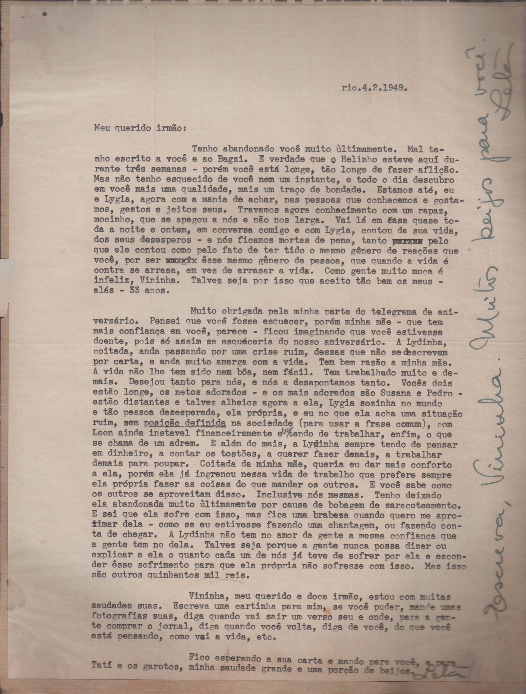 Notícias sobre a vida familiar. Considerações a respeito de pendências a serem resolvidas por VM. Comentário sobre a vida particular de seu irmão, Helius, e sobre a crise nos EUA durante a Guerra Fria. Felicitações pelo aniversário de VM. Comentários sobre o falecimento de seus pais, Clodoaldo Pereira da Silva Moraes e Lydia Cruz de Moraes. Notícias sobre o retorno de VM ao Brasil. Comentário sobre as obras Orfeu da Conceição e Poesia de carnaval e sobre amigos de VM: Aníbal Machado, Ênio da Silveira, Haroldo Tapajós, Irineu Garcia, John Mc Dowell, Mário Cabral, Maurício Fernandes, Otávio de Faria, Rodrigo Goulart, Pedro Nava, Tom Jobim entre outros. Comentário a respeito do livro [Caminho para a distância] voltar para o prelo. Menção à produção de um conto, "A lágrima", um soneto, "Judeu errante", e os poemas "Os inconsoláveis", "O bom-pastor", "A retirada", "A árvore da montanha" e "Desejo". Recomendações acerca de livros deixados por VM para serem enviados a Hecila Rodrigues de Brito. Solicitação para que Laetitia Cruz de Moraes leia o "Registro literário", de João Ribeiro, no Jornal do Brasil, e envie as críticas sobre o livro de VM. Pedido de comentário sobre os filmes: Caminho da vida, Cântico dos cânticos, Onde a terra acaba e The stranger’s return, do diretor King Vidor. Pedido de envio de algumas letras de músicas em inglês e valsas americanas. Preocupação a respeito das investidas em química, de seu irmão Helius de Moraes. Felicitações pelos 18 anos de Laetitia Cruz de Moraes. Referência a várias pessoas: Aníbal Machado, Antônia, Antônio Maria, Carlos Leão, Carlos Lacerda, Cristiano Machado, Décio de Moura, Fernando Filpo, Fernando Sabino, Getúlio Vargas, Helius de Moraes, Jane Russel, Joan Crawford, João Araújo Castro, Jorge Carvalho e Silva, Jorge Vargas de Andrade, Juan de La Cruz, Lydia Cruz de Moraes, Lygia Cruz de Moraes, Lúcia Proença Vargas, Maria Macedo Soares, Mário Cabral, Mário da Câmara, Mário Fernandes, Otávio de Faria, Paulo Mendes Campos, Paulo Soledade, Prudente de Morais Neto, Susana de Moraes Feinberg e Vinicius da Veiga. Lembranças a amigos e familiares. Considerações a respeito da infância. Manifestação de apoio à irmã, Laetitia Cruz de Moraes. Comentários sobre o pai, Clodoaldo Pereira da Silva Moraes. Notícias sobre o estado de saúde de VM. Referência a dois poemas escritos na Cachoeira de Maromba, em Itatiaia: "A queda" e "Legião dos úrias". Na carta de 4 nov. 1938, VM faz considerações a respeito de Beatriz de Azevedo de Mello de Moraes e fala sobre o seu casamento por procuração. Pedido de segredo absoluto sobre o assunto. Comentário sobre os estudos para o concurso do Itamaraty. Notícias sobre a gravidez de Tati de Moraes. Pedido de favor referente a assuntos bancários. Envio de procurações para os futuros recebimentos de salários de VM. Notícias sobre sua presença em festivais. Nomeação de VM para Secretário Geral da Comissão de Organização do I Festival de Cinema do Brasil. Felicitações pelo aniversário de seu pai, Clodoaldo Pereira da Silva Moraes. Notícias sobre seu trabalho. Recomendações sobre a publicação de artigos seus no Diário Carioca. Notícias sobre seu retorno ao Brasil. Intenção de levar a família para visitá-lo em Paris. Solicitação de despacho de objetos pessoais pelo Itamaraty. Sugestão de poemas seus para serem editados por Rubem Braga: "A legião dos úrias", "Ausência", "Ariana, a mulher", "A máscara da noite", "O cemitério na madrugada", "O desespero da piedade", "Elegia desesperada", "A vida vivida", "O tempo nos parques", "Balanço do filho morto", "Balada do Mangue", "O poeta e a lua", "Mensagem à poesia", "Poética", "Soneto de fidelidade", "Soneto de separação", "O dia da criação", "O riso" e "Balada dos mortos dos campos de concentração". Pedido de auxílio para resolver problemas bancários. Notícias sobre o programa feito para o Rio de Janeiro e São Paulo, com Sacha Gordine e Albert Camus, para divulgação do filme Orfeu negro. Recomendações a respeito de discos novos gravados que precisam ser registrados na SBACEM: "Bom dia tristeza", que Aracy de Almeida gravou, e várias gravações novas de "Se todos fossem iguais a você". Solicitação de envio dos poemas "Elegia da paz" e "Desastre de Lionel Marmier". Notícia do desaparecimento do Roteiro lírico e sentimental da cidade do Rio de Janeiro. Pedido de auxílio a Sette Câmara para ser removido para outro posto do Itamaraty, em Buenos Aires, Montevidéu ou Santiago. Referência a Claudio Santoro, para fazer uma ópera com o Orfeu da Conceição. Notícias de mudança para Montevidéu em 23 ago. 1957.