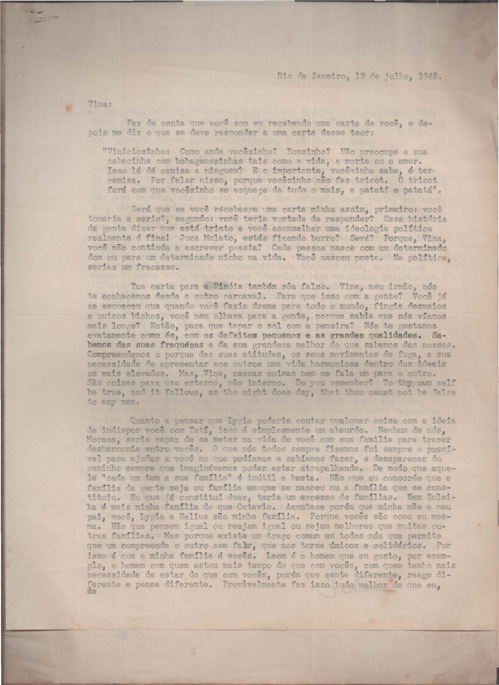 Notícias sobre a vida familiar. Considerações a respeito de pendências a serem resolvidas por VM. Comentário sobre a vida particular de seu irmão, Helius, e sobre a crise nos EUA durante a Guerra Fria. Felicitações pelo aniversário de VM. Comentários sobre o falecimento de seus pais, Clodoaldo Pereira da Silva Moraes e Lydia Cruz de Moraes. Notícias sobre o retorno de VM ao Brasil. Comentário sobre as obras Orfeu da Conceição e Poesia de carnaval e sobre amigos de VM: Aníbal Machado, Ênio da Silveira, Haroldo Tapajós, Irineu Garcia, John Mc Dowell, Mário Cabral, Maurício Fernandes, Otávio de Faria, Rodrigo Goulart, Pedro Nava, Tom Jobim entre outros. Comentário a respeito do livro [Caminho para a distância] voltar para o prelo. Menção à produção de um conto, "A lágrima", um soneto, "Judeu errante", e os poemas "Os inconsoláveis", "O bom-pastor", "A retirada", "A árvore da montanha" e "Desejo". Recomendações acerca de livros deixados por VM para serem enviados a Hecila Rodrigues de Brito. Solicitação para que Laetitia Cruz de Moraes leia o "Registro literário", de João Ribeiro, no Jornal do Brasil, e envie as críticas sobre o livro de VM. Pedido de comentário sobre os filmes: Caminho da vida, Cântico dos cânticos, Onde a terra acaba e The stranger’s return, do diretor King Vidor. Pedido de envio de algumas letras de músicas em inglês e valsas americanas. Preocupação a respeito das investidas em química, de seu irmão Helius de Moraes. Felicitações pelos 18 anos de Laetitia Cruz de Moraes. Referência a várias pessoas: Aníbal Machado, Antônia, Antônio Maria, Carlos Leão, Carlos Lacerda, Cristiano Machado, Décio de Moura, Fernando Filpo, Fernando Sabino, Getúlio Vargas, Helius de Moraes, Jane Russel, Joan Crawford, João Araújo Castro, Jorge Carvalho e Silva, Jorge Vargas de Andrade, Juan de La Cruz, Lydia Cruz de Moraes, Lygia Cruz de Moraes, Lúcia Proença Vargas, Maria Macedo Soares, Mário Cabral, Mário da Câmara, Mário Fernandes, Otávio de Faria, Paulo Mendes Campos, Paulo Soledade, Prudente de Morais Neto, Susana de Moraes Feinberg e Vinicius da Veiga. Lembranças a amigos e familiares. Considerações a respeito da infância. Manifestação de apoio à irmã, Laetitia Cruz de Moraes. Comentários sobre o pai, Clodoaldo Pereira da Silva Moraes. Notícias sobre o estado de saúde de VM. Referência a dois poemas escritos na Cachoeira de Maromba, em Itatiaia: "A queda" e "Legião dos úrias". Na carta de 4 nov. 1938, VM faz considerações a respeito de Beatriz de Azevedo de Mello de Moraes e fala sobre o seu casamento por procuração. Pedido de segredo absoluto sobre o assunto. Comentário sobre os estudos para o concurso do Itamaraty. Notícias sobre a gravidez de Tati de Moraes. Pedido de favor referente a assuntos bancários. Envio de procurações para os futuros recebimentos de salários de VM. Notícias sobre sua presença em festivais. Nomeação de VM para Secretário Geral da Comissão de Organização do I Festival de Cinema do Brasil. Felicitações pelo aniversário de seu pai, Clodoaldo Pereira da Silva Moraes. Notícias sobre seu trabalho. Recomendações sobre a publicação de artigos seus no Diário Carioca. Notícias sobre seu retorno ao Brasil. Intenção de levar a família para visitá-lo em Paris. Solicitação de despacho de objetos pessoais pelo Itamaraty. Sugestão de poemas seus para serem editados por Rubem Braga: "A legião dos úrias", "Ausência", "Ariana, a mulher", "A máscara da noite", "O cemitério na madrugada", "O desespero da piedade", "Elegia desesperada", "A vida vivida", "O tempo nos parques", "Balanço do filho morto", "Balada do Mangue", "O poeta e a lua", "Mensagem à poesia", "Poética", "Soneto de fidelidade", "Soneto de separação", "O dia da criação", "O riso" e "Balada dos mortos dos campos de concentração". Pedido de auxílio para resolver problemas bancários. Notícias sobre o programa feito para o Rio de Janeiro e São Paulo, com Sacha Gordine e Albert Camus, para divulgação do filme Orfeu negro. Recomendações a respeito de discos novos gravados que precisam ser registrados na SBACEM: "Bom dia tristeza", que Aracy de Almeida gravou, e várias gravações novas de "Se todos fossem iguais a você". Solicitação de envio dos poemas "Elegia da paz" e "Desastre de Lionel Marmier". Notícia do desaparecimento do Roteiro lírico e sentimental da cidade do Rio de Janeiro. Pedido de auxílio a Sette Câmara para ser removido para outro posto do Itamaraty, em Buenos Aires, Montevidéu ou Santiago. Referência a Claudio Santoro, para fazer uma ópera com o Orfeu da Conceição. Notícias de mudança para Montevidéu em 23 ago. 1957.