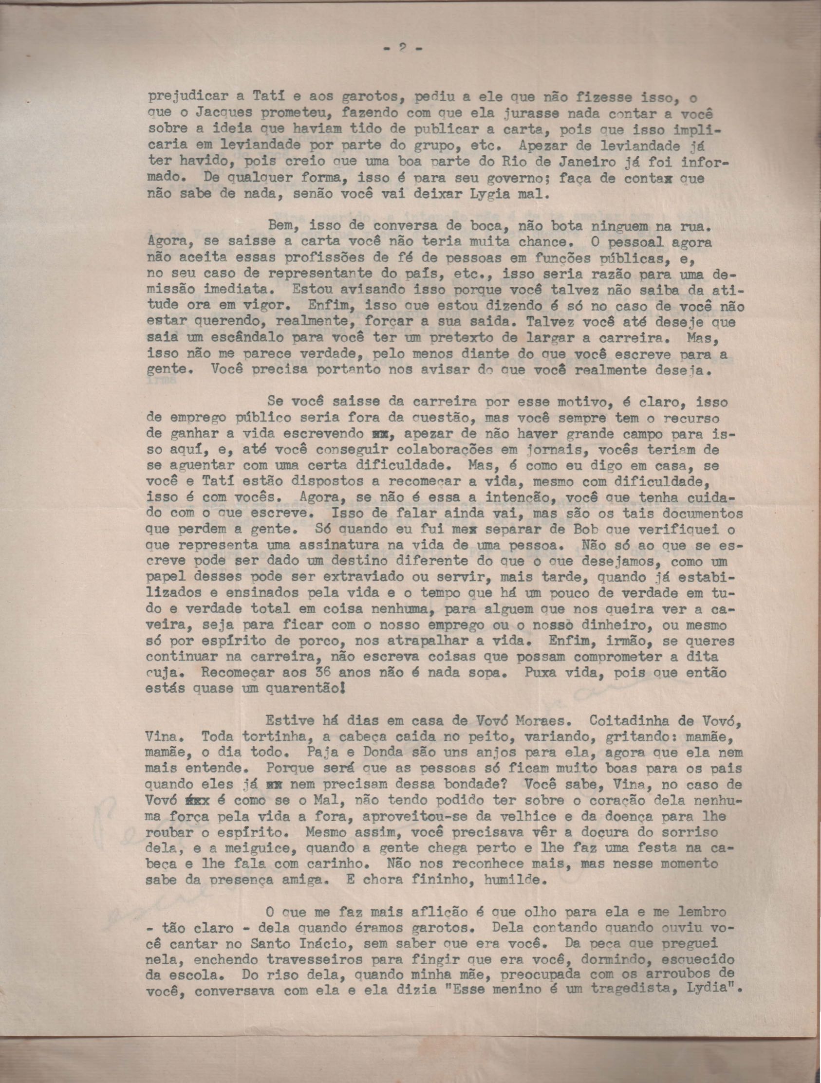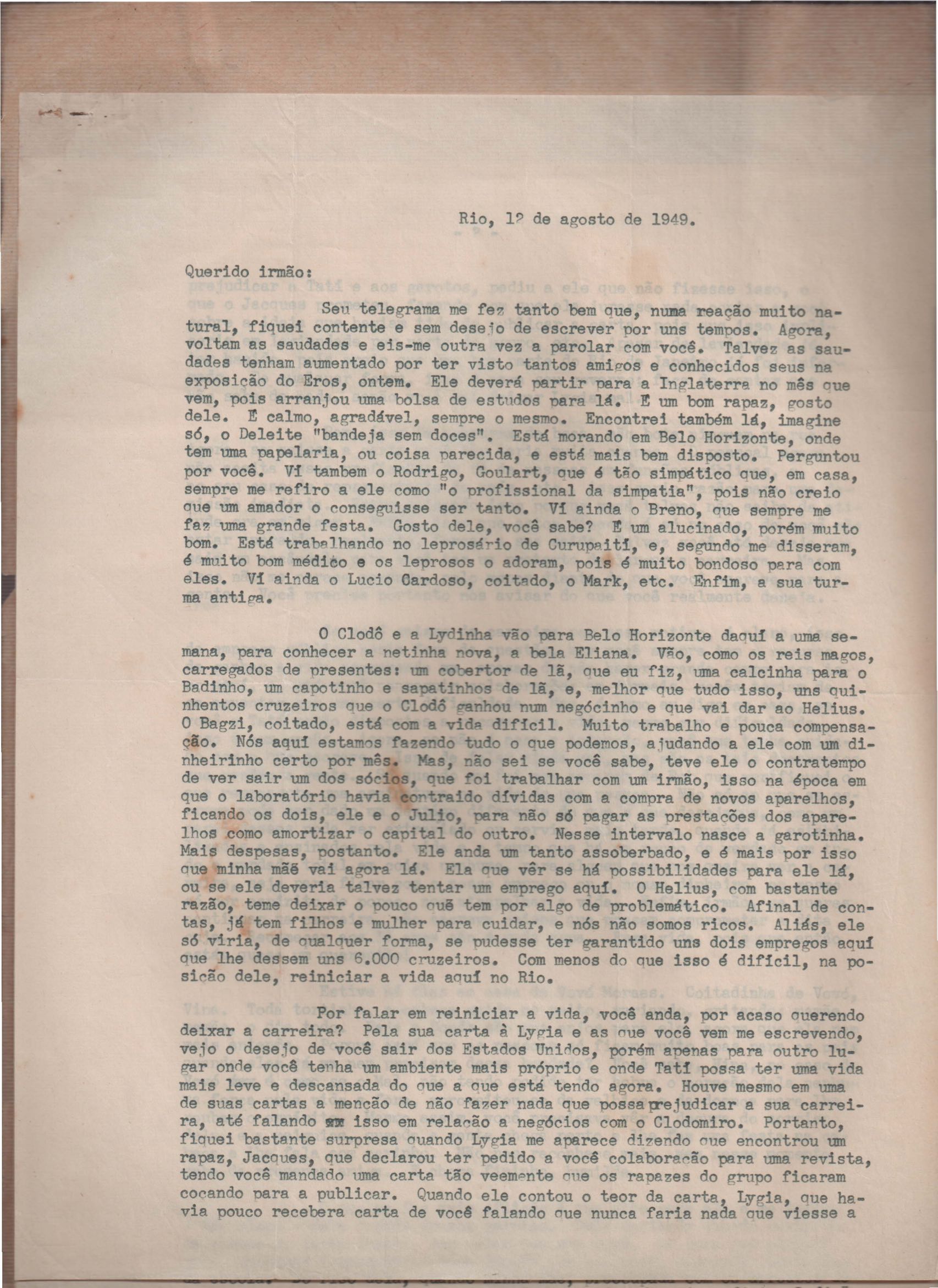 Notícias sobre a vida familiar. Considerações a respeito de pendências a serem resolvidas por VM. Comentário sobre a vida particular de seu irmão, Helius, e sobre a crise nos EUA durante a Guerra Fria. Felicitações pelo aniversário de VM. Comentários sobre o falecimento de seus pais, Clodoaldo Pereira da Silva Moraes e Lydia Cruz de Moraes. Notícias sobre o retorno de VM ao Brasil. Comentário sobre as obras Orfeu da Conceição e Poesia de carnaval e sobre amigos de VM: Aníbal Machado, Ênio da Silveira, Haroldo Tapajós, Irineu Garcia, John Mc Dowell, Mário Cabral, Maurício Fernandes, Otávio de Faria, Rodrigo Goulart, Pedro Nava, Tom Jobim entre outros. Comentário a respeito do livro [Caminho para a distância] voltar para o prelo. Menção à produção de um conto, "A lágrima", um soneto, "Judeu errante", e os poemas "Os inconsoláveis", "O bom-pastor", "A retirada", "A árvore da montanha" e "Desejo". Recomendações acerca de livros deixados por VM para serem enviados a Hecila Rodrigues de Brito. Solicitação para que Laetitia Cruz de Moraes leia o "Registro literário", de João Ribeiro, no Jornal do Brasil, e envie as críticas sobre o livro de VM. Pedido de comentário sobre os filmes: Caminho da vida, Cântico dos cânticos, Onde a terra acaba e The stranger’s return, do diretor King Vidor. Pedido de envio de algumas letras de músicas em inglês e valsas americanas. Preocupação a respeito das investidas em química, de seu irmão Helius de Moraes. Felicitações pelos 18 anos de Laetitia Cruz de Moraes. Referência a várias pessoas: Aníbal Machado, Antônia, Antônio Maria, Carlos Leão, Carlos Lacerda, Cristiano Machado, Décio de Moura, Fernando Filpo, Fernando Sabino, Getúlio Vargas, Helius de Moraes, Jane Russel, Joan Crawford, João Araújo Castro, Jorge Carvalho e Silva, Jorge Vargas de Andrade, Juan de La Cruz, Lydia Cruz de Moraes, Lygia Cruz de Moraes, Lúcia Proença Vargas, Maria Macedo Soares, Mário Cabral, Mário da Câmara, Mário Fernandes, Otávio de Faria, Paulo Mendes Campos, Paulo Soledade, Prudente de Morais Neto, Susana de Moraes Feinberg e Vinicius da Veiga. Lembranças a amigos e familiares. Considerações a respeito da infância. Manifestação de apoio à irmã, Laetitia Cruz de Moraes. Comentários sobre o pai, Clodoaldo Pereira da Silva Moraes. Notícias sobre o estado de saúde de VM. Referência a dois poemas escritos na Cachoeira de Maromba, em Itatiaia: "A queda" e "Legião dos úrias". Na carta de 4 nov. 1938, VM faz considerações a respeito de Beatriz de Azevedo de Mello de Moraes e fala sobre o seu casamento por procuração. Pedido de segredo absoluto sobre o assunto. Comentário sobre os estudos para o concurso do Itamaraty. Notícias sobre a gravidez de Tati de Moraes. Pedido de favor referente a assuntos bancários. Envio de procurações para os futuros recebimentos de salários de VM. Notícias sobre sua presença em festivais. Nomeação de VM para Secretário Geral da Comissão de Organização do I Festival de Cinema do Brasil. Felicitações pelo aniversário de seu pai, Clodoaldo Pereira da Silva Moraes. Notícias sobre seu trabalho. Recomendações sobre a publicação de artigos seus no Diário Carioca. Notícias sobre seu retorno ao Brasil. Intenção de levar a família para visitá-lo em Paris. Solicitação de despacho de objetos pessoais pelo Itamaraty. Sugestão de poemas seus para serem editados por Rubem Braga: "A legião dos úrias", "Ausência", "Ariana, a mulher", "A máscara da noite", "O cemitério na madrugada", "O desespero da piedade", "Elegia desesperada", "A vida vivida", "O tempo nos parques", "Balanço do filho morto", "Balada do Mangue", "O poeta e a lua", "Mensagem à poesia", "Poética", "Soneto de fidelidade", "Soneto de separação", "O dia da criação", "O riso" e "Balada dos mortos dos campos de concentração". Pedido de auxílio para resolver problemas bancários. Notícias sobre o programa feito para o Rio de Janeiro e São Paulo, com Sacha Gordine e Albert Camus, para divulgação do filme Orfeu negro. Recomendações a respeito de discos novos gravados que precisam ser registrados na SBACEM: "Bom dia tristeza", que Aracy de Almeida gravou, e várias gravações novas de "Se todos fossem iguais a você". Solicitação de envio dos poemas "Elegia da paz" e "Desastre de Lionel Marmier". Notícia do desaparecimento do Roteiro lírico e sentimental da cidade do Rio de Janeiro. Pedido de auxílio a Sette Câmara para ser removido para outro posto do Itamaraty, em Buenos Aires, Montevidéu ou Santiago. Referência a Claudio Santoro, para fazer uma ópera com o Orfeu da Conceição. Notícias de mudança para Montevidéu em 23 ago. 1957.