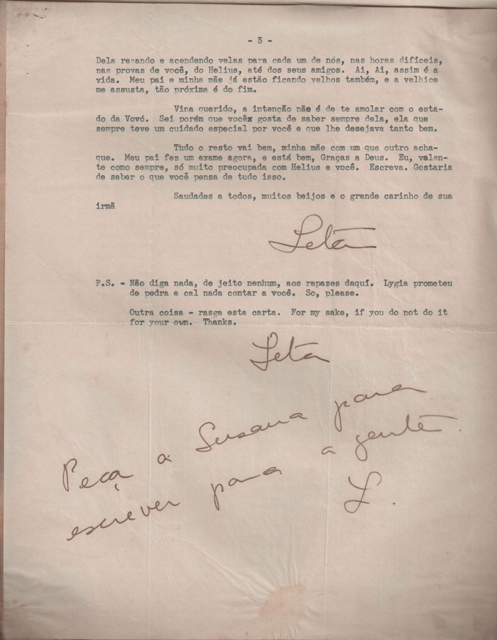 Correspondências entre VM e sua irmã, Laetitia Cruz de Moraes. Há cartas manchadas e sem data.