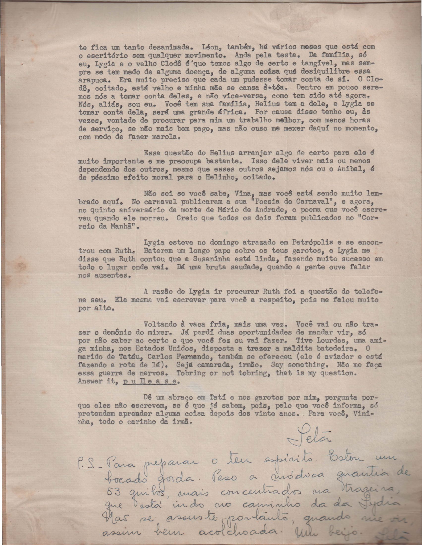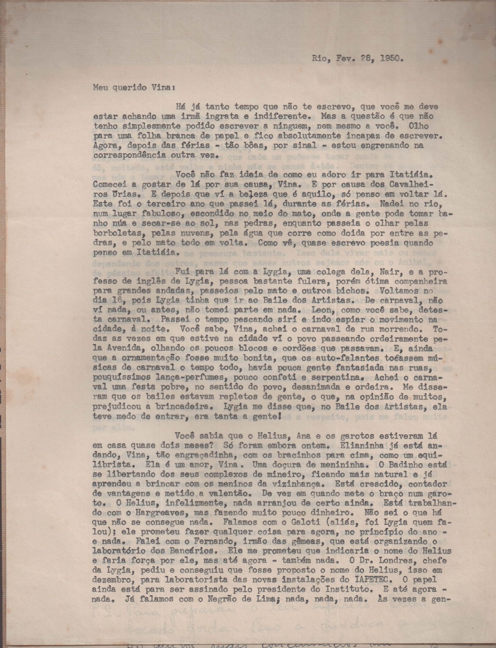 Notícias sobre a vida familiar. Considerações a respeito de pendências a serem resolvidas por VM. Comentário sobre a vida particular de seu irmão, Helius, e sobre a crise nos EUA durante a Guerra Fria. Felicitações pelo aniversário de VM. Comentários sobre o falecimento de seus pais, Clodoaldo Pereira da Silva Moraes e Lydia Cruz de Moraes. Notícias sobre o retorno de VM ao Brasil. Comentário sobre as obras Orfeu da Conceição e Poesia de carnaval e sobre amigos de VM: Aníbal Machado, Ênio da Silveira, Haroldo Tapajós, Irineu Garcia, John Mc Dowell, Mário Cabral, Maurício Fernandes, Otávio de Faria, Rodrigo Goulart, Pedro Nava, Tom Jobim entre outros. Comentário a respeito do livro [Caminho para a distância] voltar para o prelo. Menção à produção de um conto, "A lágrima", um soneto, "Judeu errante", e os poemas "Os inconsoláveis", "O bom-pastor", "A retirada", "A árvore da montanha" e "Desejo". Recomendações acerca de livros deixados por VM para serem enviados a Hecila Rodrigues de Brito. Solicitação para que Laetitia Cruz de Moraes leia o "Registro literário", de João Ribeiro, no Jornal do Brasil, e envie as críticas sobre o livro de VM. Pedido de comentário sobre os filmes: Caminho da vida, Cântico dos cânticos, Onde a terra acaba e The stranger’s return, do diretor King Vidor. Pedido de envio de algumas letras de músicas em inglês e valsas americanas. Preocupação a respeito das investidas em química, de seu irmão Helius de Moraes. Felicitações pelos 18 anos de Laetitia Cruz de Moraes. Referência a várias pessoas: Aníbal Machado, Antônia, Antônio Maria, Carlos Leão, Carlos Lacerda, Cristiano Machado, Décio de Moura, Fernando Filpo, Fernando Sabino, Getúlio Vargas, Helius de Moraes, Jane Russel, Joan Crawford, João Araújo Castro, Jorge Carvalho e Silva, Jorge Vargas de Andrade, Juan de La Cruz, Lydia Cruz de Moraes, Lygia Cruz de Moraes, Lúcia Proença Vargas, Maria Macedo Soares, Mário Cabral, Mário da Câmara, Mário Fernandes, Otávio de Faria, Paulo Mendes Campos, Paulo Soledade, Prudente de Morais Neto, Susana de Moraes Feinberg e Vinicius da Veiga. Lembranças a amigos e familiares. Considerações a respeito da infância. Manifestação de apoio à irmã, Laetitia Cruz de Moraes. Comentários sobre o pai, Clodoaldo Pereira da Silva Moraes. Notícias sobre o estado de saúde de VM. Referência a dois poemas escritos na Cachoeira de Maromba, em Itatiaia: "A queda" e "Legião dos úrias". Na carta de 4 nov. 1938, VM faz considerações a respeito de Beatriz de Azevedo de Mello de Moraes e fala sobre o seu casamento por procuração. Pedido de segredo absoluto sobre o assunto. Comentário sobre os estudos para o concurso do Itamaraty. Notícias sobre a gravidez de Tati de Moraes. Pedido de favor referente a assuntos bancários. Envio de procurações para os futuros recebimentos de salários de VM. Notícias sobre sua presença em festivais. Nomeação de VM para Secretário Geral da Comissão de Organização do I Festival de Cinema do Brasil. Felicitações pelo aniversário de seu pai, Clodoaldo Pereira da Silva Moraes. Notícias sobre seu trabalho. Recomendações sobre a publicação de artigos seus no Diário Carioca. Notícias sobre seu retorno ao Brasil. Intenção de levar a família para visitá-lo em Paris. Solicitação de despacho de objetos pessoais pelo Itamaraty. Sugestão de poemas seus para serem editados por Rubem Braga: "A legião dos úrias", "Ausência", "Ariana, a mulher", "A máscara da noite", "O cemitério na madrugada", "O desespero da piedade", "Elegia desesperada", "A vida vivida", "O tempo nos parques", "Balanço do filho morto", "Balada do Mangue", "O poeta e a lua", "Mensagem à poesia", "Poética", "Soneto de fidelidade", "Soneto de separação", "O dia da criação", "O riso" e "Balada dos mortos dos campos de concentração". Pedido de auxílio para resolver problemas bancários. Notícias sobre o programa feito para o Rio de Janeiro e São Paulo, com Sacha Gordine e Albert Camus, para divulgação do filme Orfeu negro. Recomendações a respeito de discos novos gravados que precisam ser registrados na SBACEM: "Bom dia tristeza", que Aracy de Almeida gravou, e várias gravações novas de "Se todos fossem iguais a você". Solicitação de envio dos poemas "Elegia da paz" e "Desastre de Lionel Marmier". Notícia do desaparecimento do Roteiro lírico e sentimental da cidade do Rio de Janeiro. Pedido de auxílio a Sette Câmara para ser removido para outro posto do Itamaraty, em Buenos Aires, Montevidéu ou Santiago. Referência a Claudio Santoro, para fazer uma ópera com o Orfeu da Conceição. Notícias de mudança para Montevidéu em 23 ago. 1957.
