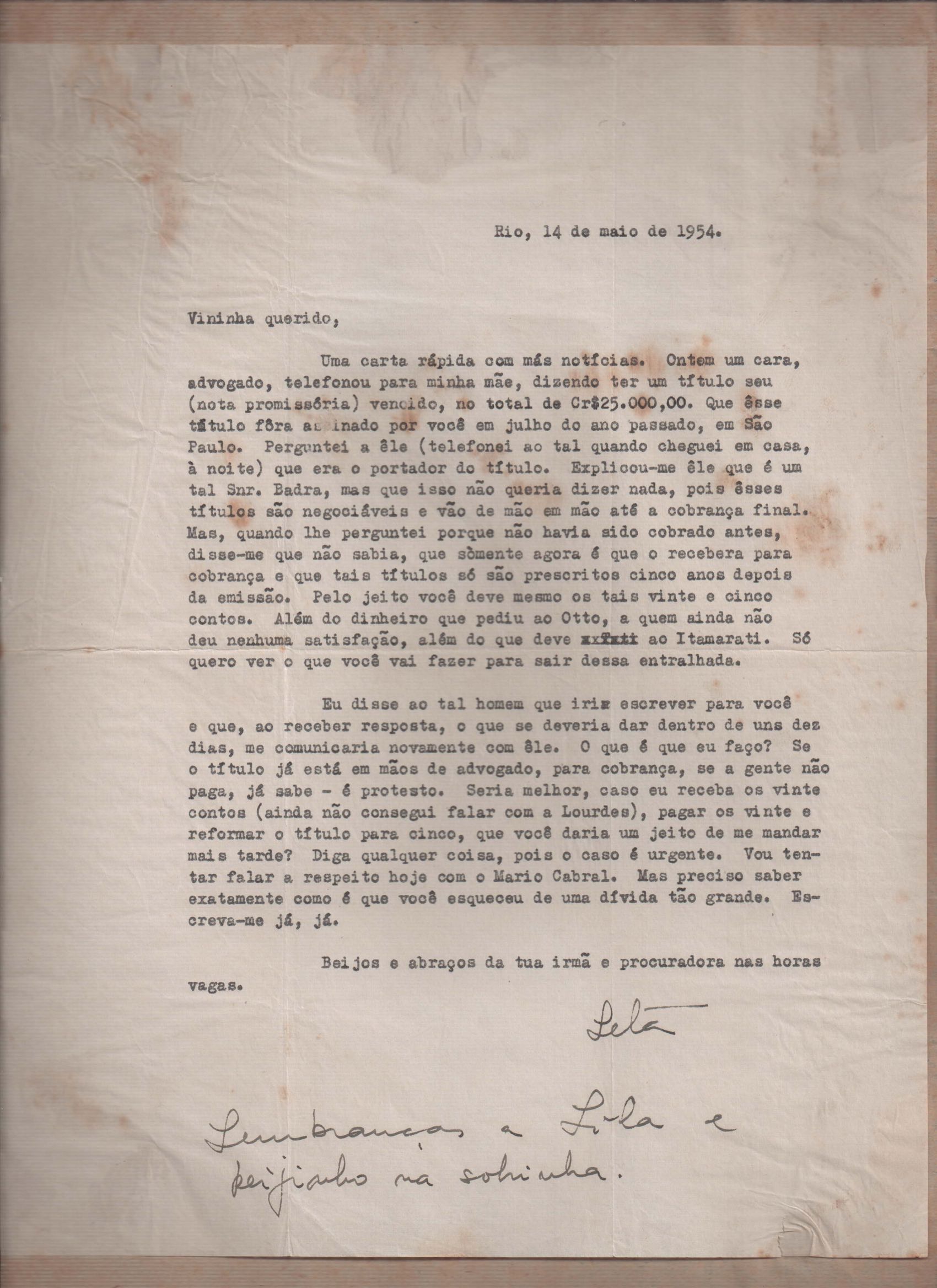 Notícias sobre a vida familiar. Considerações a respeito de pendências a serem resolvidas por VM. Comentário sobre a vida particular de seu irmão, Helius, e sobre a crise nos EUA durante a Guerra Fria. Felicitações pelo aniversário de VM. Comentários sobre o falecimento de seus pais, Clodoaldo Pereira da Silva Moraes e Lydia Cruz de Moraes. Notícias sobre o retorno de VM ao Brasil. Comentário sobre as obras Orfeu da Conceição e Poesia de carnaval e sobre amigos de VM: Aníbal Machado, Ênio da Silveira, Haroldo Tapajós, Irineu Garcia, John Mc Dowell, Mário Cabral, Maurício Fernandes, Otávio de Faria, Rodrigo Goulart, Pedro Nava, Tom Jobim entre outros. Comentário a respeito do livro [Caminho para a distância] voltar para o prelo. Menção à produção de um conto, "A lágrima", um soneto, "Judeu errante", e os poemas "Os inconsoláveis", "O bom-pastor", "A retirada", "A árvore da montanha" e "Desejo". Recomendações acerca de livros deixados por VM para serem enviados a Hecila Rodrigues de Brito. Solicitação para que Laetitia Cruz de Moraes leia o "Registro literário", de João Ribeiro, no Jornal do Brasil, e envie as críticas sobre o livro de VM. Pedido de comentário sobre os filmes: Caminho da vida, Cântico dos cânticos, Onde a terra acaba e The stranger’s return, do diretor King Vidor. Pedido de envio de algumas letras de músicas em inglês e valsas americanas. Preocupação a respeito das investidas em química, de seu irmão Helius de Moraes. Felicitações pelos 18 anos de Laetitia Cruz de Moraes. Referência a várias pessoas: Aníbal Machado, Antônia, Antônio Maria, Carlos Leão, Carlos Lacerda, Cristiano Machado, Décio de Moura, Fernando Filpo, Fernando Sabino, Getúlio Vargas, Helius de Moraes, Jane Russel, Joan Crawford, João Araújo Castro, Jorge Carvalho e Silva, Jorge Vargas de Andrade, Juan de La Cruz, Lydia Cruz de Moraes, Lygia Cruz de Moraes, Lúcia Proença Vargas, Maria Macedo Soares, Mário Cabral, Mário da Câmara, Mário Fernandes, Otávio de Faria, Paulo Mendes Campos, Paulo Soledade, Prudente de Morais Neto, Susana de Moraes Feinberg e Vinicius da Veiga. Lembranças a amigos e familiares. Considerações a respeito da infância. Manifestação de apoio à irmã, Laetitia Cruz de Moraes. Comentários sobre o pai, Clodoaldo Pereira da Silva Moraes. Notícias sobre o estado de saúde de VM. Referência a dois poemas escritos na Cachoeira de Maromba, em Itatiaia: "A queda" e "Legião dos úrias". Na carta de 4 nov. 1938, VM faz considerações a respeito de Beatriz de Azevedo de Mello de Moraes e fala sobre o seu casamento por procuração. Pedido de segredo absoluto sobre o assunto. Comentário sobre os estudos para o concurso do Itamaraty. Notícias sobre a gravidez de Tati de Moraes. Pedido de favor referente a assuntos bancários. Envio de procurações para os futuros recebimentos de salários de VM. Notícias sobre sua presença em festivais. Nomeação de VM para Secretário Geral da Comissão de Organização do I Festival de Cinema do Brasil. Felicitações pelo aniversário de seu pai, Clodoaldo Pereira da Silva Moraes. Notícias sobre seu trabalho. Recomendações sobre a publicação de artigos seus no Diário Carioca. Notícias sobre seu retorno ao Brasil. Intenção de levar a família para visitá-lo em Paris. Solicitação de despacho de objetos pessoais pelo Itamaraty. Sugestão de poemas seus para serem editados por Rubem Braga: "A legião dos úrias", "Ausência", "Ariana, a mulher", "A máscara da noite", "O cemitério na madrugada", "O desespero da piedade", "Elegia desesperada", "A vida vivida", "O tempo nos parques", "Balanço do filho morto", "Balada do Mangue", "O poeta e a lua", "Mensagem à poesia", "Poética", "Soneto de fidelidade", "Soneto de separação", "O dia da criação", "O riso" e "Balada dos mortos dos campos de concentração". Pedido de auxílio para resolver problemas bancários. Notícias sobre o programa feito para o Rio de Janeiro e São Paulo, com Sacha Gordine e Albert Camus, para divulgação do filme Orfeu negro. Recomendações a respeito de discos novos gravados que precisam ser registrados na SBACEM: "Bom dia tristeza", que Aracy de Almeida gravou, e várias gravações novas de "Se todos fossem iguais a você". Solicitação de envio dos poemas "Elegia da paz" e "Desastre de Lionel Marmier". Notícia do desaparecimento do Roteiro lírico e sentimental da cidade do Rio de Janeiro. Pedido de auxílio a Sette Câmara para ser removido para outro posto do Itamaraty, em Buenos Aires, Montevidéu ou Santiago. Referência a Claudio Santoro, para fazer uma ópera com o Orfeu da Conceição. Notícias de mudança para Montevidéu em 23 ago. 1957.