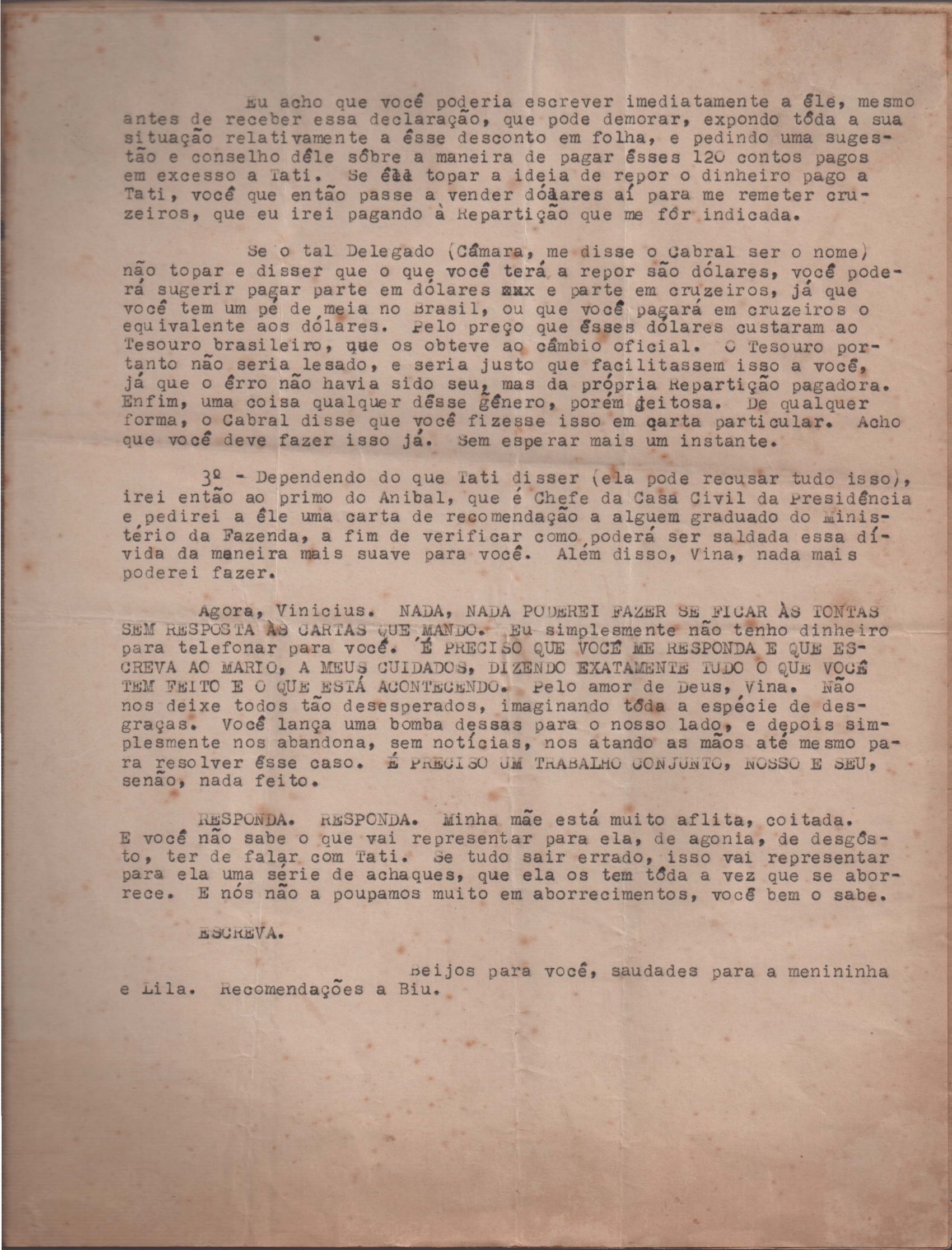 Notícias sobre a vida familiar. Considerações a respeito de pendências a serem resolvidas por VM. Comentário sobre a vida particular de seu irmão, Helius, e sobre a crise nos EUA durante a Guerra Fria. Felicitações pelo aniversário de VM. Comentários sobre o falecimento de seus pais, Clodoaldo Pereira da Silva Moraes e Lydia Cruz de Moraes. Notícias sobre o retorno de VM ao Brasil. Comentário sobre as obras Orfeu da Conceição e Poesia de carnaval e sobre amigos de VM: Aníbal Machado, Ênio da Silveira, Haroldo Tapajós, Irineu Garcia, John Mc Dowell, Mário Cabral, Maurício Fernandes, Otávio de Faria, Rodrigo Goulart, Pedro Nava, Tom Jobim entre outros. Comentário a respeito do livro [Caminho para a distância] voltar para o prelo. Menção à produção de um conto, "A lágrima", um soneto, "Judeu errante", e os poemas "Os inconsoláveis", "O bom-pastor", "A retirada", "A árvore da montanha" e "Desejo". Recomendações acerca de livros deixados por VM para serem enviados a Hecila Rodrigues de Brito. Solicitação para que Laetitia Cruz de Moraes leia o "Registro literário", de João Ribeiro, no Jornal do Brasil, e envie as críticas sobre o livro de VM. Pedido de comentário sobre os filmes: Caminho da vida, Cântico dos cânticos, Onde a terra acaba e The stranger’s return, do diretor King Vidor. Pedido de envio de algumas letras de músicas em inglês e valsas americanas. Preocupação a respeito das investidas em química, de seu irmão Helius de Moraes. Felicitações pelos 18 anos de Laetitia Cruz de Moraes. Referência a várias pessoas: Aníbal Machado, Antônia, Antônio Maria, Carlos Leão, Carlos Lacerda, Cristiano Machado, Décio de Moura, Fernando Filpo, Fernando Sabino, Getúlio Vargas, Helius de Moraes, Jane Russel, Joan Crawford, João Araújo Castro, Jorge Carvalho e Silva, Jorge Vargas de Andrade, Juan de La Cruz, Lydia Cruz de Moraes, Lygia Cruz de Moraes, Lúcia Proença Vargas, Maria Macedo Soares, Mário Cabral, Mário da Câmara, Mário Fernandes, Otávio de Faria, Paulo Mendes Campos, Paulo Soledade, Prudente de Morais Neto, Susana de Moraes Feinberg e Vinicius da Veiga. Lembranças a amigos e familiares. Considerações a respeito da infância. Manifestação de apoio à irmã, Laetitia Cruz de Moraes. Comentários sobre o pai, Clodoaldo Pereira da Silva Moraes. Notícias sobre o estado de saúde de VM. Referência a dois poemas escritos na Cachoeira de Maromba, em Itatiaia: "A queda" e "Legião dos úrias". Na carta de 4 nov. 1938, VM faz considerações a respeito de Beatriz de Azevedo de Mello de Moraes e fala sobre o seu casamento por procuração. Pedido de segredo absoluto sobre o assunto. Comentário sobre os estudos para o concurso do Itamaraty. Notícias sobre a gravidez de Tati de Moraes. Pedido de favor referente a assuntos bancários. Envio de procurações para os futuros recebimentos de salários de VM. Notícias sobre sua presença em festivais. Nomeação de VM para Secretário Geral da Comissão de Organização do I Festival de Cinema do Brasil. Felicitações pelo aniversário de seu pai, Clodoaldo Pereira da Silva Moraes. Notícias sobre seu trabalho. Recomendações sobre a publicação de artigos seus no Diário Carioca. Notícias sobre seu retorno ao Brasil. Intenção de levar a família para visitá-lo em Paris. Solicitação de despacho de objetos pessoais pelo Itamaraty. Sugestão de poemas seus para serem editados por Rubem Braga: "A legião dos úrias", "Ausência", "Ariana, a mulher", "A máscara da noite", "O cemitério na madrugada", "O desespero da piedade", "Elegia desesperada", "A vida vivida", "O tempo nos parques", "Balanço do filho morto", "Balada do Mangue", "O poeta e a lua", "Mensagem à poesia", "Poética", "Soneto de fidelidade", "Soneto de separação", "O dia da criação", "O riso" e "Balada dos mortos dos campos de concentração". Pedido de auxílio para resolver problemas bancários. Notícias sobre o programa feito para o Rio de Janeiro e São Paulo, com Sacha Gordine e Albert Camus, para divulgação do filme Orfeu negro. Recomendações a respeito de discos novos gravados que precisam ser registrados na SBACEM: "Bom dia tristeza", que Aracy de Almeida gravou, e várias gravações novas de "Se todos fossem iguais a você". Solicitação de envio dos poemas "Elegia da paz" e "Desastre de Lionel Marmier". Notícia do desaparecimento do Roteiro lírico e sentimental da cidade do Rio de Janeiro. Pedido de auxílio a Sette Câmara para ser removido para outro posto do Itamaraty, em Buenos Aires, Montevidéu ou Santiago. Referência a Claudio Santoro, para fazer uma ópera com o Orfeu da Conceição. Notícias de mudança para Montevidéu em 23 ago. 1957.