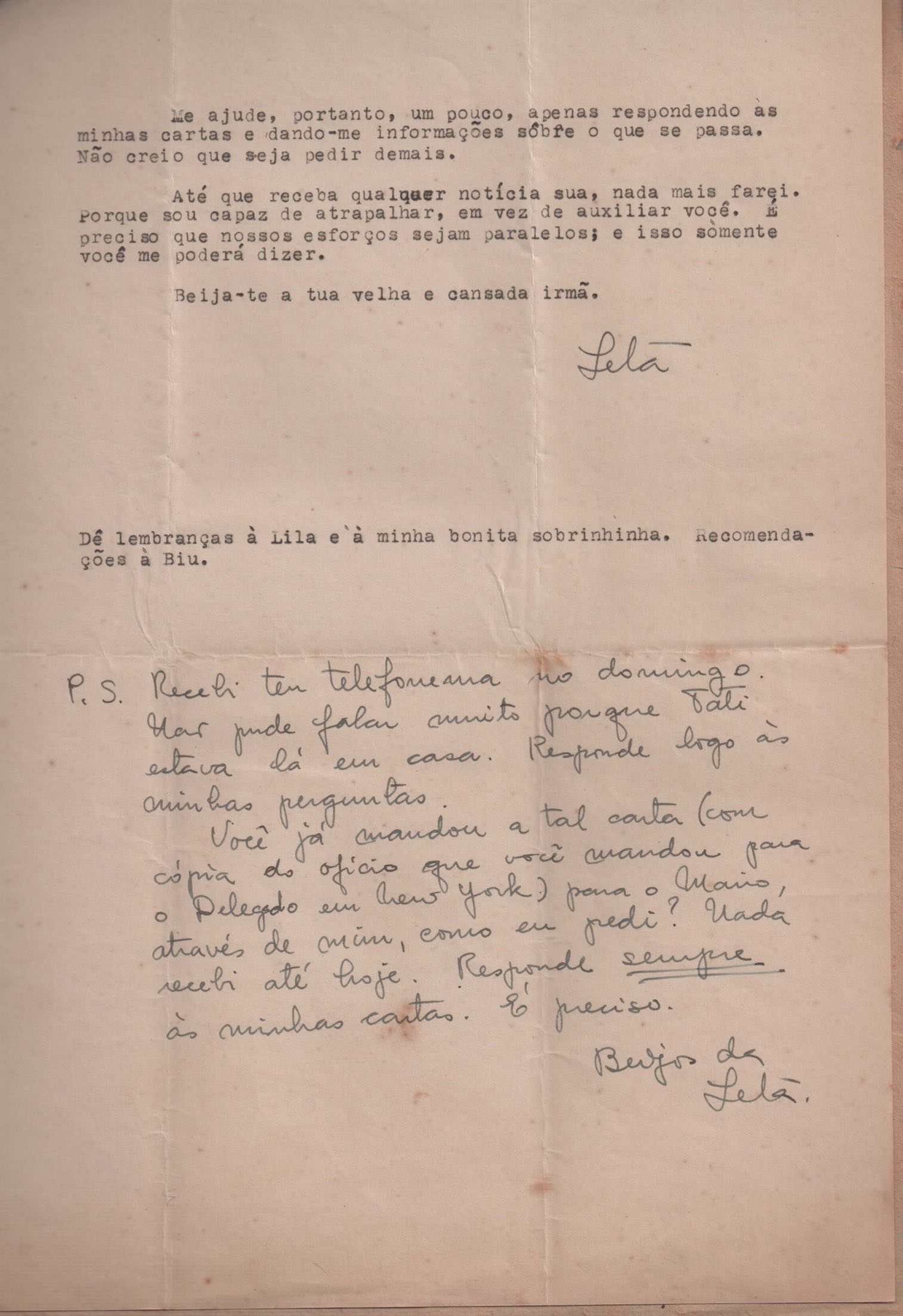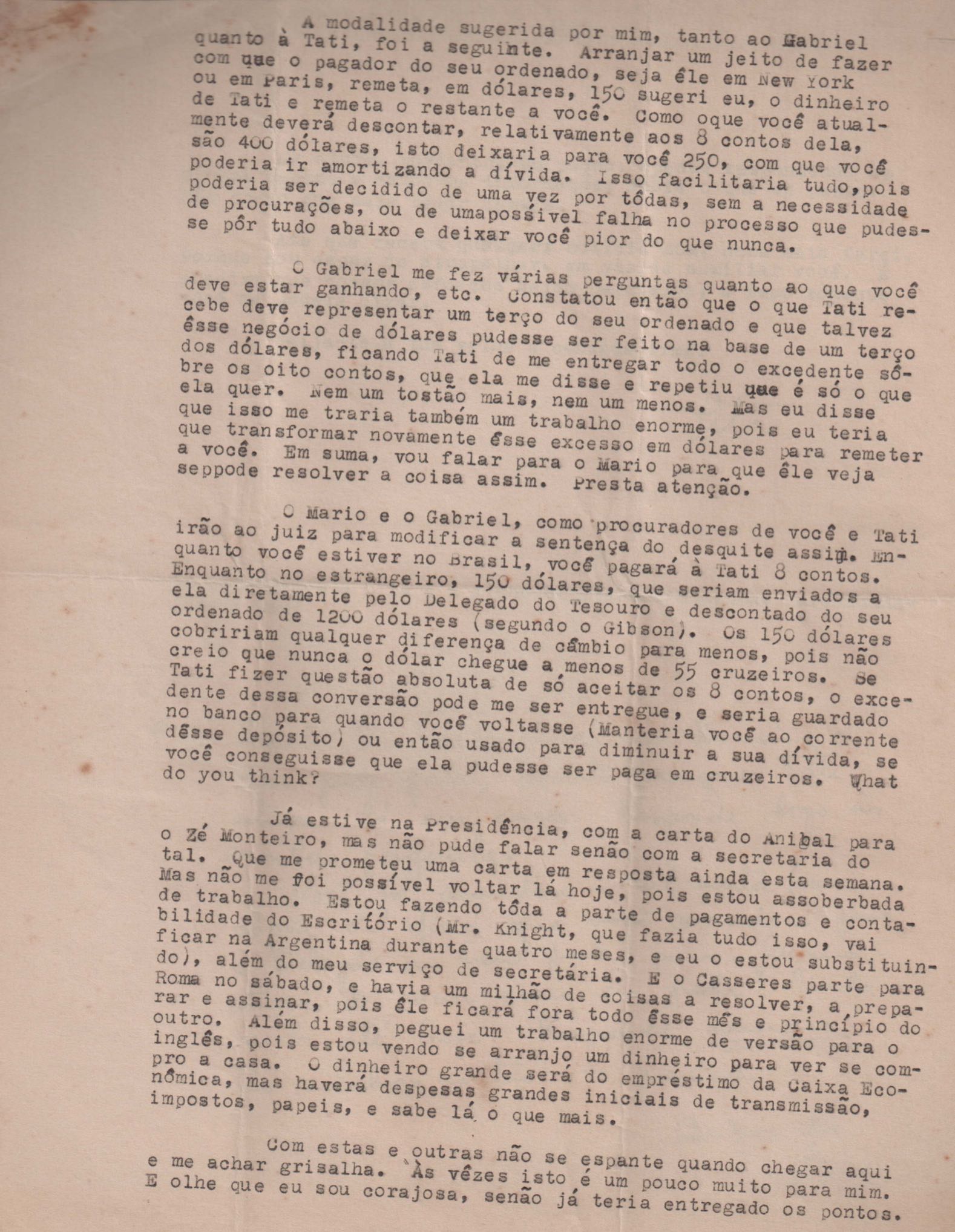 Notícias sobre a vida familiar. Considerações a respeito de pendências a serem resolvidas por VM. Comentário sobre a vida particular de seu irmão, Helius, e sobre a crise nos EUA durante a Guerra Fria. Felicitações pelo aniversário de VM. Comentários sobre o falecimento de seus pais, Clodoaldo Pereira da Silva Moraes e Lydia Cruz de Moraes. Notícias sobre o retorno de VM ao Brasil. Comentário sobre as obras Orfeu da Conceição e Poesia de carnaval e sobre amigos de VM: Aníbal Machado, Ênio da Silveira, Haroldo Tapajós, Irineu Garcia, John Mc Dowell, Mário Cabral, Maurício Fernandes, Otávio de Faria, Rodrigo Goulart, Pedro Nava, Tom Jobim entre outros. Comentário a respeito do livro [Caminho para a distância] voltar para o prelo. Menção à produção de um conto, "A lágrima", um soneto, "Judeu errante", e os poemas "Os inconsoláveis", "O bom-pastor", "A retirada", "A árvore da montanha" e "Desejo". Recomendações acerca de livros deixados por VM para serem enviados a Hecila Rodrigues de Brito. Solicitação para que Laetitia Cruz de Moraes leia o "Registro literário", de João Ribeiro, no Jornal do Brasil, e envie as críticas sobre o livro de VM. Pedido de comentário sobre os filmes: Caminho da vida, Cântico dos cânticos, Onde a terra acaba e The stranger’s return, do diretor King Vidor. Pedido de envio de algumas letras de músicas em inglês e valsas americanas. Preocupação a respeito das investidas em química, de seu irmão Helius de Moraes. Felicitações pelos 18 anos de Laetitia Cruz de Moraes. Referência a várias pessoas: Aníbal Machado, Antônia, Antônio Maria, Carlos Leão, Carlos Lacerda, Cristiano Machado, Décio de Moura, Fernando Filpo, Fernando Sabino, Getúlio Vargas, Helius de Moraes, Jane Russel, Joan Crawford, João Araújo Castro, Jorge Carvalho e Silva, Jorge Vargas de Andrade, Juan de La Cruz, Lydia Cruz de Moraes, Lygia Cruz de Moraes, Lúcia Proença Vargas, Maria Macedo Soares, Mário Cabral, Mário da Câmara, Mário Fernandes, Otávio de Faria, Paulo Mendes Campos, Paulo Soledade, Prudente de Morais Neto, Susana de Moraes Feinberg e Vinicius da Veiga. Lembranças a amigos e familiares. Considerações a respeito da infância. Manifestação de apoio à irmã, Laetitia Cruz de Moraes. Comentários sobre o pai, Clodoaldo Pereira da Silva Moraes. Notícias sobre o estado de saúde de VM. Referência a dois poemas escritos na Cachoeira de Maromba, em Itatiaia: "A queda" e "Legião dos úrias". Na carta de 4 nov. 1938, VM faz considerações a respeito de Beatriz de Azevedo de Mello de Moraes e fala sobre o seu casamento por procuração. Pedido de segredo absoluto sobre o assunto. Comentário sobre os estudos para o concurso do Itamaraty. Notícias sobre a gravidez de Tati de Moraes. Pedido de favor referente a assuntos bancários. Envio de procurações para os futuros recebimentos de salários de VM. Notícias sobre sua presença em festivais. Nomeação de VM para Secretário Geral da Comissão de Organização do I Festival de Cinema do Brasil. Felicitações pelo aniversário de seu pai, Clodoaldo Pereira da Silva Moraes. Notícias sobre seu trabalho. Recomendações sobre a publicação de artigos seus no Diário Carioca. Notícias sobre seu retorno ao Brasil. Intenção de levar a família para visitá-lo em Paris. Solicitação de despacho de objetos pessoais pelo Itamaraty. Sugestão de poemas seus para serem editados por Rubem Braga: "A legião dos úrias", "Ausência", "Ariana, a mulher", "A máscara da noite", "O cemitério na madrugada", "O desespero da piedade", "Elegia desesperada", "A vida vivida", "O tempo nos parques", "Balanço do filho morto", "Balada do Mangue", "O poeta e a lua", "Mensagem à poesia", "Poética", "Soneto de fidelidade", "Soneto de separação", "O dia da criação", "O riso" e "Balada dos mortos dos campos de concentração". Pedido de auxílio para resolver problemas bancários. Notícias sobre o programa feito para o Rio de Janeiro e São Paulo, com Sacha Gordine e Albert Camus, para divulgação do filme Orfeu negro. Recomendações a respeito de discos novos gravados que precisam ser registrados na SBACEM: "Bom dia tristeza", que Aracy de Almeida gravou, e várias gravações novas de "Se todos fossem iguais a você". Solicitação de envio dos poemas "Elegia da paz" e "Desastre de Lionel Marmier". Notícia do desaparecimento do Roteiro lírico e sentimental da cidade do Rio de Janeiro. Pedido de auxílio a Sette Câmara para ser removido para outro posto do Itamaraty, em Buenos Aires, Montevidéu ou Santiago. Referência a Claudio Santoro, para fazer uma ópera com o Orfeu da Conceição. Notícias de mudança para Montevidéu em 23 ago. 1957.