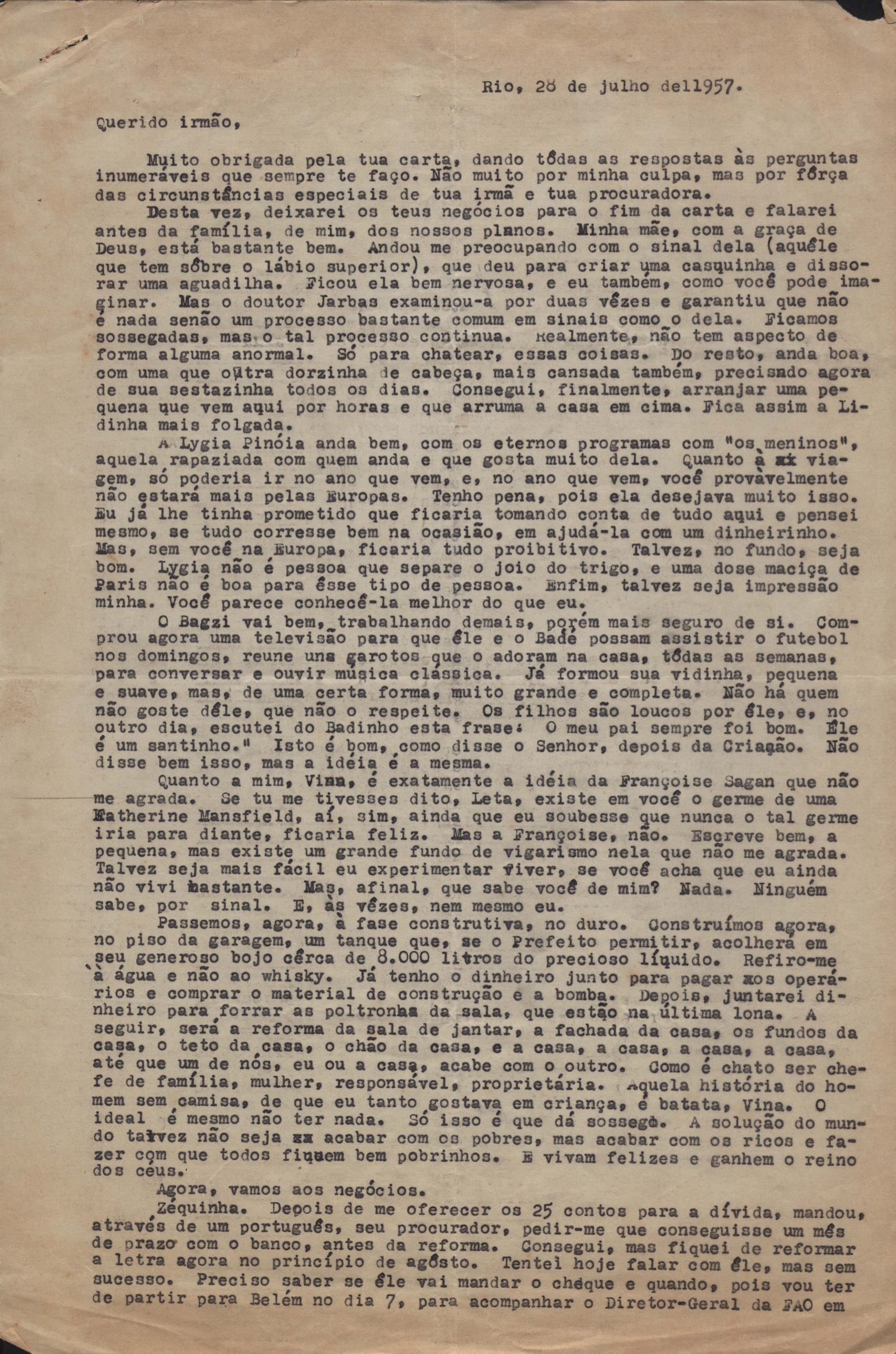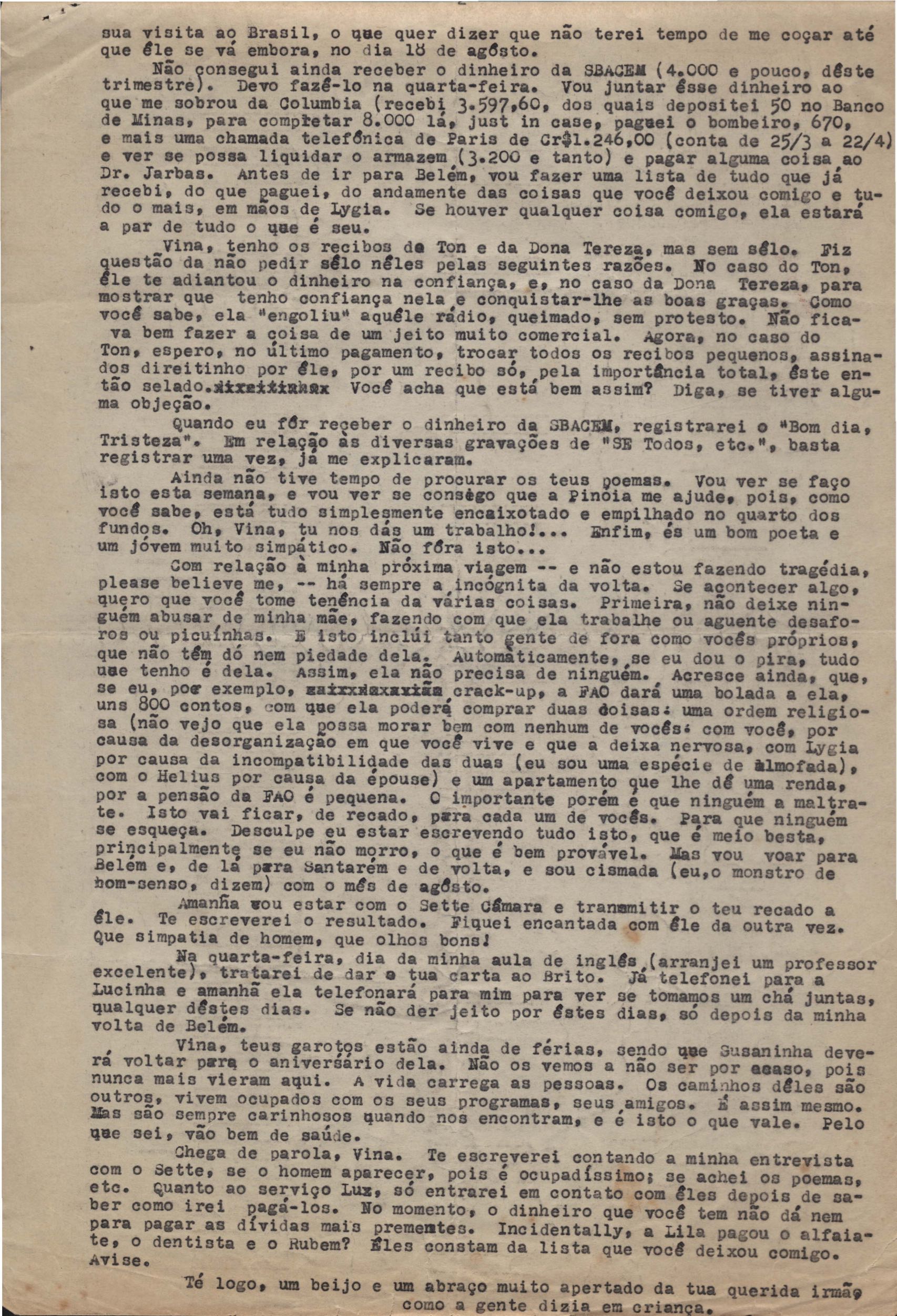 Notícias sobre a vida familiar. Considerações a respeito de pendências a serem resolvidas por VM. Comentário sobre a vida particular de seu irmão, Helius, e sobre a crise nos EUA durante a Guerra Fria. Felicitações pelo aniversário de VM. Comentários sobre o falecimento de seus pais, Clodoaldo Pereira da Silva Moraes e Lydia Cruz de Moraes. Notícias sobre o retorno de VM ao Brasil. Comentário sobre as obras Orfeu da Conceição e Poesia de carnaval e sobre amigos de VM: Aníbal Machado, Ênio da Silveira, Haroldo Tapajós, Irineu Garcia, John Mc Dowell, Mário Cabral, Maurício Fernandes, Otávio de Faria, Rodrigo Goulart, Pedro Nava, Tom Jobim entre outros. Comentário a respeito do livro [Caminho para a distância] voltar para o prelo. Menção à produção de um conto, "A lágrima", um soneto, "Judeu errante", e os poemas "Os inconsoláveis", "O bom-pastor", "A retirada", "A árvore da montanha" e "Desejo". Recomendações acerca de livros deixados por VM para serem enviados a Hecila Rodrigues de Brito. Solicitação para que Laetitia Cruz de Moraes leia o "Registro literário", de João Ribeiro, no Jornal do Brasil, e envie as críticas sobre o livro de VM. Pedido de comentário sobre os filmes: Caminho da vida, Cântico dos cânticos, Onde a terra acaba e The stranger’s return, do diretor King Vidor. Pedido de envio de algumas letras de músicas em inglês e valsas americanas. Preocupação a respeito das investidas em química, de seu irmão Helius de Moraes. Felicitações pelos 18 anos de Laetitia Cruz de Moraes. Referência a várias pessoas: Aníbal Machado, Antônia, Antônio Maria, Carlos Leão, Carlos Lacerda, Cristiano Machado, Décio de Moura, Fernando Filpo, Fernando Sabino, Getúlio Vargas, Helius de Moraes, Jane Russel, Joan Crawford, João Araújo Castro, Jorge Carvalho e Silva, Jorge Vargas de Andrade, Juan de La Cruz, Lydia Cruz de Moraes, Lygia Cruz de Moraes, Lúcia Proença Vargas, Maria Macedo Soares, Mário Cabral, Mário da Câmara, Mário Fernandes, Otávio de Faria, Paulo Mendes Campos, Paulo Soledade, Prudente de Morais Neto, Susana de Moraes Feinberg e Vinicius da Veiga. Lembranças a amigos e familiares. Considerações a respeito da infância. Manifestação de apoio à irmã, Laetitia Cruz de Moraes. Comentários sobre o pai, Clodoaldo Pereira da Silva Moraes. Notícias sobre o estado de saúde de VM. Referência a dois poemas escritos na Cachoeira de Maromba, em Itatiaia: "A queda" e "Legião dos úrias". Na carta de 4 nov. 1938, VM faz considerações a respeito de Beatriz de Azevedo de Mello de Moraes e fala sobre o seu casamento por procuração. Pedido de segredo absoluto sobre o assunto. Comentário sobre os estudos para o concurso do Itamaraty. Notícias sobre a gravidez de Tati de Moraes. Pedido de favor referente a assuntos bancários. Envio de procurações para os futuros recebimentos de salários de VM. Notícias sobre sua presença em festivais. Nomeação de VM para Secretário Geral da Comissão de Organização do I Festival de Cinema do Brasil. Felicitações pelo aniversário de seu pai, Clodoaldo Pereira da Silva Moraes. Notícias sobre seu trabalho. Recomendações sobre a publicação de artigos seus no Diário Carioca. Notícias sobre seu retorno ao Brasil. Intenção de levar a família para visitá-lo em Paris. Solicitação de despacho de objetos pessoais pelo Itamaraty. Sugestão de poemas seus para serem editados por Rubem Braga: "A legião dos úrias", "Ausência", "Ariana, a mulher", "A máscara da noite", "O cemitério na madrugada", "O desespero da piedade", "Elegia desesperada", "A vida vivida", "O tempo nos parques", "Balanço do filho morto", "Balada do Mangue", "O poeta e a lua", "Mensagem à poesia", "Poética", "Soneto de fidelidade", "Soneto de separação", "O dia da criação", "O riso" e "Balada dos mortos dos campos de concentração". Pedido de auxílio para resolver problemas bancários. Notícias sobre o programa feito para o Rio de Janeiro e São Paulo, com Sacha Gordine e Albert Camus, para divulgação do filme Orfeu negro. Recomendações a respeito de discos novos gravados que precisam ser registrados na SBACEM: "Bom dia tristeza", que Aracy de Almeida gravou, e várias gravações novas de "Se todos fossem iguais a você". Solicitação de envio dos poemas "Elegia da paz" e "Desastre de Lionel Marmier". Notícia do desaparecimento do Roteiro lírico e sentimental da cidade do Rio de Janeiro. Pedido de auxílio a Sette Câmara para ser removido para outro posto do Itamaraty, em Buenos Aires, Montevidéu ou Santiago. Referência a Claudio Santoro, para fazer uma ópera com o Orfeu da Conceição. Notícias de mudança para Montevidéu em 23 ago. 1957.