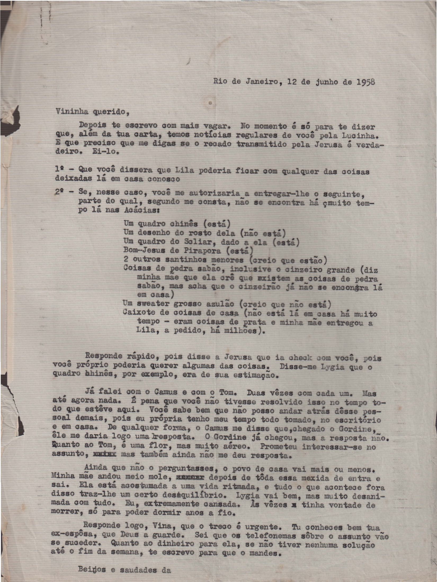 Notícias sobre a vida familiar. Considerações a respeito de pendências a serem resolvidas por VM. Comentário sobre a vida particular de seu irmão, Helius, e sobre a crise nos EUA durante a Guerra Fria. Felicitações pelo aniversário de VM. Comentários sobre o falecimento de seus pais, Clodoaldo Pereira da Silva Moraes e Lydia Cruz de Moraes. Notícias sobre o retorno de VM ao Brasil. Comentário sobre as obras Orfeu da Conceição e Poesia de carnaval e sobre amigos de VM: Aníbal Machado, Ênio da Silveira, Haroldo Tapajós, Irineu Garcia, John Mc Dowell, Mário Cabral, Maurício Fernandes, Otávio de Faria, Rodrigo Goulart, Pedro Nava, Tom Jobim entre outros. Comentário a respeito do livro [Caminho para a distância] voltar para o prelo. Menção à produção de um conto, "A lágrima", um soneto, "Judeu errante", e os poemas "Os inconsoláveis", "O bom-pastor", "A retirada", "A árvore da montanha" e "Desejo". Recomendações acerca de livros deixados por VM para serem enviados a Hecila Rodrigues de Brito. Solicitação para que Laetitia Cruz de Moraes leia o "Registro literário", de João Ribeiro, no Jornal do Brasil, e envie as críticas sobre o livro de VM. Pedido de comentário sobre os filmes: Caminho da vida, Cântico dos cânticos, Onde a terra acaba e The stranger’s return, do diretor King Vidor. Pedido de envio de algumas letras de músicas em inglês e valsas americanas. Preocupação a respeito das investidas em química, de seu irmão Helius de Moraes. Felicitações pelos 18 anos de Laetitia Cruz de Moraes. Referência a várias pessoas: Aníbal Machado, Antônia, Antônio Maria, Carlos Leão, Carlos Lacerda, Cristiano Machado, Décio de Moura, Fernando Filpo, Fernando Sabino, Getúlio Vargas, Helius de Moraes, Jane Russel, Joan Crawford, João Araújo Castro, Jorge Carvalho e Silva, Jorge Vargas de Andrade, Juan de La Cruz, Lydia Cruz de Moraes, Lygia Cruz de Moraes, Lúcia Proença Vargas, Maria Macedo Soares, Mário Cabral, Mário da Câmara, Mário Fernandes, Otávio de Faria, Paulo Mendes Campos, Paulo Soledade, Prudente de Morais Neto, Susana de Moraes Feinberg e Vinicius da Veiga. Lembranças a amigos e familiares. Considerações a respeito da infância. Manifestação de apoio à irmã, Laetitia Cruz de Moraes. Comentários sobre o pai, Clodoaldo Pereira da Silva Moraes. Notícias sobre o estado de saúde de VM. Referência a dois poemas escritos na Cachoeira de Maromba, em Itatiaia: "A queda" e "Legião dos úrias". Na carta de 4 nov. 1938, VM faz considerações a respeito de Beatriz de Azevedo de Mello de Moraes e fala sobre o seu casamento por procuração. Pedido de segredo absoluto sobre o assunto. Comentário sobre os estudos para o concurso do Itamaraty. Notícias sobre a gravidez de Tati de Moraes. Pedido de favor referente a assuntos bancários. Envio de procurações para os futuros recebimentos de salários de VM. Notícias sobre sua presença em festivais. Nomeação de VM para Secretário Geral da Comissão de Organização do I Festival de Cinema do Brasil. Felicitações pelo aniversário de seu pai, Clodoaldo Pereira da Silva Moraes. Notícias sobre seu trabalho. Recomendações sobre a publicação de artigos seus no Diário Carioca. Notícias sobre seu retorno ao Brasil. Intenção de levar a família para visitá-lo em Paris. Solicitação de despacho de objetos pessoais pelo Itamaraty. Sugestão de poemas seus para serem editados por Rubem Braga: "A legião dos úrias", "Ausência", "Ariana, a mulher", "A máscara da noite", "O cemitério na madrugada", "O desespero da piedade", "Elegia desesperada", "A vida vivida", "O tempo nos parques", "Balanço do filho morto", "Balada do Mangue", "O poeta e a lua", "Mensagem à poesia", "Poética", "Soneto de fidelidade", "Soneto de separação", "O dia da criação", "O riso" e "Balada dos mortos dos campos de concentração". Pedido de auxílio para resolver problemas bancários. Notícias sobre o programa feito para o Rio de Janeiro e São Paulo, com Sacha Gordine e Albert Camus, para divulgação do filme Orfeu negro. Recomendações a respeito de discos novos gravados que precisam ser registrados na SBACEM: "Bom dia tristeza", que Aracy de Almeida gravou, e várias gravações novas de "Se todos fossem iguais a você". Solicitação de envio dos poemas "Elegia da paz" e "Desastre de Lionel Marmier". Notícia do desaparecimento do Roteiro lírico e sentimental da cidade do Rio de Janeiro. Pedido de auxílio a Sette Câmara para ser removido para outro posto do Itamaraty, em Buenos Aires, Montevidéu ou Santiago. Referência a Claudio Santoro, para fazer uma ópera com o Orfeu da Conceição. Notícias de mudança para Montevidéu em 23 ago. 1957.