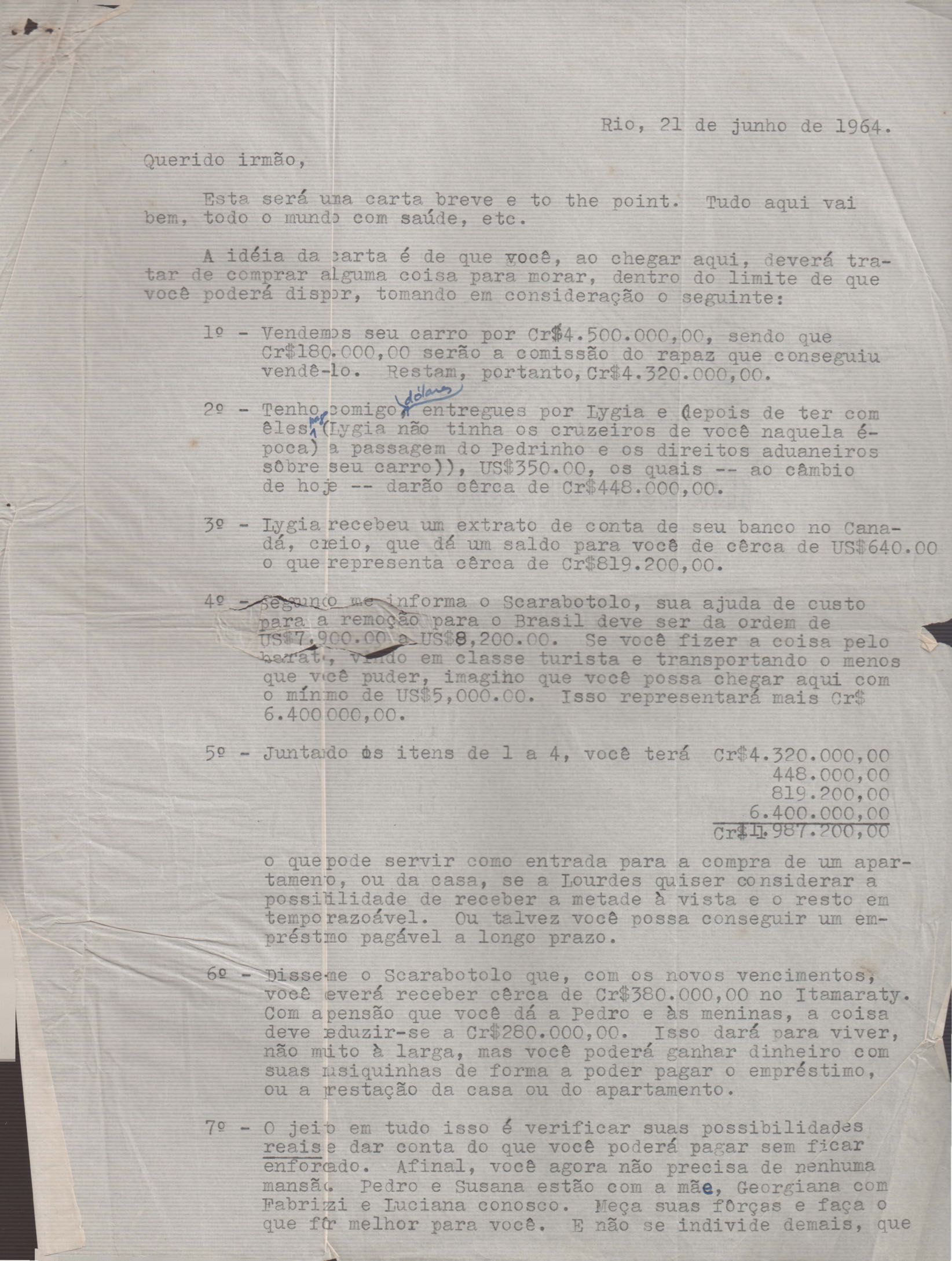 Notícias sobre a vida familiar. Considerações a respeito de pendências a serem resolvidas por VM. Comentário sobre a vida particular de seu irmão, Helius, e sobre a crise nos EUA durante a Guerra Fria. Felicitações pelo aniversário de VM. Comentários sobre o falecimento de seus pais, Clodoaldo Pereira da Silva Moraes e Lydia Cruz de Moraes. Notícias sobre o retorno de VM ao Brasil. Comentário sobre as obras Orfeu da Conceição e Poesia de carnaval e sobre amigos de VM: Aníbal Machado, Ênio da Silveira, Haroldo Tapajós, Irineu Garcia, John Mc Dowell, Mário Cabral, Maurício Fernandes, Otávio de Faria, Rodrigo Goulart, Pedro Nava, Tom Jobim entre outros. Comentário a respeito do livro [Caminho para a distância] voltar para o prelo. Menção à produção de um conto, "A lágrima", um soneto, "Judeu errante", e os poemas "Os inconsoláveis", "O bom-pastor", "A retirada", "A árvore da montanha" e "Desejo". Recomendações acerca de livros deixados por VM para serem enviados a Hecila Rodrigues de Brito. Solicitação para que Laetitia Cruz de Moraes leia o "Registro literário", de João Ribeiro, no Jornal do Brasil, e envie as críticas sobre o livro de VM. Pedido de comentário sobre os filmes: Caminho da vida, Cântico dos cânticos, Onde a terra acaba e The stranger’s return, do diretor King Vidor. Pedido de envio de algumas letras de músicas em inglês e valsas americanas. Preocupação a respeito das investidas em química, de seu irmão Helius de Moraes. Felicitações pelos 18 anos de Laetitia Cruz de Moraes. Referência a várias pessoas: Aníbal Machado, Antônia, Antônio Maria, Carlos Leão, Carlos Lacerda, Cristiano Machado, Décio de Moura, Fernando Filpo, Fernando Sabino, Getúlio Vargas, Helius de Moraes, Jane Russel, Joan Crawford, João Araújo Castro, Jorge Carvalho e Silva, Jorge Vargas de Andrade, Juan de La Cruz, Lydia Cruz de Moraes, Lygia Cruz de Moraes, Lúcia Proença Vargas, Maria Macedo Soares, Mário Cabral, Mário da Câmara, Mário Fernandes, Otávio de Faria, Paulo Mendes Campos, Paulo Soledade, Prudente de Morais Neto, Susana de Moraes Feinberg e Vinicius da Veiga. Lembranças a amigos e familiares. Considerações a respeito da infância. Manifestação de apoio à irmã, Laetitia Cruz de Moraes. Comentários sobre o pai, Clodoaldo Pereira da Silva Moraes. Notícias sobre o estado de saúde de VM. Referência a dois poemas escritos na Cachoeira de Maromba, em Itatiaia: "A queda" e "Legião dos úrias". Na carta de 4 nov. 1938, VM faz considerações a respeito de Beatriz de Azevedo de Mello de Moraes e fala sobre o seu casamento por procuração. Pedido de segredo absoluto sobre o assunto. Comentário sobre os estudos para o concurso do Itamaraty. Notícias sobre a gravidez de Tati de Moraes. Pedido de favor referente a assuntos bancários. Envio de procurações para os futuros recebimentos de salários de VM. Notícias sobre sua presença em festivais. Nomeação de VM para Secretário Geral da Comissão de Organização do I Festival de Cinema do Brasil. Felicitações pelo aniversário de seu pai, Clodoaldo Pereira da Silva Moraes. Notícias sobre seu trabalho. Recomendações sobre a publicação de artigos seus no Diário Carioca. Notícias sobre seu retorno ao Brasil. Intenção de levar a família para visitá-lo em Paris. Solicitação de despacho de objetos pessoais pelo Itamaraty. Sugestão de poemas seus para serem editados por Rubem Braga: "A legião dos úrias", "Ausência", "Ariana, a mulher", "A máscara da noite", "O cemitério na madrugada", "O desespero da piedade", "Elegia desesperada", "A vida vivida", "O tempo nos parques", "Balanço do filho morto", "Balada do Mangue", "O poeta e a lua", "Mensagem à poesia", "Poética", "Soneto de fidelidade", "Soneto de separação", "O dia da criação", "O riso" e "Balada dos mortos dos campos de concentração". Pedido de auxílio para resolver problemas bancários. Notícias sobre o programa feito para o Rio de Janeiro e São Paulo, com Sacha Gordine e Albert Camus, para divulgação do filme Orfeu negro. Recomendações a respeito de discos novos gravados que precisam ser registrados na SBACEM: "Bom dia tristeza", que Aracy de Almeida gravou, e várias gravações novas de "Se todos fossem iguais a você". Solicitação de envio dos poemas "Elegia da paz" e "Desastre de Lionel Marmier". Notícia do desaparecimento do Roteiro lírico e sentimental da cidade do Rio de Janeiro. Pedido de auxílio a Sette Câmara para ser removido para outro posto do Itamaraty, em Buenos Aires, Montevidéu ou Santiago. Referência a Claudio Santoro, para fazer uma ópera com o Orfeu da Conceição. Notícias de mudança para Montevidéu em 23 ago. 1957.