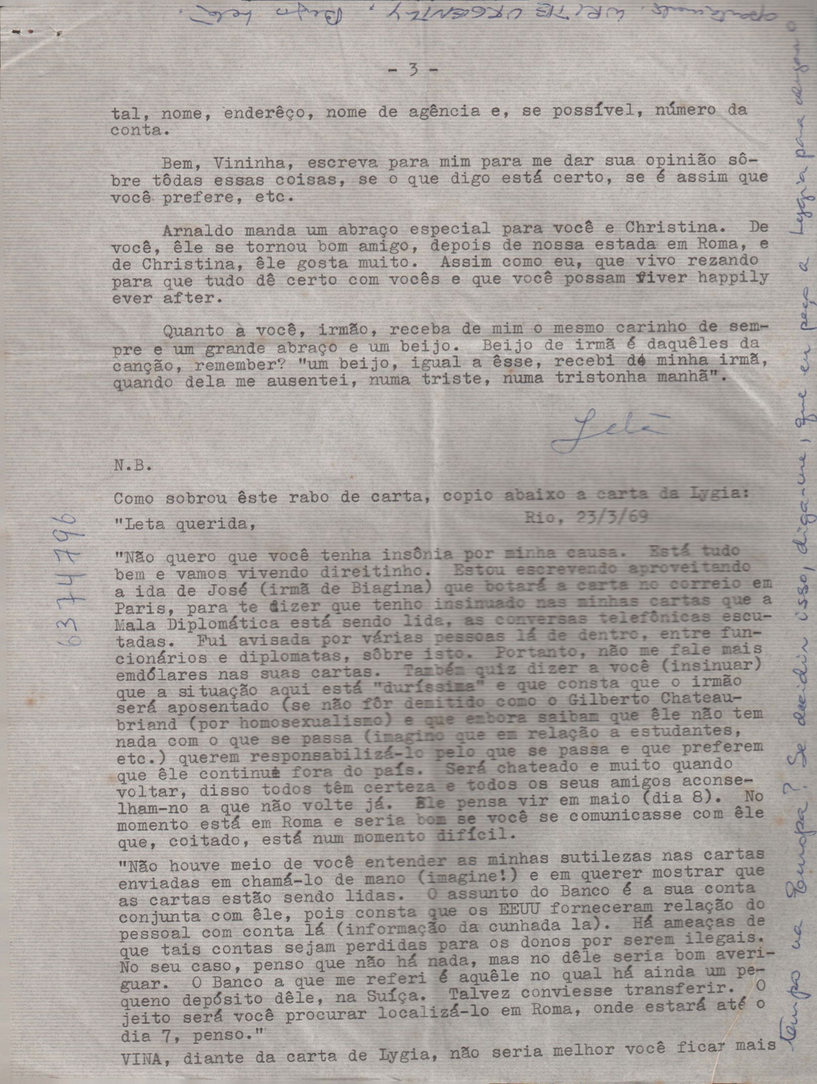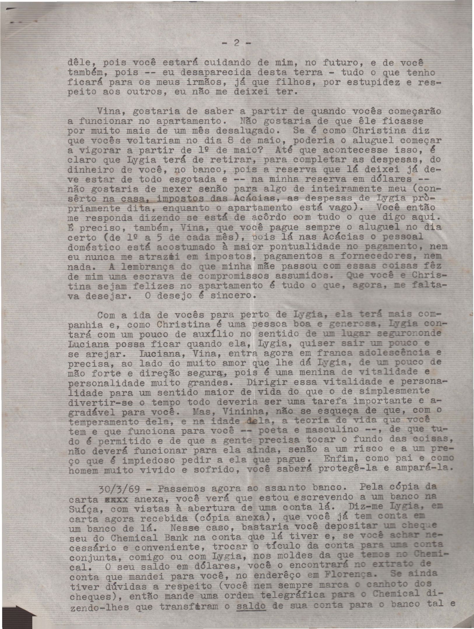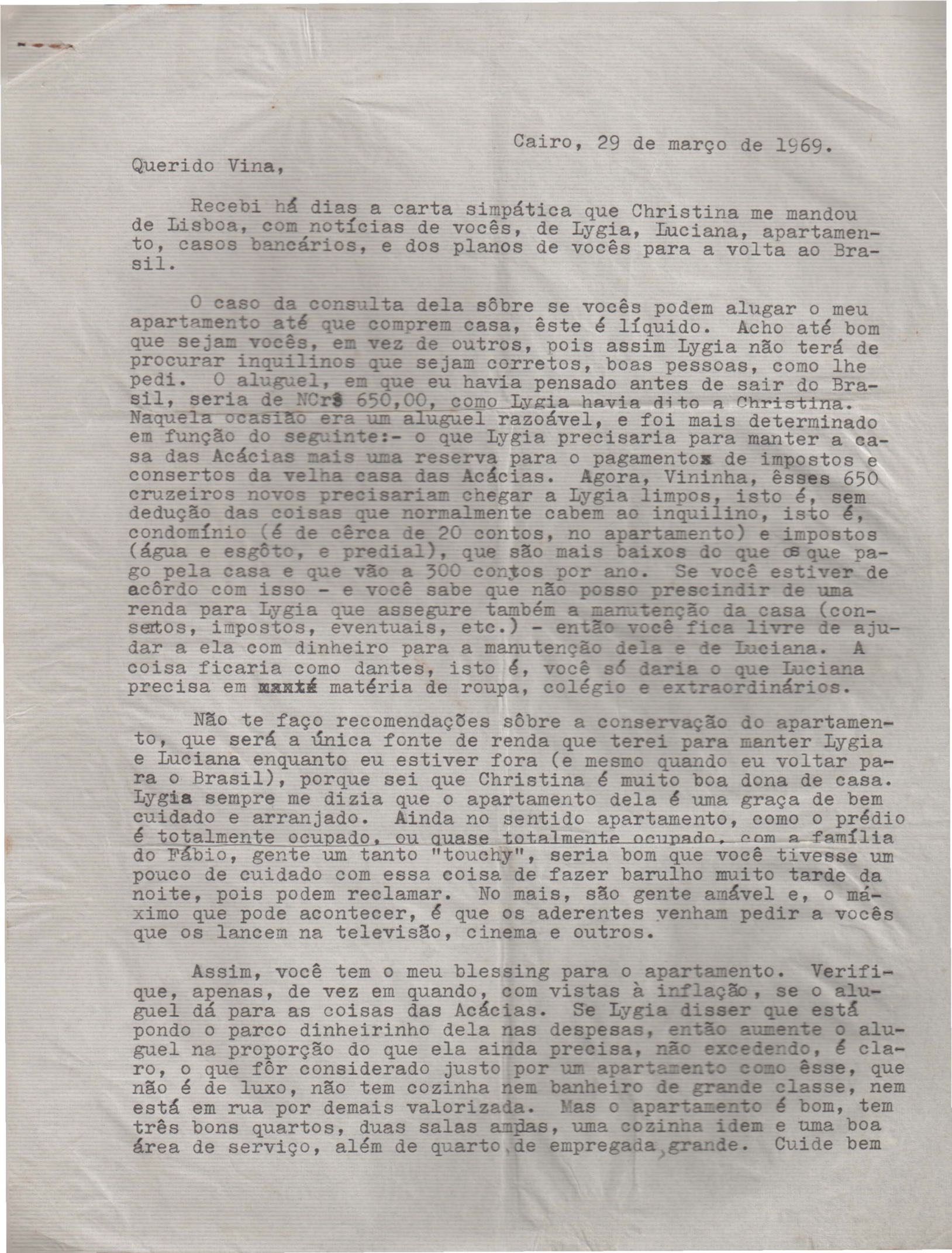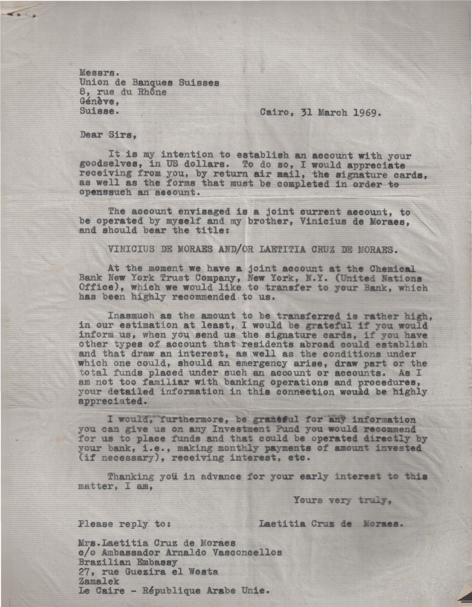 Notícias sobre a vida familiar. Considerações a respeito de pendências a serem resolvidas por VM. Comentário sobre a vida particular de seu irmão, Helius, e sobre a crise nos EUA durante a Guerra Fria. Felicitações pelo aniversário de VM. Comentários sobre o falecimento de seus pais, Clodoaldo Pereira da Silva Moraes e Lydia Cruz de Moraes. Notícias sobre o retorno de VM ao Brasil. Comentário sobre as obras Orfeu da Conceição e Poesia de carnaval e sobre amigos de VM: Aníbal Machado, Ênio da Silveira, Haroldo Tapajós, Irineu Garcia, John Mc Dowell, Mário Cabral, Maurício Fernandes, Otávio de Faria, Rodrigo Goulart, Pedro Nava, Tom Jobim entre outros. Comentário a respeito do livro [Caminho para a distância] voltar para o prelo. Menção à produção de um conto, "A lágrima", um soneto, "Judeu errante", e os poemas "Os inconsoláveis", "O bom-pastor", "A retirada", "A árvore da montanha" e "Desejo". Recomendações acerca de livros deixados por VM para serem enviados a Hecila Rodrigues de Brito. Solicitação para que Laetitia Cruz de Moraes leia o "Registro literário", de João Ribeiro, no Jornal do Brasil, e envie as críticas sobre o livro de VM. Pedido de comentário sobre os filmes: Caminho da vida, Cântico dos cânticos, Onde a terra acaba e The stranger’s return, do diretor King Vidor. Pedido de envio de algumas letras de músicas em inglês e valsas americanas. Preocupação a respeito das investidas em química, de seu irmão Helius de Moraes. Felicitações pelos 18 anos de Laetitia Cruz de Moraes. Referência a várias pessoas: Aníbal Machado, Antônia, Antônio Maria, Carlos Leão, Carlos Lacerda, Cristiano Machado, Décio de Moura, Fernando Filpo, Fernando Sabino, Getúlio Vargas, Helius de Moraes, Jane Russel, Joan Crawford, João Araújo Castro, Jorge Carvalho e Silva, Jorge Vargas de Andrade, Juan de La Cruz, Lydia Cruz de Moraes, Lygia Cruz de Moraes, Lúcia Proença Vargas, Maria Macedo Soares, Mário Cabral, Mário da Câmara, Mário Fernandes, Otávio de Faria, Paulo Mendes Campos, Paulo Soledade, Prudente de Morais Neto, Susana de Moraes Feinberg e Vinicius da Veiga. Lembranças a amigos e familiares. Considerações a respeito da infância. Manifestação de apoio à irmã, Laetitia Cruz de Moraes. Comentários sobre o pai, Clodoaldo Pereira da Silva Moraes. Notícias sobre o estado de saúde de VM. Referência a dois poemas escritos na Cachoeira de Maromba, em Itatiaia: "A queda" e "Legião dos úrias". Na carta de 4 nov. 1938, VM faz considerações a respeito de Beatriz de Azevedo de Mello de Moraes e fala sobre o seu casamento por procuração. Pedido de segredo absoluto sobre o assunto. Comentário sobre os estudos para o concurso do Itamaraty. Notícias sobre a gravidez de Tati de Moraes. Pedido de favor referente a assuntos bancários. Envio de procurações para os futuros recebimentos de salários de VM. Notícias sobre sua presença em festivais. Nomeação de VM para Secretário Geral da Comissão de Organização do I Festival de Cinema do Brasil. Felicitações pelo aniversário de seu pai, Clodoaldo Pereira da Silva Moraes. Notícias sobre seu trabalho. Recomendações sobre a publicação de artigos seus no Diário Carioca. Notícias sobre seu retorno ao Brasil. Intenção de levar a família para visitá-lo em Paris. Solicitação de despacho de objetos pessoais pelo Itamaraty. Sugestão de poemas seus para serem editados por Rubem Braga: "A legião dos úrias", "Ausência", "Ariana, a mulher", "A máscara da noite", "O cemitério na madrugada", "O desespero da piedade", "Elegia desesperada", "A vida vivida", "O tempo nos parques", "Balanço do filho morto", "Balada do Mangue", "O poeta e a lua", "Mensagem à poesia", "Poética", "Soneto de fidelidade", "Soneto de separação", "O dia da criação", "O riso" e "Balada dos mortos dos campos de concentração". Pedido de auxílio para resolver problemas bancários. Notícias sobre o programa feito para o Rio de Janeiro e São Paulo, com Sacha Gordine e Albert Camus, para divulgação do filme Orfeu negro. Recomendações a respeito de discos novos gravados que precisam ser registrados na SBACEM: "Bom dia tristeza", que Aracy de Almeida gravou, e várias gravações novas de "Se todos fossem iguais a você". Solicitação de envio dos poemas "Elegia da paz" e "Desastre de Lionel Marmier". Notícia do desaparecimento do Roteiro lírico e sentimental da cidade do Rio de Janeiro. Pedido de auxílio a Sette Câmara para ser removido para outro posto do Itamaraty, em Buenos Aires, Montevidéu ou Santiago. Referência a Claudio Santoro, para fazer uma ópera com o Orfeu da Conceição. Notícias de mudança para Montevidéu em 23 ago. 1957.