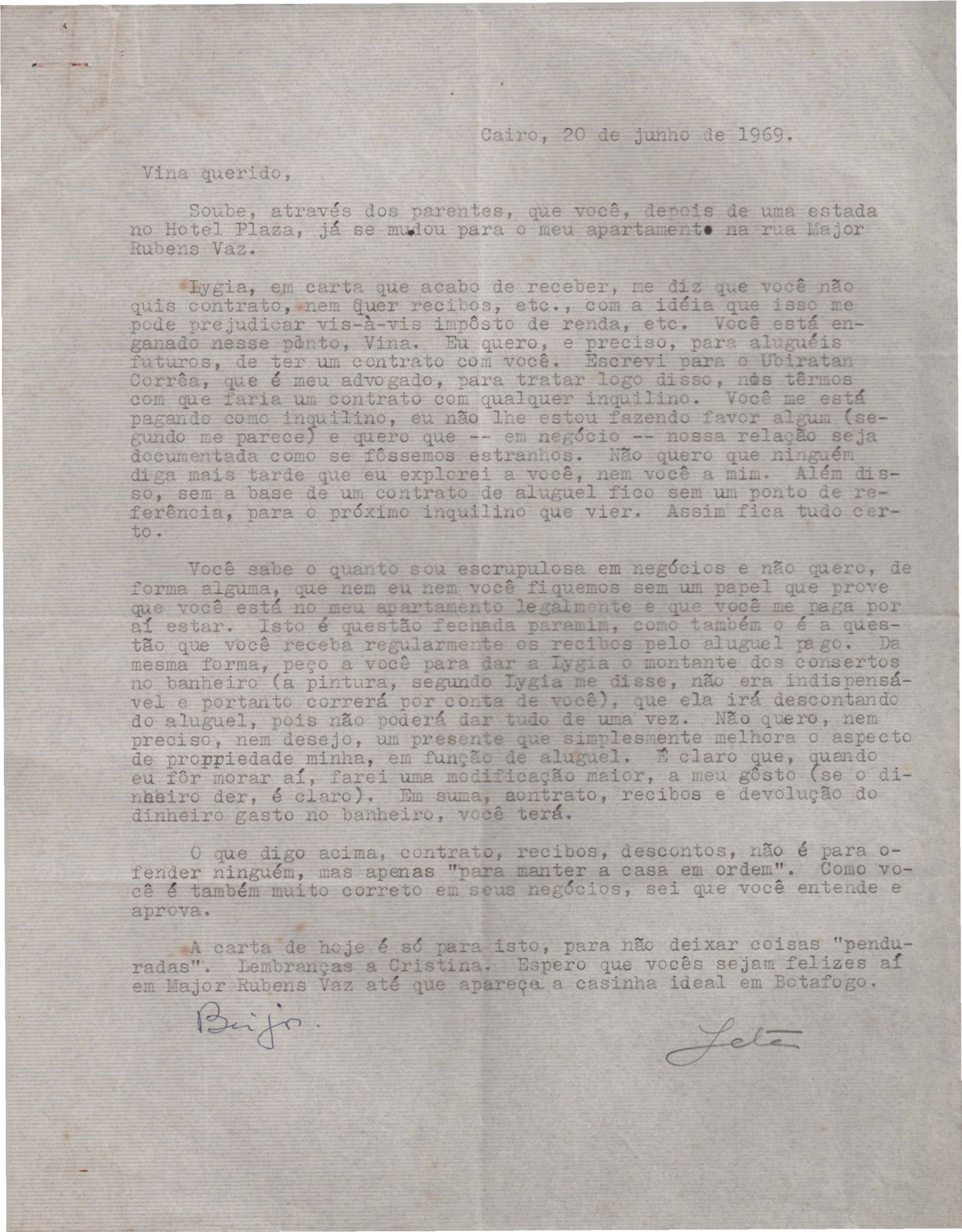 Notícias sobre a vida familiar. Considerações a respeito de pendências a serem resolvidas por VM. Comentário sobre a vida particular de seu irmão, Helius, e sobre a crise nos EUA durante a Guerra Fria. Felicitações pelo aniversário de VM. Comentários sobre o falecimento de seus pais, Clodoaldo Pereira da Silva Moraes e Lydia Cruz de Moraes. Notícias sobre o retorno de VM ao Brasil. Comentário sobre as obras Orfeu da Conceição e Poesia de carnaval e sobre amigos de VM: Aníbal Machado, Ênio da Silveira, Haroldo Tapajós, Irineu Garcia, John Mc Dowell, Mário Cabral, Maurício Fernandes, Otávio de Faria, Rodrigo Goulart, Pedro Nava, Tom Jobim entre outros. Comentário a respeito do livro [Caminho para a distância] voltar para o prelo. Menção à produção de um conto, "A lágrima", um soneto, "Judeu errante", e os poemas "Os inconsoláveis", "O bom-pastor", "A retirada", "A árvore da montanha" e "Desejo". Recomendações acerca de livros deixados por VM para serem enviados a Hecila Rodrigues de Brito. Solicitação para que Laetitia Cruz de Moraes leia o "Registro literário", de João Ribeiro, no Jornal do Brasil, e envie as críticas sobre o livro de VM. Pedido de comentário sobre os filmes: Caminho da vida, Cântico dos cânticos, Onde a terra acaba e The stranger’s return, do diretor King Vidor. Pedido de envio de algumas letras de músicas em inglês e valsas americanas. Preocupação a respeito das investidas em química, de seu irmão Helius de Moraes. Felicitações pelos 18 anos de Laetitia Cruz de Moraes. Referência a várias pessoas: Aníbal Machado, Antônia, Antônio Maria, Carlos Leão, Carlos Lacerda, Cristiano Machado, Décio de Moura, Fernando Filpo, Fernando Sabino, Getúlio Vargas, Helius de Moraes, Jane Russel, Joan Crawford, João Araújo Castro, Jorge Carvalho e Silva, Jorge Vargas de Andrade, Juan de La Cruz, Lydia Cruz de Moraes, Lygia Cruz de Moraes, Lúcia Proença Vargas, Maria Macedo Soares, Mário Cabral, Mário da Câmara, Mário Fernandes, Otávio de Faria, Paulo Mendes Campos, Paulo Soledade, Prudente de Morais Neto, Susana de Moraes Feinberg e Vinicius da Veiga. Lembranças a amigos e familiares. Considerações a respeito da infância. Manifestação de apoio à irmã, Laetitia Cruz de Moraes. Comentários sobre o pai, Clodoaldo Pereira da Silva Moraes. Notícias sobre o estado de saúde de VM. Referência a dois poemas escritos na Cachoeira de Maromba, em Itatiaia: "A queda" e "Legião dos úrias". Na carta de 4 nov. 1938, VM faz considerações a respeito de Beatriz de Azevedo de Mello de Moraes e fala sobre o seu casamento por procuração. Pedido de segredo absoluto sobre o assunto. Comentário sobre os estudos para o concurso do Itamaraty. Notícias sobre a gravidez de Tati de Moraes. Pedido de favor referente a assuntos bancários. Envio de procurações para os futuros recebimentos de salários de VM. Notícias sobre sua presença em festivais. Nomeação de VM para Secretário Geral da Comissão de Organização do I Festival de Cinema do Brasil. Felicitações pelo aniversário de seu pai, Clodoaldo Pereira da Silva Moraes. Notícias sobre seu trabalho. Recomendações sobre a publicação de artigos seus no Diário Carioca. Notícias sobre seu retorno ao Brasil. Intenção de levar a família para visitá-lo em Paris. Solicitação de despacho de objetos pessoais pelo Itamaraty. Sugestão de poemas seus para serem editados por Rubem Braga: "A legião dos úrias", "Ausência", "Ariana, a mulher", "A máscara da noite", "O cemitério na madrugada", "O desespero da piedade", "Elegia desesperada", "A vida vivida", "O tempo nos parques", "Balanço do filho morto", "Balada do Mangue", "O poeta e a lua", "Mensagem à poesia", "Poética", "Soneto de fidelidade", "Soneto de separação", "O dia da criação", "O riso" e "Balada dos mortos dos campos de concentração". Pedido de auxílio para resolver problemas bancários. Notícias sobre o programa feito para o Rio de Janeiro e São Paulo, com Sacha Gordine e Albert Camus, para divulgação do filme Orfeu negro. Recomendações a respeito de discos novos gravados que precisam ser registrados na SBACEM: "Bom dia tristeza", que Aracy de Almeida gravou, e várias gravações novas de "Se todos fossem iguais a você". Solicitação de envio dos poemas "Elegia da paz" e "Desastre de Lionel Marmier". Notícia do desaparecimento do Roteiro lírico e sentimental da cidade do Rio de Janeiro. Pedido de auxílio a Sette Câmara para ser removido para outro posto do Itamaraty, em Buenos Aires, Montevidéu ou Santiago. Referência a Claudio Santoro, para fazer uma ópera com o Orfeu da Conceição. Notícias de mudança para Montevidéu em 23 ago. 1957.