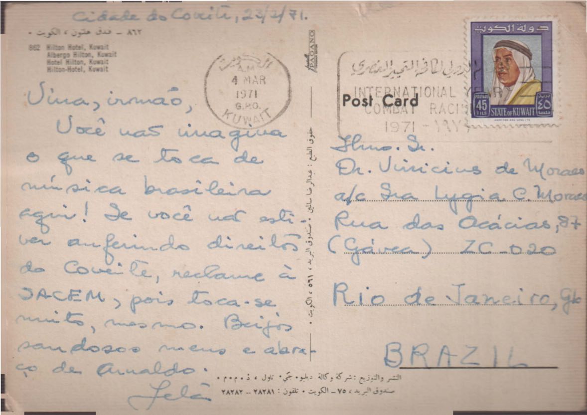 Notícias sobre a vida familiar. Considerações a respeito de pendências a serem resolvidas por VM. Comentário sobre a vida particular de seu irmão, Helius, e sobre a crise nos EUA durante a Guerra Fria. Felicitações pelo aniversário de VM. Comentários sobre o falecimento de seus pais, Clodoaldo Pereira da Silva Moraes e Lydia Cruz de Moraes. Notícias sobre o retorno de VM ao Brasil. Comentário sobre as obras Orfeu da Conceição e Poesia de carnaval e sobre amigos de VM: Aníbal Machado, Ênio da Silveira, Haroldo Tapajós, Irineu Garcia, John Mc Dowell, Mário Cabral, Maurício Fernandes, Otávio de Faria, Rodrigo Goulart, Pedro Nava, Tom Jobim entre outros. Comentário a respeito do livro [Caminho para a distância] voltar para o prelo. Menção à produção de um conto, "A lágrima", um soneto, "Judeu errante", e os poemas "Os inconsoláveis", "O bom-pastor", "A retirada", "A árvore da montanha" e "Desejo". Recomendações acerca de livros deixados por VM para serem enviados a Hecila Rodrigues de Brito. Solicitação para que Laetitia Cruz de Moraes leia o "Registro literário", de João Ribeiro, no Jornal do Brasil, e envie as críticas sobre o livro de VM. Pedido de comentário sobre os filmes: Caminho da vida, Cântico dos cânticos, Onde a terra acaba e The stranger’s return, do diretor King Vidor. Pedido de envio de algumas letras de músicas em inglês e valsas americanas. Preocupação a respeito das investidas em química, de seu irmão Helius de Moraes. Felicitações pelos 18 anos de Laetitia Cruz de Moraes. Referência a várias pessoas: Aníbal Machado, Antônia, Antônio Maria, Carlos Leão, Carlos Lacerda, Cristiano Machado, Décio de Moura, Fernando Filpo, Fernando Sabino, Getúlio Vargas, Helius de Moraes, Jane Russel, Joan Crawford, João Araújo Castro, Jorge Carvalho e Silva, Jorge Vargas de Andrade, Juan de La Cruz, Lydia Cruz de Moraes, Lygia Cruz de Moraes, Lúcia Proença Vargas, Maria Macedo Soares, Mário Cabral, Mário da Câmara, Mário Fernandes, Otávio de Faria, Paulo Mendes Campos, Paulo Soledade, Prudente de Morais Neto, Susana de Moraes Feinberg e Vinicius da Veiga. Lembranças a amigos e familiares. Considerações a respeito da infância. Manifestação de apoio à irmã, Laetitia Cruz de Moraes. Comentários sobre o pai, Clodoaldo Pereira da Silva Moraes. Notícias sobre o estado de saúde de VM. Referência a dois poemas escritos na Cachoeira de Maromba, em Itatiaia: "A queda" e "Legião dos úrias". Na carta de 4 nov. 1938, VM faz considerações a respeito de Beatriz de Azevedo de Mello de Moraes e fala sobre o seu casamento por procuração. Pedido de segredo absoluto sobre o assunto. Comentário sobre os estudos para o concurso do Itamaraty. Notícias sobre a gravidez de Tati de Moraes. Pedido de favor referente a assuntos bancários. Envio de procurações para os futuros recebimentos de salários de VM. Notícias sobre sua presença em festivais. Nomeação de VM para Secretário Geral da Comissão de Organização do I Festival de Cinema do Brasil. Felicitações pelo aniversário de seu pai, Clodoaldo Pereira da Silva Moraes. Notícias sobre seu trabalho. Recomendações sobre a publicação de artigos seus no Diário Carioca. Notícias sobre seu retorno ao Brasil. Intenção de levar a família para visitá-lo em Paris. Solicitação de despacho de objetos pessoais pelo Itamaraty. Sugestão de poemas seus para serem editados por Rubem Braga: "A legião dos úrias", "Ausência", "Ariana, a mulher", "A máscara da noite", "O cemitério na madrugada", "O desespero da piedade", "Elegia desesperada", "A vida vivida", "O tempo nos parques", "Balanço do filho morto", "Balada do Mangue", "O poeta e a lua", "Mensagem à poesia", "Poética", "Soneto de fidelidade", "Soneto de separação", "O dia da criação", "O riso" e "Balada dos mortos dos campos de concentração". Pedido de auxílio para resolver problemas bancários. Notícias sobre o programa feito para o Rio de Janeiro e São Paulo, com Sacha Gordine e Albert Camus, para divulgação do filme Orfeu negro. Recomendações a respeito de discos novos gravados que precisam ser registrados na SBACEM: "Bom dia tristeza", que Aracy de Almeida gravou, e várias gravações novas de "Se todos fossem iguais a você". Solicitação de envio dos poemas "Elegia da paz" e "Desastre de Lionel Marmier". Notícia do desaparecimento do Roteiro lírico e sentimental da cidade do Rio de Janeiro. Pedido de auxílio a Sette Câmara para ser removido para outro posto do Itamaraty, em Buenos Aires, Montevidéu ou Santiago. Referência a Claudio Santoro, para fazer uma ópera com o Orfeu da Conceição. Notícias de mudança para Montevidéu em 23 ago. 1957.