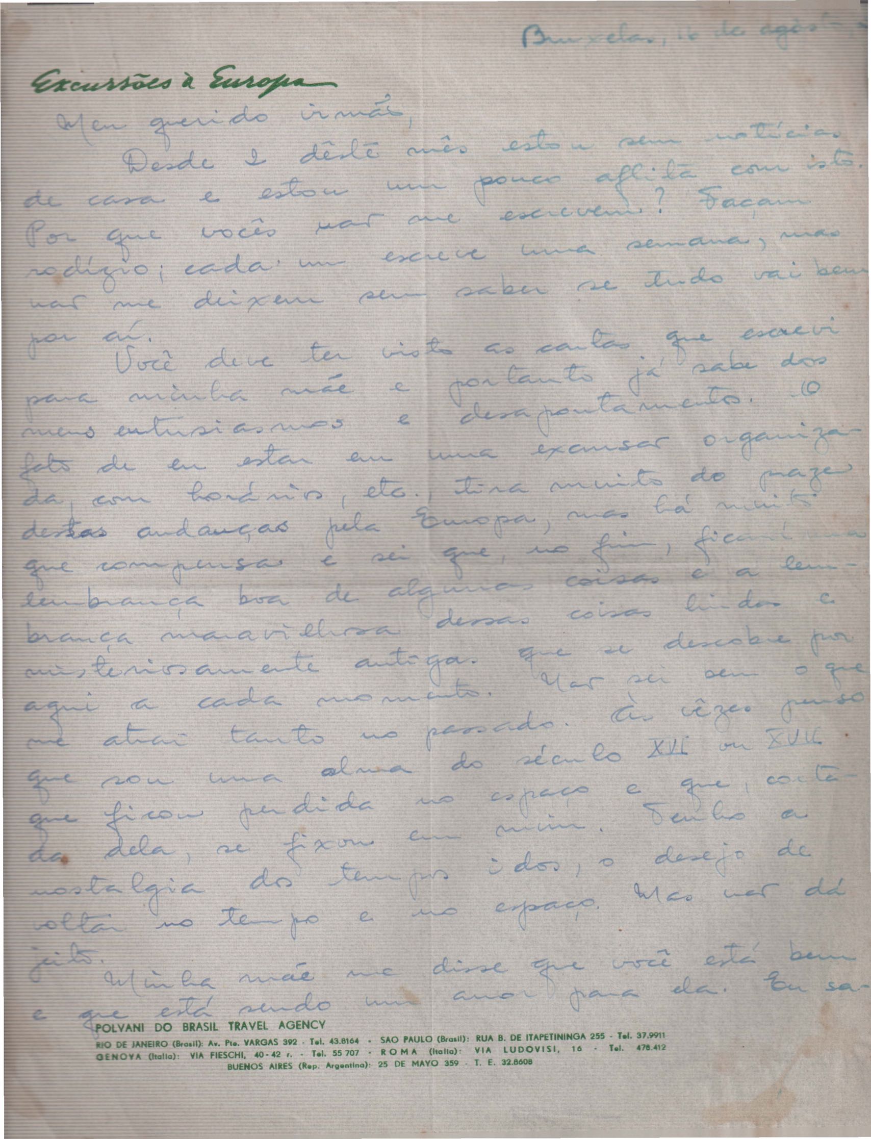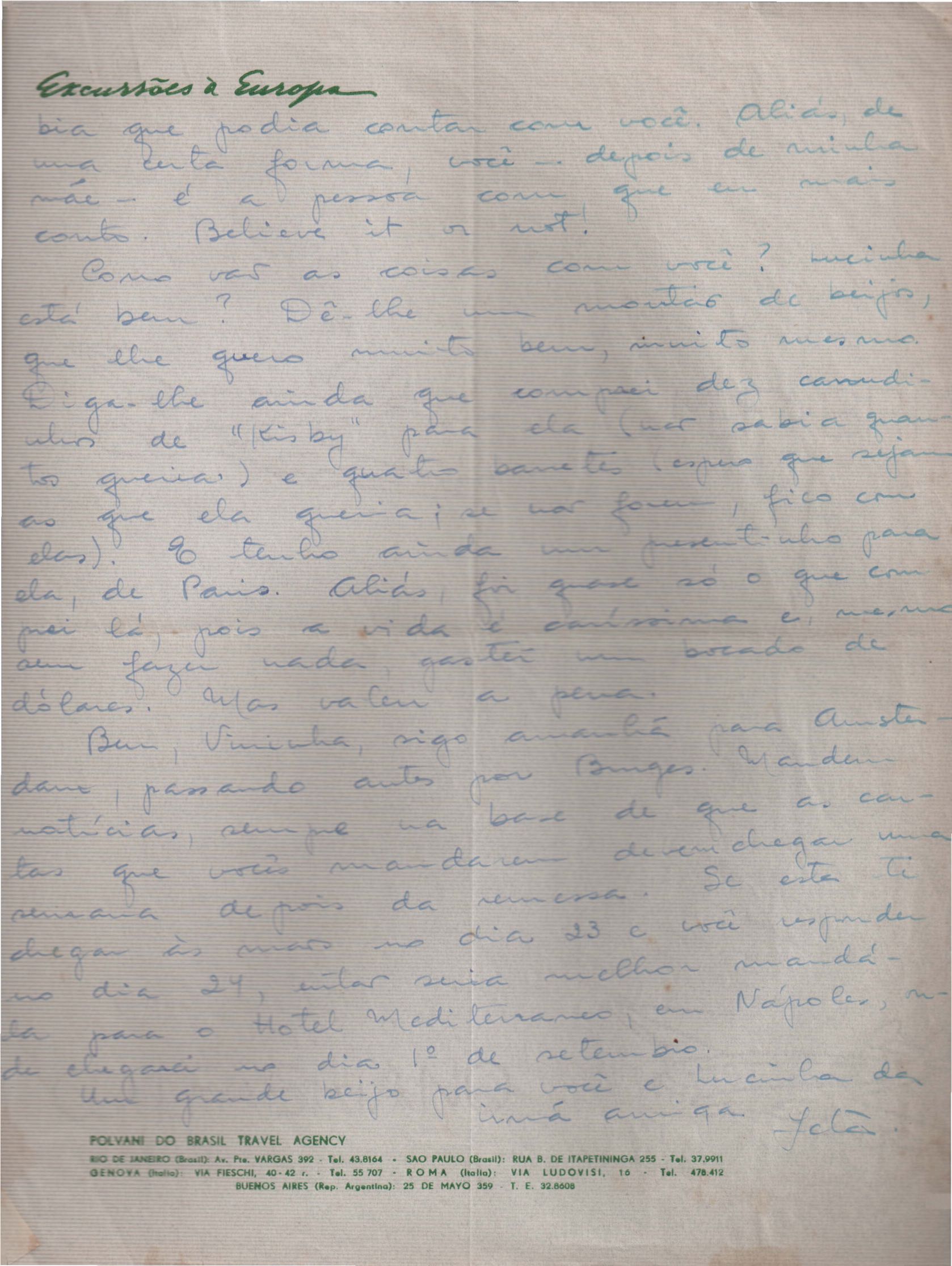 Notícias sobre a vida familiar. Considerações a respeito de pendências a serem resolvidas por VM. Comentário sobre a vida particular de seu irmão, Helius, e sobre a crise nos EUA durante a Guerra Fria. Felicitações pelo aniversário de VM. Comentários sobre o falecimento de seus pais, Clodoaldo Pereira da Silva Moraes e Lydia Cruz de Moraes. Notícias sobre o retorno de VM ao Brasil. Comentário sobre as obras Orfeu da Conceição e Poesia de carnaval e sobre amigos de VM: Aníbal Machado, Ênio da Silveira, Haroldo Tapajós, Irineu Garcia, John Mc Dowell, Mário Cabral, Maurício Fernandes, Otávio de Faria, Rodrigo Goulart, Pedro Nava, Tom Jobim entre outros. Comentário a respeito do livro [Caminho para a distância] voltar para o prelo. Menção à produção de um conto, "A lágrima", um soneto, "Judeu errante", e os poemas "Os inconsoláveis", "O bom-pastor", "A retirada", "A árvore da montanha" e "Desejo". Recomendações acerca de livros deixados por VM para serem enviados a Hecila Rodrigues de Brito. Solicitação para que Laetitia Cruz de Moraes leia o "Registro literário", de João Ribeiro, no Jornal do Brasil, e envie as críticas sobre o livro de VM. Pedido de comentário sobre os filmes: Caminho da vida, Cântico dos cânticos, Onde a terra acaba e The stranger’s return, do diretor King Vidor. Pedido de envio de algumas letras de músicas em inglês e valsas americanas. Preocupação a respeito das investidas em química, de seu irmão Helius de Moraes. Felicitações pelos 18 anos de Laetitia Cruz de Moraes. Referência a várias pessoas: Aníbal Machado, Antônia, Antônio Maria, Carlos Leão, Carlos Lacerda, Cristiano Machado, Décio de Moura, Fernando Filpo, Fernando Sabino, Getúlio Vargas, Helius de Moraes, Jane Russel, Joan Crawford, João Araújo Castro, Jorge Carvalho e Silva, Jorge Vargas de Andrade, Juan de La Cruz, Lydia Cruz de Moraes, Lygia Cruz de Moraes, Lúcia Proença Vargas, Maria Macedo Soares, Mário Cabral, Mário da Câmara, Mário Fernandes, Otávio de Faria, Paulo Mendes Campos, Paulo Soledade, Prudente de Morais Neto, Susana de Moraes Feinberg e Vinicius da Veiga. Lembranças a amigos e familiares. Considerações a respeito da infância. Manifestação de apoio à irmã, Laetitia Cruz de Moraes. Comentários sobre o pai, Clodoaldo Pereira da Silva Moraes. Notícias sobre o estado de saúde de VM. Referência a dois poemas escritos na Cachoeira de Maromba, em Itatiaia: "A queda" e "Legião dos úrias". Na carta de 4 nov. 1938, VM faz considerações a respeito de Beatriz de Azevedo de Mello de Moraes e fala sobre o seu casamento por procuração. Pedido de segredo absoluto sobre o assunto. Comentário sobre os estudos para o concurso do Itamaraty. Notícias sobre a gravidez de Tati de Moraes. Pedido de favor referente a assuntos bancários. Envio de procurações para os futuros recebimentos de salários de VM. Notícias sobre sua presença em festivais. Nomeação de VM para Secretário Geral da Comissão de Organização do I Festival de Cinema do Brasil. Felicitações pelo aniversário de seu pai, Clodoaldo Pereira da Silva Moraes. Notícias sobre seu trabalho. Recomendações sobre a publicação de artigos seus no Diário Carioca. Notícias sobre seu retorno ao Brasil. Intenção de levar a família para visitá-lo em Paris. Solicitação de despacho de objetos pessoais pelo Itamaraty. Sugestão de poemas seus para serem editados por Rubem Braga: "A legião dos úrias", "Ausência", "Ariana, a mulher", "A máscara da noite", "O cemitério na madrugada", "O desespero da piedade", "Elegia desesperada", "A vida vivida", "O tempo nos parques", "Balanço do filho morto", "Balada do Mangue", "O poeta e a lua", "Mensagem à poesia", "Poética", "Soneto de fidelidade", "Soneto de separação", "O dia da criação", "O riso" e "Balada dos mortos dos campos de concentração". Pedido de auxílio para resolver problemas bancários. Notícias sobre o programa feito para o Rio de Janeiro e São Paulo, com Sacha Gordine e Albert Camus, para divulgação do filme Orfeu negro. Recomendações a respeito de discos novos gravados que precisam ser registrados na SBACEM: "Bom dia tristeza", que Aracy de Almeida gravou, e várias gravações novas de "Se todos fossem iguais a você". Solicitação de envio dos poemas "Elegia da paz" e "Desastre de Lionel Marmier". Notícia do desaparecimento do Roteiro lírico e sentimental da cidade do Rio de Janeiro. Pedido de auxílio a Sette Câmara para ser removido para outro posto do Itamaraty, em Buenos Aires, Montevidéu ou Santiago. Referência a Claudio Santoro, para fazer uma ópera com o Orfeu da Conceição. Notícias de mudança para Montevidéu em 23 ago. 1957.