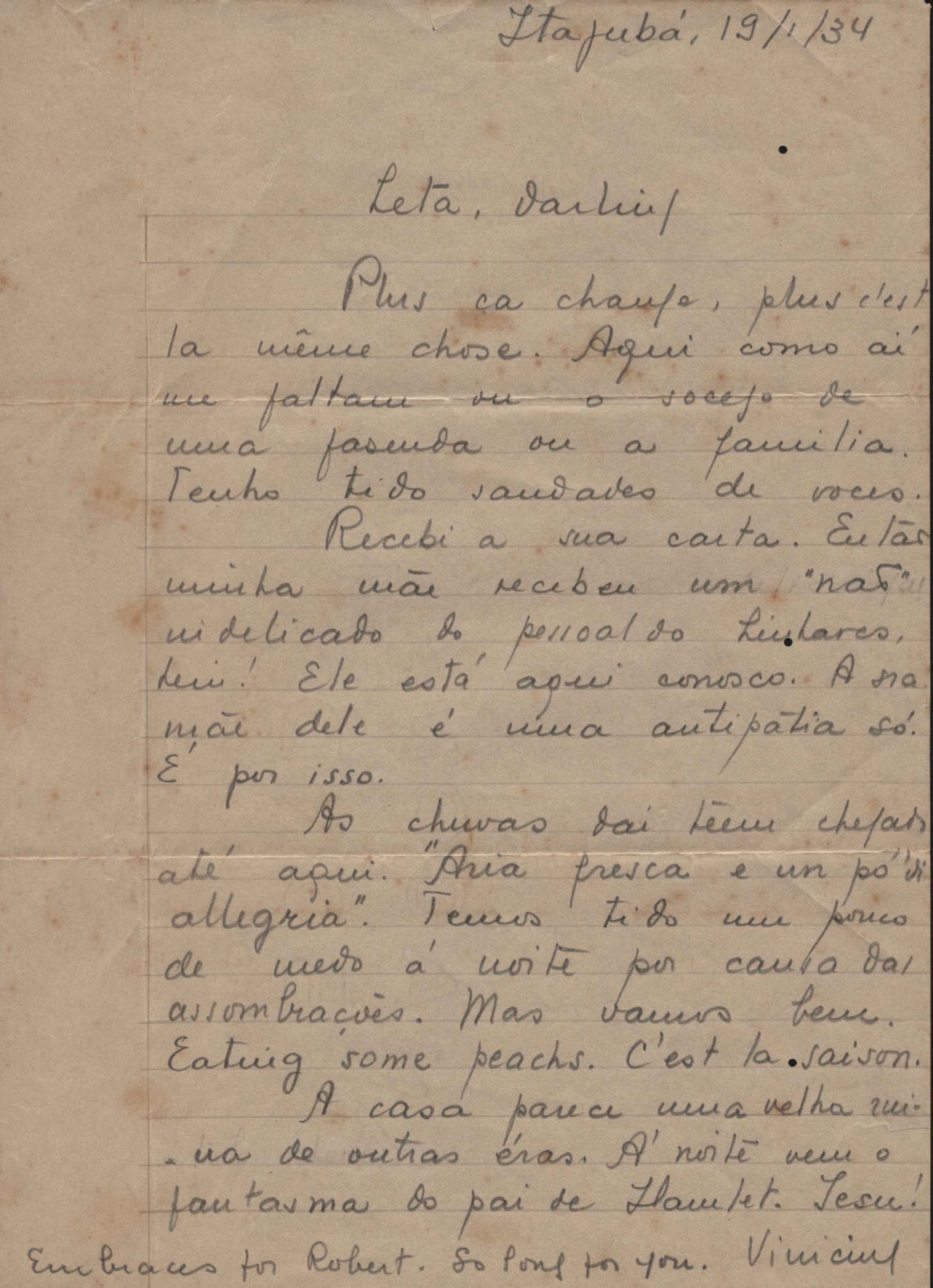 Correspondências entre VM e sua irmã, Laetitia Cruz de Moraes. Há cartas manchadas e sem data.